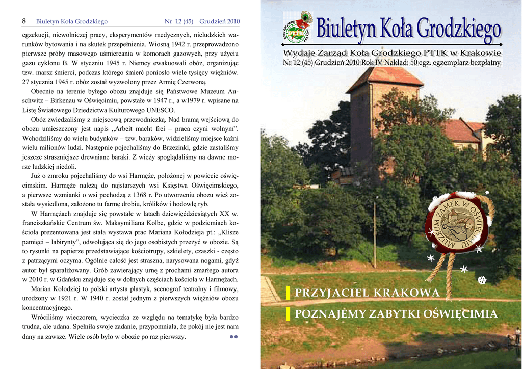 8 Biuletyn Koła Grodzkiego Nr 12 (45) Grudzień 2010 egzekucji, niewolniczej pracy, eksperymentów medycznych, nieludzkich warunków bytowania i na skutek przepełnienia. Wiosną 1942 r. przeprowadzono pierwsze próby masowego uśmiercania w komorach gazowych, przy uŜyciu gazu cyklonu B. W styczniu 1945 r. Niemcy ewakuowali obóz, organizując tzw. marsz śmierci, podczas którego śmierć poniosło wiele tysięcy więźniów. 27 stycznia 1945 r. obóz został wyzwolony przez Armię Czerwoną. Obecnie na terenie byłego obozu znajduje się Państwowe Muzeum Auschwitz – Birkenau w Oświęcimiu, powstałe w 1947 r., a w1979 r. wpisane na Listę Światowego Dziedzictwa Kulturowego UNESCO. Obóz zwiedzaliśmy z miejscową przewodniczką. Nad bramą wejściową do obozu umieszczony jest napis „Arbeit macht frei – praca czyni wolnym”. Wchodziliśmy do wielu budynków – tzw. baraków, widzieliśmy miejsce kaźni wielu milionów ludzi. Następnie pojechaliśmy do Brzezinki, gdzie zastaliśmy jeszcze straszniejsze drewniane baraki. Z wieŜy spoglądaliśmy na dawne morze ludzkiej niedoli. JuŜ o zmroku pojechaliśmy do wsi HarmęŜe, połoŜonej w powiecie oświęcimskim. HarmęŜe naleŜą do najstarszych wsi Księstwa Oświęcimskiego, a pierwsze wzmianki o wsi pochodzą z 1368 r. Po utworzeniu obozu wieś została wysiedlona, załoŜono tu farmę drobiu, królików i hodowlę ryb. W HarmęŜach znajduje się powstałe w latach dziewięćdziesiątych XX w. franciszkańskie Centrum św. Maksymiliana Kolbe, gdzie w podziemiach kościoła prezentowana jest stała wystawa prac Mariana Kołodzieja pt.: „Klisze pamięci – labirynty”, odwołująca się do jego osobistych przeŜyć w obozie. Są to rysunki na papierze przedstawiające kościotrupy, szkielety, czaszki - często z patrzącymi oczyma. Ogólnie całość jest straszna, narysowana nogami, gdyŜ autor był sparaliŜowany. Grób zawierający urnę z prochami zmarłego autora w 2010 r. w Gdańsku znajduje się w dolnych częściach kościoła w HarmęŜach. Marian Kołodziej to polski artysta plastyk, scenograf teatralny i filmowy, urodzony w 1921 r. W 1940 r. został jednym z pierwszych więźniów obozu koncentracyjnego. Wróciliśmy wieczorem, wycieczka ze względu na tematykę była bardzo trudna, ale udana. Spełniła swoje zadanie, przypomniała, Ŝe pokój nie jest nam ●● dany na zawsze. Wiele osób było w obozie po raz pierwszy. ▌PRZYJACIEL KRAKOWA ▌POZNAJEMY ZABYTKI OŚWIĘCIMIA 2 Biuletyn Koła Grodzkiego W NUMERZE: ▌Zdobywamy Odznakę ▌Przyjaciela Krakowa str. 3-4 ▌Poznajemy zabytki ▌Oświęcimia str. 5-6-7-8 Biuletyn Koła Grodzkiego Nr 12 (45) Grudzień 2010 ZESPÓŁ REDAKCYJNY: Kamil Barwacz (redaktor naczelny), Krystyna Grdal, Paweł Jezioro, Wiktoria Otfinowska WSPÓŁPRACA: ElŜbieta Woźniak (fotografie) KONTAKT Z REDAKCJĄ: 31-029 Kraków, ul. Zyblikiewicza 2b z dopiskiem „Biuletyn” tel. 12 422-85-28 [email protected] OKŁADKA: Zamek w Oświęcimiu, źródło: Wikipedia NAKŁAD: 50 egzemplarzy NUMER ZAMKNIĘTO: 20 grudnia 2010r. ARCHIWALNE numery „Biuletynu” dostępne są w Bibliotece COTG PTTK, przy ul. Jagiellońskiej 6 (II piętro) oraz na stronie internetowej Koła. mail: [email protected] http://www.kologrodzkie.republika.pl Nr 12 (45) Grudzień 2010 Na dobry początek Zima kojarzy nam się ze śniegiem i mrozem, ale i z wyjazdami na narty, karmieniem łabędzi nad Wisłą i oczywiście ze świętami BoŜego Narodzenia. Choć nie wszyscy lubią zimę, to nie fot. Archiwum ma na nią innego sposobu, jak się do niej przyzwyczaić. Zima była, jest i będzie. Z zima jest jednak pewien problem. KaŜdy wie, Ŝe zima w końcu przyjdzie, ale moment ten zawsze jest zaskoczeniem. I nie tylko dla drogowców. Poza tym, Ŝadna inna poru roku nie dostarcza nam takich widoków jak rozległe górskie polany i szczyty schowane pod śnieŜną pierzyną – naprawdę piękne. Jak juŜ wspomniałem, zima to równieŜ, a moŜe przede wszystkim okres świąteczny. JuŜ od początku grudnia trwa szaleństwa zakupów i przygotowań, które szczególnie nasila się w ostatnich dniach przed Wigilią. W związku z tym Ŝyczymy wszystkim Członkom i Sympatykom Koła Grodzkiego oraz Czytelnikom „Biuletynu” zdrowych, spokojnych, spędzonych w rodzinnym gronie Świąt BoŜego Narodzenia, a w Nowym Roku spełnienia marzeń, zrealizowania planów i wszystkiego najlepszego! Do siego roku! Ka mi l B a rw acz Redaktor naczelny Nr 12 (45) Grudzień 2010 Biuletyn Koła Grodzkiego 7 kamiennej płyty – kryje ona urny z ziemią z cmentarzy wojennych we Lwowie, Katyniu, Rajsku i Proszowicach. Następnie odwiedziliśmy połoŜony na wzgórzu nad Sołą Zamek. Składa się on z XIII-wiecznej wczesno gotyckiej wieŜy obronnej, krytej dachem; dwukondygnacyjnego, podpiwniczonego budynku, wzniesionego na planie prostokąta (stare skrzydło zamku z XVI w.) i łącznika z lat 1929 -1931, wybudowanego na miejscu starszej zabudowy. Zwiedziliśmy kilka pomieszczeń adaptowanych na mieszkania – np. mieszkanie Ŝydowskie, mieszkanie katolickie. Wyszliśmy na 3–kondygnacyjną wieŜę. Ogólnie Zamek jest jeszcze słabo zagospodarowany. Po zwiedzeniu Zamku mieliśmy krótką przerwę, a następnie pojechaliśmy na teren obozu. Największy obóz masowej zagłady, załoŜony na podstawie decyzji H. Himmlera w kwietniu 1940 r. powstał na terenie dawnych koszar wojskowych. Początkowo był przeznaczony do Zamek w Oświęcimiu fot. Muzeum-Zamek w Oświęcimiu osadzania więźniów politycznych i opozycji. Rozbudowywany stał się potem głównym miejscem eksterminacji śydów z całej Europy, a takŜe wielu Polaków, Romów i jeńców radzieckich. Obóz składał się z trzech części: Auschwitz I (Oświęcim) - pierwszy obóz, głównie pracy przymusowej, pełniący równieŜ funkcję centrum zarządzającego dla całego kompleksu; Auschwitz II – Birkenau (Brzezinka), początkowo obóz koncentracyjny, potem takŜe obóz 