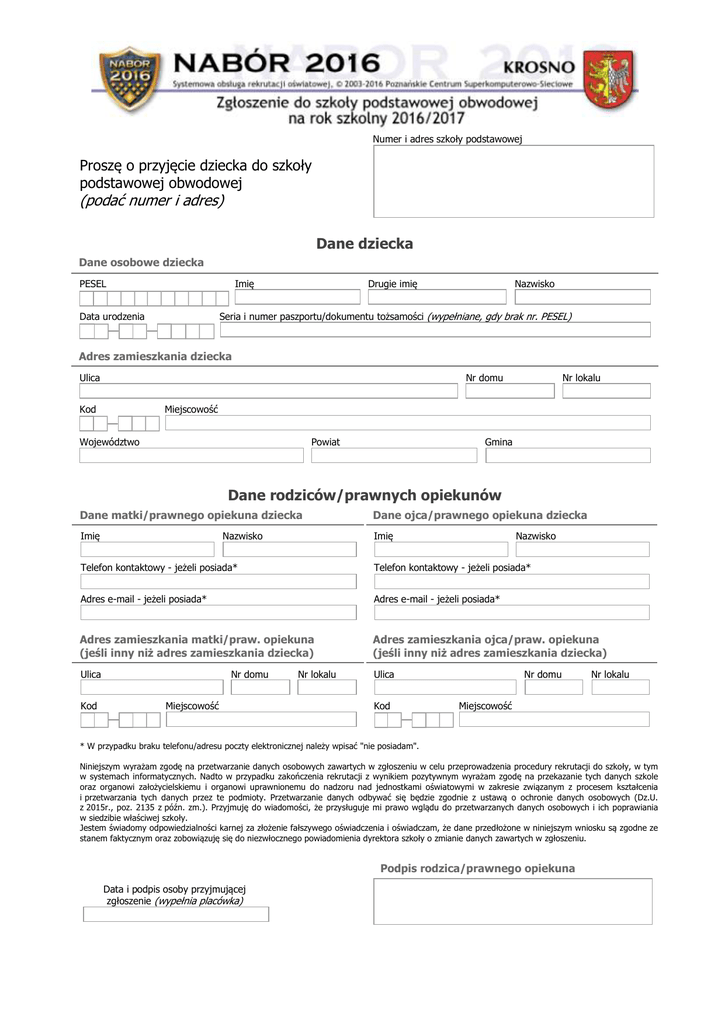 Numer i adres szkoły podstawowej Proszę o przyjęcie dziecka do szkoły podstawowej obwodowej (podać numer i adres) Dane dziecka Dane osobowe dziecka PESEL Imię Nazwisko Seria i numer paszportu/dokumentu tożsamości (wypełniane, gdy brak nr. PESEL) Data urodzenia — Drugie imię — Adres zamieszkania dziecka Ulica Nr domu Kod Nr lokalu Miejscowość — Województwo Powiat Gmina Dane rodziców/prawnych opiekunów Dane matki/prawnego opiekuna dziecka Dane ojca/prawnego opiekuna dziecka Imię Imię Nazwisko Nazwisko Telefon kontaktowy - jeżeli posiada* Telefon kontaktowy - jeżeli posiada* Adres e-mail - jeżeli posiada* Adres e-mail - jeżeli posiada* Adres zamieszkania matki/praw. opiekuna (jeśli inny niż adres zamieszkania dziecka) Adres zamieszkania ojca/praw. opiekuna (jeśli inny niż adres zamieszkania dziecka) Ulica Ulica Nr domu Kod Miejscowość — Nr lokalu Nr domu Kod Nr lokalu Miejscowość — * W przypadku braku telefonu/adresu poczty elektronicznej należy wpisać "nie posiadam". Niniejszym wyrażam zgodę na przetwarzanie danych osobowych zawartych w zgłoszeniu w celu przeprowadzenia procedury rekrutacji do szkoły, w tym w systemach informatycznych. Nadto w przypadku zakończenia rekrutacji z wynikiem pozytywnym wyrażam zgodę na przekazanie tych danych szkole oraz organowi założycielskiemu i organowi uprawnionemu do nadzoru nad jednostkami oświatowymi w zakresie związanym z procesem kształcenia i przetwarzania tych danych przez te podmioty. Przetwarzanie danych odbywać się będzie zgodnie z ustawą o ochronie danych osobowych (Dz.U. z 2015r., poz. 2135 z późn. zm.). Przyjmuję do wiadomości, że przysługuje mi prawo wglądu do przetwarzanych danych osobowych i ich poprawiania w siedzibie właściwej szkoły. Jestem świadomy odpowiedzialności karnej za złożenie fałszywego oświadczenia i oświadczam, że dane przedłożone w niniejszym wniosku są zgodne ze stanem faktycznym oraz zobowiązuję się do niezwłocznego powiadomienia dyrektora szkoły o zmianie danych zawartych w zgłoszeniu. Podpis rodzica/prawnego opiekuna Data i podpis osoby przyjmującej zgłoszenie (wypełnia placówka)