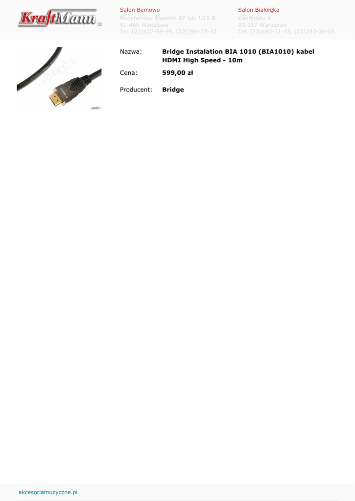 akcesoriamuzyczne.pl Salon Bemowo Salon Białołęka Powstańców Śląskich 87 lok. U10 B 01-466 Warszawa Tel. (22)427-89-95, (22)398-73-32 Kabrioletu 4 03-117 Warszawa Tel. (22)490-31-43, (22)243-36-05 Nazwa: Bridge Instalation BIA 1010 (BIA1010) kabel HDMI High Speed - 10m Cena: 599,00 zł Producent: Bridge