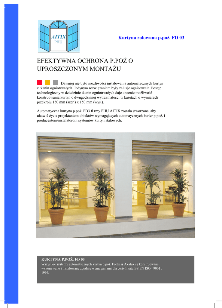 Kurtyna rolowana p.poż. FD 03 EFEKTYWNA OCHRONA P.POŻ O UPROSZCZONYM MONTAŻU Dawniej nie było możliwości instalowania automatycznych kurtyn z tkanin ogniotrwałych. Jedynym rozwiązaniem były żaluzje ogniotrwałe. Postęp technologiczny w dziedzinie tkanin ogniotrwałych daje obecnie możliwość konstruowania kurtyn o dwugodzinnej wytrzymałości w kasetach o wymiarach przekroju 150 mm (szer.) x 150 mm (wys.). Automatyczna kurtyna p.poż. FD3 fi rmy PHU AITIX została stworzona, aby ułatwić życie projektantom obiektów wymagających automaycznych barier p.poż. i producentom/instalatorom systemów kurtyn stalowych. KURTYNA P.POŻ. FD 03 Wszystkie systemy automatycznych kurtyn p.poż. Fortress Axalux są konstruowane, wykonywane i instalowane zgodnie wymaganiami dla certyfi katu BS EN ISO : 9001 : 1994. Kontrola dymu w razie pożaru wymaga uwagi już na etapie projektowania budynku. Dym stanowi największe zagrożenie. Konstrukcja wielkich budynków, takich jak kina, hale expo, lotniska, dworce kolejowe i centra handlowe, musi być dokładnie przemyślana pod kątem dróg ewakuacji dla najemców i gości tych budynków. System automatycznych kurtyn dymowych SD3 P.H.U. AITIX stanowi wsparcie dla konstruktorów wielkich budynków. Kurtyna dymowa może być wykorzystywana do odcięcia bądź odprowadzenia dymu na zewnątrz budynku w bezpieczny sposób. Wszystkie systemy automatycznych kurtyn p.poż. P.H.U. AITIX są konstruowane, wykonywane i instalowane zgodnie wymaganiami dla certyfi katu BS 7346-pl3 1990 I BS EN ISO : 9002 : 2001. KAPTUR SILNIK SZAFA STERUJĄCA Kaptur kurtyny pokryty szarym lakierem Profil 165, mm ¢ Silnik przemysłowy Beolux szafa sterująca z wbudowaną ym zasilaniem awaryjnym. PANEL STEROWANIA TKANINA Obudowa: wys. 400 mm x szer. 340 mm x gł. 110 mm Kolor: Biały Podłączenie do sieci: 230 V AC, 50 Hz, 5 A Obciążenie maksymalne: 10 osi SD3 Pojedyncza kaseta kurtyny 150 mm x 150 mm Przewód wyjściowy: 2,5 mm 2-żyłowy z uziemieniem, Pojedyncza kaseta kurtyny 150 mm x 150 mm powlekany Maks. długość: 100 m Alarm poż.: Belden 8781, lub podobny Bezpiecznik baterii: 2 x 12 V, 7 Ah, Baterie do wielorazowego ładowania. Działanie przy awarii prądu: 20 obrotów standardowych Działanie przy braku prądu i awarii baterii: Ochrona przed zamknięciem pod własnym ciężarem AGREGAT SILNIKA I SD3 Podnoszenie: BL24 - 24 V dla tkaniny o wym. do 18 m2 BL24/HP - 24 V dla tkaniny o wym. 18 - 24 m2 Górna granica – Elektroniczny ogranicznik prądu TYPY KASET KURTYNY LISTWA DOLNA Podwójnie zagięty kątownik aluminiowy z wytłaczanym poliwęglanem KASETA KURTYNY Galwanizowana blacha stalowa 18 a.w.g. Pojedyncza kaseta kurtyny: szer.150 mm x wys. 150 mm OPUSZCZANIE Ciężar własny Hamulec elektromagnetyczny EMF generowany przez obwód silnika. Dolna granica – długość tkaniny Kontakt P.H.U. AITIX Tomasz Pustelnik Siemianowicka 98 41-902 Bytom Tel: +48 32 767 26 70 Fax: +48 32 767 26 71 www.rolety-aitix.pl [email protected] Kurtyna rolowana p.po ż. FD 03 DANE TECHNICZNE