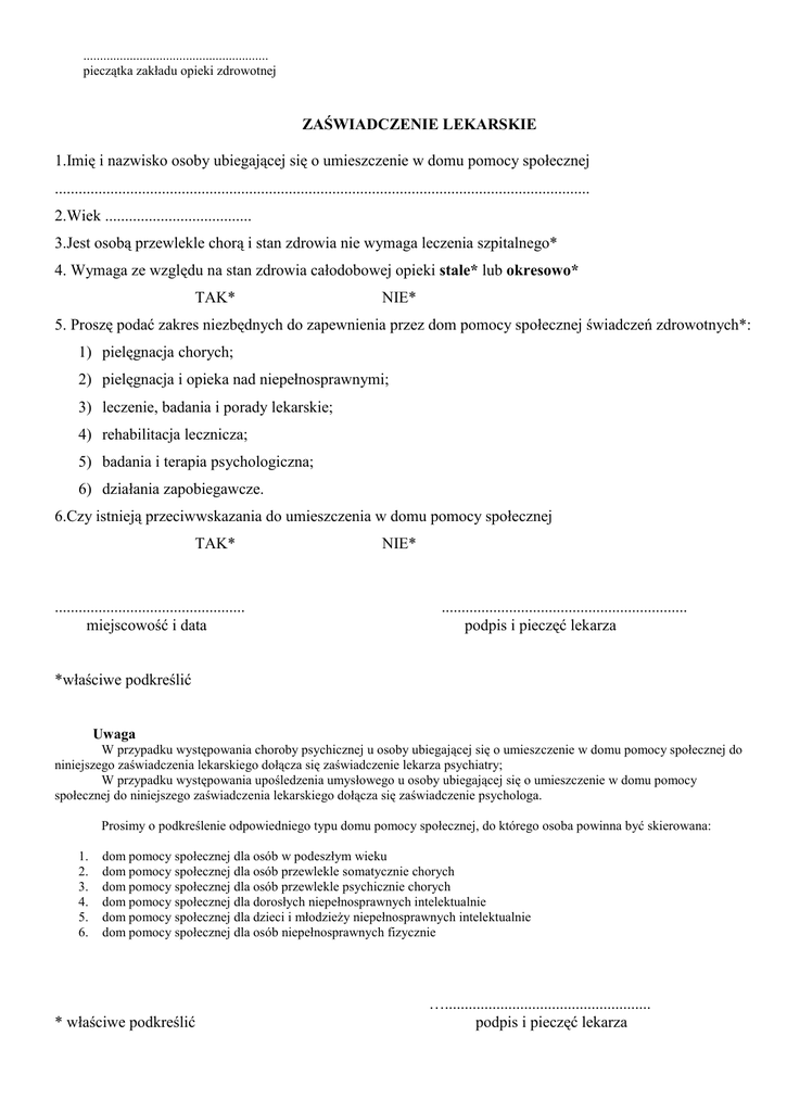 ........................................................ pieczątka zakładu opieki zdrowotnej ZAŚWIADCZENIE LEKARSKIE 1.Imię i nazwisko osoby ubiegającej się o umieszczenie w domu pomocy społecznej ....................................................................................................................................... 2.Wiek ..................................... 3.Jest osobą przewlekle chorą i stan zdrowia nie wymaga leczenia szpitalnego* 4. Wymaga ze względu na stan zdrowia całodobowej opieki stale* lub okresowo* TAK* NIE* 5. Proszę podać zakres niezbędnych do zapewnienia przez dom pomocy społecznej świadczeń zdrowotnych*: 1) pielęgnacja chorych; 2) pielęgnacja i opieka nad niepełnosprawnymi; 3) leczenie, badania i porady lekarskie; 4) rehabilitacja lecznicza; 5) badania i terapia psychologiczna; 6) działania zapobiegawcze. 6.Czy istnieją przeciwwskazania do umieszczenia w domu pomocy społecznej TAK* ................................................ miejscowość i data NIE* .............................................................. podpis i pieczęć lekarza *właściwe podkreślić Uwaga W przypadku występowania choroby psychicznej u osoby ubiegającej się o umieszczenie w domu pomocy społecznej do niniejszego zaświadczenia lekarskiego dołącza się zaświadczenie lekarza psychiatry; W przypadku występowania upośledzenia umysłowego u osoby ubiegającej się o umieszczenie w domu pomocy społecznej do niniejszego zaświadczenia lekarskiego dołącza się zaświadczenie psychologa. Prosimy o podkreślenie odpowiedniego typu domu pomocy społecznej, do którego osoba powinna być skierowana: 1. 2. 3. 4. 5. 6. dom pomocy społecznej dla osób w podeszłym wieku dom pomocy społecznej dla osób przewlekle somatycznie chorych dom pomocy społecznej dla osób przewlekle psychicznie chorych dom pomocy społecznej dla dorosłych niepełnosprawnych intelektualnie dom pomocy społecznej dla dzieci i młodzieży niepełnosprawnych intelektualnie dom pomocy społecznej dla osób niepełnosprawnych fizycznie * właściwe podkreślić ….................................................... podpis i pieczęć lekarza