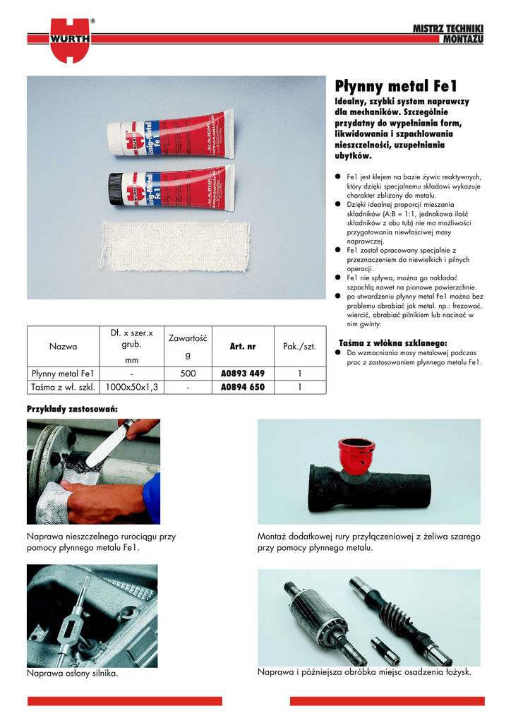 Płynny metal Fe1 Idealny, szybki system naprawczy dla mechaników. Szczególnie przydatny do wypełniania form, likwidowania i szpachlowania nieszczelności, uzupełniania ubytków. ● Fe1 jest klejem na bazie żywic reaktywnych, ● ● ● ● Nazwa Dł. x szer.x grub. Zawartość mm g Art. nr Pak./szt. który dzięki specjalnemu składowi wykazuje charakter zbliżony do metalu. Dzięki idealnej proporcji mieszania składników (A:B = 1:1, jednakowa ilość składników z obu tub) nie ma możliwości przygotowania niewłaściwej masy naprawczej. Fe1 został opracowany specjalnie z przeznaczeniem do niewielkich i pilnych operacji. Fe1 nie spływa, można go nakładać szpachlą nawet na pionowe powierzchnie. po utwardzeniu płynny metal Fe1 można bez problemu obrabiać jak metal. np.: frezować, wiercić, obrabiać pilnikiem lub nacinać w nim gwinty. Taśma z włókna szklanego: ● Do wzmacniania masy metalowej podczas prac z zastosowaniem płynnego metalu Fe1. Płynny metal Fe1 - 500 A0893 449 1 Taśma z wł. szkl. 1000x50x1,3 - A0894 650 1 Przykłady zastosowań: Naprawa nieszczelnego rurociągu przy pomocy płynnego metalu Fe1. Montaż dodatkowej rury przyłączeniowej z żeliwa szarego przy pomocy płynnego metalu. Naprawa osłony silnika. Naprawa i późniejsza obróbka miejsc osadzenia łożysk.