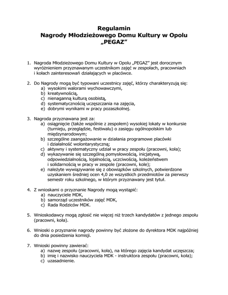 Regulamin Nagrody Młodzieżowego Domu Kultury w Opolu „PEGAZ” 1. Nagroda Młodzieżowego Domu Kultury w Opolu „PEGAZ” jest dorocznym wyróżnieniem przyznawanym uczestnikom zajęć w zespołach, pracowniach i kołach zainteresowań działających w placówce. 2. Do Nagrody mogą być typowani uczestnicy zajęć, którzy charakteryzują się: a) wysokimi walorami wychowawczymi, b) kreatywnością, c) nienaganną kulturą osobistą, d) systematycznością uczęszczania na zajęcia, e) dobrymi wynikami w pracy pozaszkolnej. 3. Nagroda przyznawana jest za: a) osiągnięcie (także wspólnie z zespołem) wysokiej lokaty w konkursie (turnieju, przeglądzie, festiwalu) o zasięgu ogólnopolskim lub międzynarodowym; b) szczególne zaangażowanie w działania programowe placówki i działalność wolontarystyczną; c) aktywny i systematyczny udział w pracy zespołu (pracowni, koła); d) wykazywanie się szczególną pomysłowością, inicjatywą, odpowiedzialnością, lojalnością, uczciwością, koleżeństwem i solidarnością w pracy w zespole (pracowni, kole); e) należyte wywiązywanie się z obowiązków szkolnych, potwierdzone uzyskaniem średniej ocen 4,0 ze wszystkich przedmiotów za pierwszy semestr roku szkolnego, w którym przyznawany jest tytuł. 4. Z wnioskami o przyznanie Nagrody mogą wystąpić: a) nauczyciele MDK, b) samorząd uczestników zajęć MDK, c) Rada Rodziców MDK. 5. Wnioskodawcy mogą zgłosić nie więcej niż trzech kandydatów z jednego zespołu (pracowni, koła). 6. Wnioski o przyznanie nagrody powinny być złożone do dyrektora MDK najpóźniej do dnia posiedzenia komisji. 7. Wnioski powinny zawierać: a) nazwę zespołu (pracowni, koła), na którego zajęcia kandydat uczęszcza; b) imię i nazwisko nauczyciela MDK - instruktora zespołu (pracowni, koła); c) uzasadnienie. 8. Do wniosków powinny być dołączone kserokopie dokumentów potwierdzających spełnianie kryteriów określonych w Regulaminie. 9. Nagrodę przyznaje Kapituła Nagrody, w skład której wchodzą: a) dyrektor MDK, b) wicedyrektor MDK ds. pedagogicznych, c) nauczyciele MDK wyłonieni z grona członków Rady Programowej MDK, d) pracownicy MDK będący dotychczasowymi laureatami Nagrody. 10. Nagroda przyznawana jest w trzech stopniach: złotym, srebrnym i brązowym. 11. Wręczenia nagrody dokonuje dyrektor MDK. Nagrodzie towarzyszy dokument potwierdzający jej zdobycie. 12. Dyrektor MDK może pozbawić laureata przyznanej mu Nagrody w razie stwierdzenia, że jej przyznanie nastąpiło wskutek wprowadzenia w błąd członków Kapituły Nagrody lub w sytuacji, gdy osoba wyróżniona stała się niegodna jej posiadania. 13. Regulamin wchodzi w życie z dniem uchwalenia go przez Radę Pedagogiczną MDK.