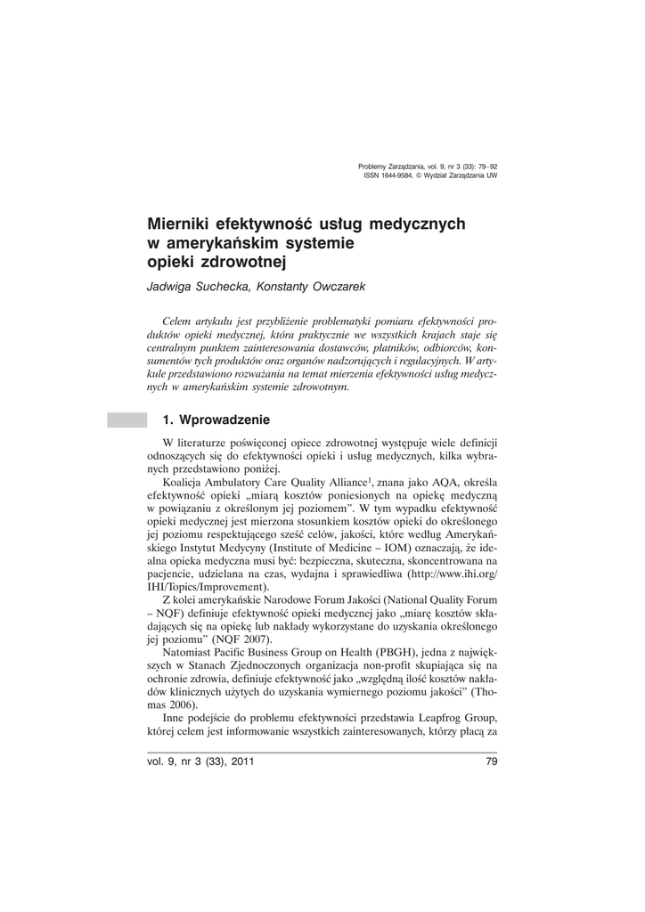 Problemy ZarzÈdzania, vol. 9, nr 3 (33): 79 – 92 ISSN 1644-9584, © Wydziaï ZarzÈdzania UW Mierniki efektywnoĂÊ usïug medycznych w amerykañskim systemie opieki zdrowotnej Jadwiga Suchecka, Konstanty Owczarek Celem artykuïu jest przybliĝenie problematyki pomiaru efektywnoĂci produktów opieki medycznej, która praktycznie we wszystkich krajach staje siÚ centralnym punktem zainteresowania dostawców, pïatników, odbiorców, konsumentów tych produktów oraz organów nadzorujÈcych ibregulacyjnych. Wbartykule przedstawiono rozwaĝania na temat mierzenia efektywnoĂci usïug medycznych wb amerykañskim systemie zdrowotnym. 1. Wprowadzenie W literaturze poĂwiÚconej opiece zdrowotnej wystÚpuje wiele definicji odnoszÈcych siÚ do efektywnoĂci opieki ib usïug medycznych, kilka wybranych przedstawiono poniĝej. Koalicja Ambulatory Care Quality Alliance1, znana jako AQA, okreĂla efektywnoĂÊ opieki „miarÈ kosztów poniesionych na opiekÚ medycznÈ wb powiÈzaniu zb okreĂlonym jej poziomem”. W tym wypadku efektywnoĂÊ opieki medycznej jest mierzona stosunkiem kosztów opieki do okreĂlonego jej poziomu respektujÈcego szeĂÊ celów, jakoĂci, które wedïug Amerykañskiego Instytut Medycyny (Institute of Medicine – IOM) oznaczajÈ, ĝe idealna opieka medyczna musi byÊ: bezpieczna, skuteczna, skoncentrowana na pacjencie, udzielana na czas, wydajna ib sprawiedliwa (http://www.ihi.org/ IHI/Topics/Improvement). Z kolei amerykañskie Narodowe Forum JakoĂci (National Quality Forum – NQF) definiuje efektywnoĂÊ opieki medycznej jako „miarÚ kosztów skïadajÈcych siÚ na opiekÚ lub nakïady wykorzystane do uzyskania okreĂlonego jej poziomu” (NQF 2007). Natomiast Pacific Business Group on Health (PBGH), jedna zbnajwiÚkszych wb Stanach Zjednoczonych organizacja non-profit skupiajÈca siÚ na ochronie zdrowia, definiuje efektywnoĂÊ jako „wzglÚdnÈ iloĂÊ kosztów nakïadów klinicznych uĝytych do uzyskania wymiernego poziomu jakoĂci” (Thomas 2006). Inne podejĂcie do problemu efektywnoĂci przedstawia Leapfrog Group, której celem jest informowanie wszystkich zainteresowanych, którzy pïacÈ za vol. 9, nr 3 (33), 2011 79 Jadwiga Suchecka, Konstanty Owczarek usïugi medyczne (pracodawcy, zleceniodawcy, nabywcy), jak okreĂlaÊ ich wartoĂÊ ib jakoĂÊ. W tym przypadku efektywnoĂÊ jest okreĂlana, jako „wzglÚdny poziom zuĝycia zasobów ibzwiÈzanych zbtym kosztów potrzebnych do wytworzenia usïug opieki medycznej bez brania pod uwagÚ ich rezultatów klinicznych” (The Leapfrog Group and Bridges to Excellence 2004). RAND Corporation – amerykañski think tank iborganizacja badawcza non-profit, która prowadzi badania na tak róĝnych polach, jak obronnoĂÊ, stosunki miÚdzynarodowe, edukacja czy zdrowie publiczne, zdefiniowaïa efektywnoĂÊ, jako „atrybut wydajnoĂci, który jest mierzony relacjÈ miÚdzy konkretnym produktem systemu opieki zdrowotnej (wyjĂciem systemu) abzasobami (wejĂciem systemu) wykorzystanymi do wytworzenia tego produktu” (Southern California Evidence-based Practice Center–RAND Corporation 2008). Na zakoñczenie przeglÈdu definicja Palmera ib Torgersona zb Centrum Ekonomiki Zdrowia na Uniwersytecie wbYork, którzy okreĂlili efektywnoĂÊ, jako „relacjÚ pomiÚdzy nakïadami (koszty wbpostaci pracy, kapitaïu ibsprzÚtu) albo do wyników poĂrednich (liczba wyleczonych, czas oczekiwania na zabieg itp.) albo do wyników koñcowych (liczba pacjentów uratowanych od Ămierci, przedïuĝonych lat ĝycia, czasu wolnego od objawów choroby itp.)” (Palmer ib Torgerson 1999). OpierajÈc siÚ na powyĝszych definicjach, efektywnoĂÊ usïug medycznych moĝna okreĂliÊ jako atrybut modelu opieki zdrowotnej mierzony relacjÈ pomiÚdzy produktem systemu opieki medycznej (wyjĂcie) ab nakïadami potrzebnymi na wytworzenie tego produktu (wejĂcie). Zgodnie zbtym stwierdzeniem, usïugodawca wb systemie opieki medycznej (np. szpital, lekarz) jest efektywny, jeĝeli byï wbstanie wytworzyÊ wiÚcej produktów przy danych nakïadach lub zminimalizowaÊ nakïady na wytworzenia danego produktu. EfektywnoĂÊ ib jego mierniki naleĝy rozpatrywaÊ zb punktu widzenia: – podmiotu oceniajÈcego, – produktu opieki medycznej, – nakïadów uĝytych do wytworzenia produktu. 2. EfektywnoĂÊ zb punktu widzenia podmiotu oceniajÈcego Podmioty oceniajÈce efektywnoĂÊ to przede wszystkim: – dostawcy usïug medycznych (np. lekarze, szpitale, domy opieki), – poĂrednicy (np. plany zdrowotne, pracodawcy), którzy dziaïajÈ wb imieniu róĝnych dostawców lub osób fizycznych, – konsumenci/pacjenci, którzy korzystajÈ zb usïug opieki medycznej, – spoïeczeñstwo, które obejmuje powyĝsze trzy podmioty. Kaĝdy zbwyĝej wymienionych podmiotów ma inne cele wbzakresie oceny efektywnoĂci, poniewaĝ sprawuje kontrolÚ nad okreĂlonymi zasobami lub nakïadami ib w zwiÈzku zb tym moĝe wytwarzaÊ lub kupowaÊ róĝne zestawy produktów. Na przykïad dostawcy usïug medycznych majÈ bezpoĂredni 80 Problemy ZarzÈdzania Mierniki efektywnoĂÊ usïug medycznych w amerykañskim systemie opieki zdrowotnej wpïyw na sposób wytwarzania tych produktów, natomiast poĂrednicy mogÈ podjÈÊ decyzje, które zb produktów bÚdÈ kupowane, ab które nie. Z kolei konsumenci/pacjenci, aby uzyskaÊ dostÚp do produktów wytworzonych przez dostawców (szpitale, lekarze), najczÚĂciej korzystajÈ zbpomocy poĂredników, którzy zwykle nie informujÈ klienta, wbjaki sposób produkt jest wytwarzany. Dopiero od niedawna niektórzy poĂrednicy (plany zdrowotne) zaczÚli informowaÊ klientów ob kosztach wytwarzania produktów, aby podnieĂÊ ĂwiadomoĂÊ pacjentów odnoĂnie decyzji zwiÈzanej zbwyborem produktu. Społeczeństwo Dostawcy Szpitale Lekarze Domy opieki Kliniki nagłych przypadków Produkty (wyjście) Nakłady (wejście) Pośrednicy Plan ochrony zdrowia Pracodawcy Konsumenci (pacjenci) Usługi medyczne Skutki zdrowotne Zabiegi chirur