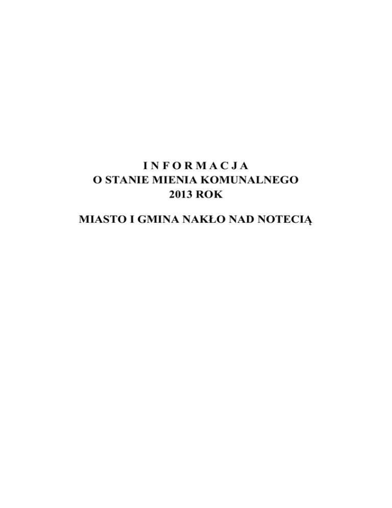 I N FOR MAC JA O STANIE MIENIA KOMUNALNEGO 2013 ROK MIASTO I GMINA NAKŁO NAD NOTECIĄ Celem opracowania jest ustalenie stanu majątku Gminy Nakło n. Not. w formie informacji, zgodnie z przepisem art. 2 ust. 2 ustawy z dnia 8 marca 1990 r o samorządzie gminnym (Dz. U. z 2001 r. Nr 142, poz. 1591 z późn. zmianami) i ustawą z dnia 27 sierpnia 2009 r. o finansach publicznych (Dz. U. z 2009 r. Nr 157, poz. 1240 z późn. zmianami). Stan majątku gminy tworzy się poprzez: komunalizację z mocy prawa, komunalizację na wniosek gminy, nabycie i zbycie nieruchomości na zasadach kodeksu cywilnego, darowizny i spadki, rewindykacje finansowe, zawieranie ugód z podmiotami gospodarczymi. Zasady tworzenia i gospodarowania majątkiem regulują niżej wymienione przepisy prawne: 1. Ustawa z dnia 8 marca 1990 r o samorządzie gminnym (Dz. U. z 2013r. poz. 594 z późniejszymi zmianami) 2. Ustawę z dnia 29 września 1994 r. o rachunkowości (Dz. U. z 2013 r. poz. 330 z późn. zmianami) 3. Ustawę z dnia 15 lutego 1992 o podatku dochodowym od osób prawnych (Dz. U. z 2011r Nr 74, poz. 397 z późn. zmianami). Informacją objęto wszystkie jednostki organizacyjne Gminy Nakło nad Notecią. Dane w informacji obejmują okres roku i zebrane zostały według stanów na dzień 31.12.2013 r). Pod pojęciem mienia przyjęto składniki majątkowe w rozumieniu ustawy z dnia 29 września 1994 r o rachunkowości (Dz. U. z 2009r Nr 152, poz. 1223 z późn. zmianami) tj; I. Rzeczowe i zrównane z nimi składniki majątku trwałego w tym: - grunty, - budynki i budowle, - urządzenia techniczne, maszyny, - środki transportu, - inne środki trwałe, - inwestycje rozpoczęte, - należności z tytułu zaliczek na inwestycje, II. Koszty nabycia praw majątkowych. - nabyte oprogramowanie komputerów III. Finansowe składniki majątku trwałego, w tym: - udziały w obcych podmiotach gospodarczych, - inne składniki finansowe. Umorzenie majątku wyliczono zgodnie z rozporządzeniem Ministra Finansów z dnia 27 marca 1992 r w sprawie składników majątkowych uznanych za środki trwałe oraz wartości niematerialne i prawne, zasad i stawek amortyzacji oraz trybu i terminów aktualizacji wyceny środków trwałych, a od 1 stycznia 1995r zgodnie z rozporządzeniem Ministra Finansów z dnia 20 stycznia 1995 r w sprawie amortyzacji środków trwałych, zmiana w/w rozporządzenia z dnia 17 stycznia 1997 r (Dz. U. Nr 6 poz. 35 z późn. zmianami) oraz od 1.01.2001 r wg zał. Nr 1 ustawy z dnia 15 lutego 1992 roku o podatku dochodowym od osób prawnych (Dz. U. Nr 54 poz. 654 z 2000 r ze zmianami). 2 W tym przypadku potraktowano umorzenie jako „odzwierciedlenie” technicznego zużycia. Całość opracowania podzielono na trzy części z uwagi na źródło pochodzenia danych. Część I -Mienie komunalne jednostek organizacyjnych „Gminy Nakło n. Not.” Część II -Pozostałe mienie komunalne. Część III -Należność i zobowiązania. MAJĄTEK GMINY – OGÓŁEM: Wartość brutto majątku gminy Nakło n. Not. obrazuje poniższa tabela: Tabela Nr 1 Lp. Jednostki podległe Wartość brutto majątku gminie 1 2 1. Część I Jednostki budżetowe 2. Instytucje kultury 3. Udziały gminy w obc. podmiotach Razem Część II Majątek użyczony 1. 2. Grunty zabudowane i niezabudowane, skomunalizowane Razem 31.12.2012 3 31.12.2013 4 Różnica 5 131 650 038 143 953 629 +12 303 591 373 170 562 371 +189 201 41 698 548 42 626 052 +927 504 173 721 756 187 142 052 +13 420 296 337 558 174 644 - 162 914 66 164 843 66 164 843 0 70 520 081 66 502 401 - 162 914 CZĘŚĆ I Mienie komunalne jednostek organizacyjnych Gminy Nakło n. Not. 1.Jednostki budżetowe. Gminne jednostki budżetowe prowadzą gospodarkę finansową w oparciu o ustawę o finansach publicznych z dnia 27 sierpnia 2009 roku (Dz. U. Nr 157, poz. 1240) Jednostki budżetowe pokrywają swoje wydatki bezpośrednio z budżetu miasta i gminy, a uzyskane dochody odprowadzają do tego budżetu. W gminie Nakło n. Not. do takich jednostek należą: 1. Dział 750 Urząd Miasta i Gminy, 2. Dział 754 Ochotnicze Straże Pożarne, 3. Dział 754 Bezpieczeństwo Publiczne – Straż Miejska, 4. Dział 801,851,854 i 926 Zespół Obsługi Oświaty i Rekreacji, 5. Dział 851 i 852 Opieka Społeczna, 6. Dział 801, 851, 852 i 900 Zakład Robót Publicznych 3 Łączna wartość majątku obrazuje poniższa tabela: Tabela Nr 2 Lp. Nazwa jednostki 1 1. 2. 3. 4. 2 Zakład Robót Publicznych Ochotnicze Straże Pożarne Oświata i Wychowanie Opieka Społeczna 5. ZOOiR Sport i Rekreacja 6. Urząd Miasta i Gminy 7. 8. Rodzaj Stan Stan + zwiększ. wartość na dzień 31.12.2012 na dzień 31.12.2013 - zmniejsz. /5-4/ 3 4 856 563,21 355 302,49 501 260,72 58,52 1 840 130,18 433 170,92 1 406 959,26 76 12 762 484,00 4 215 801,00 8 546 683,00 67 136 449,26 5 906,70 130 542,56 95,67 7 589,00 0,00 7 589,00 100 115 965 964,58 98 172 925,91 17 793 038,67 15 78 773,76 5 7 156 749,73 6 490 417,90 666 331,83 9,31 1 840 130,18 336 634,92 1 503 495,26 82 24 231 438,00 12 230 572,00 12 000 866,00 50 136 449,26 11 033,63 125 415,63 91,91 7 589,00 0,00 7 589,00 100 110 499 861,73 93 837 448,01 16 662 413,72 15 78 773,76 2 125,63 76 648,13 97 2 084,40 0 0,00 78 773,76 100 2 637,90 0,00 - 2 125,63 2 125,63 Umorzenie 2 084,40 2 637,90 553,50 % brutto netto umorzenie % 100 131 650 038,39 103 185 232,65 28 464 805,74 21,60 100 143 953 629,56 112 906 106,46 31 047 523,10 21,57 12 303 591,17 9 720 873,81 2 582 717,36 brutto netto umorzenie % brutto netto umorzenie % brutto netto umorzenie % brutto netto umorzenie % brutto netto umorzenie % brutto netto umorzenie % brutto Bezpieczeństwo Publiczne – Straż netto Miejska umorzenie % Gminne Centrum brutto Reagowania Netto Razem 4 6 6 300 186,52 6 135 115,41 165 071,11 0,00 - 96 536,00 96 536,00 11 468 954,00 8 014 771,00 3 454 183,00 5 126,93 - 5 126,93 -5 466 102,85 - 4 335 477,90 -1 130 624,95 553,50 0 Struktura oraz zmiany majątku jednostek budżetowych przedstawia poniższa 