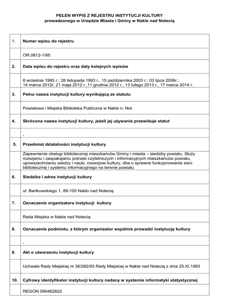 PEŁEN WYPIS Z REJESTRU INSTYTUCJI KULTURY prowadzonego w Urzędzie Miasta i Gminy w Nakle nad Notecią 1. Numer wpisu do rejestru OR.0812-1/95 2. Data wpisu do rejestru oraz daty kolejnych wpisów 8 września 1995 r.; 26 listopada 1993 r., 15 października 2003 r.; 03 lipca 2006r.; 14 marca 2012r, 21 maja 2012 r.,11 grudnia 2012 r., 13 lutego 2013 r., 17 marca 2014 r. 3. Pełna nazwa instytucji kultury wynikającą ze statutu Powiatowa i Miejska Biblioteka Publiczna w Nakle n. Not. 4. Skrócona nazwa instytucji kultury, jeżeli jej używanie przewiduje statut 5. Przedmiot działalności instytucji kultury Zapewnienie obsługi bibliotecznej mieszkańców Gminy i miasta – siedziby powiatu. Służy rozwijaniu i zaspakajaniu potrzeb czytelniczych i informacyjnych mieszkańców powiatu, upowszechnianiu wiedzy i nauki, rozwojowi kultury, dba o sprawne funkcjonowanie sieci bibliotecznej i systemu informacyjnego na terenie powiatu 6. Siedziba i adres instytucji kultury ul. Bartkowskiego 1, 89-100 Nakło nad Notecią 7. Oznaczenie organizatora instytucji kultury Rada Miejska w Nakle nad Notecią 8. Oznaczenie podmiotu, z którym organizator wspólnie prowadzi instytucję kultury 9. Akt o utworzeniu instytucji kultury Uchwała Rady Miejskiej nr 36/282/93 Rady Miejskiej w Nakle nad Notecią z dnia 25.XI.1993 10. Cyfrowy identyfikator instytucji kultury nadany w systemie informatyki statystycznej REGON 090462822 9. Akt o nadaniu statutu instytucji kultury Uchwała nr 36/282/93 Rady Miejskiej w Nakle n. Notecią z dnia 25.XI.1993r. w sprawie nadania statutu Bibliotece Publicznej w Nakle n. Notecią Uchwała nr XXXIX/471/2001 Rady Miejskiej w Nakle n. Not. z dnia 29 czerwca 2001r.w sprawie nadania Statutu Powiatowej i Miejskiej Bibliotece Publicznej w Nakle n. Not. Uchwała nr XLIV/432/2006 Rady Miejskiej w Nakle n. Not. z dnia 27 czerwca 2006r. w sprawie zmian do statutu Powiatowej i i Miejskiej Biblioteki Publicznej w Nakle nad Notecią Uchwała Nr XXIV/496/2012 Rady Miejskiej w Nakle nad Notecią z dnia 25 października 2012 w sprawie nadania Statutu Powiatowej i Miejskiej Bibliotece Publicznej w Nakle nad Notecią 10. Imię i nazwisko dyrektora instytucji kultury i jego zastępców lub oznaczenia osoby fizycznej lub prawnej, której powierzono zarządzanie instytucją kultury Grażyna Ozga 11. Imiona i nazwiska pełnomocników instytucji kultury uprawnionych do dokonywania czynności prawnych w imieniu instytucji oraz zakres ich upoważnień Małgorzata Zielińska 12. Informacja o złożeniu do rejestru rocznego sprawozdania finansowego 17 marca 2014 – data złożenia bilansu 13 Informacja o obciążeniu środków trwałych instytucji kultury ograniczonymi prawami rzeczowymi 14. Informacja o połączeniu, podziale lub likwidacji instytucji kultury - 15. Imię i nazwisko likwidatora - Nakło nad Notecią, dnia 1 kwietnia 2014 r.