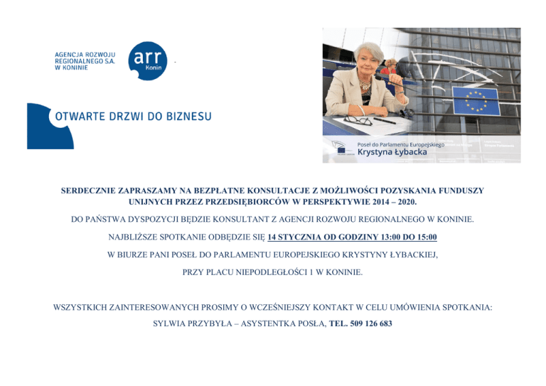 Pos eł d i SERDECZNIE ZAPRASZAMY NA BEZPŁATNE KONSULTACJE Z MOŻLIWOŚCI POZYSKANIA FUNDUSZY UNIJNYCH PRZEZ PRZEDSIĘBIORCÓW W PERSPEKTYWIE 2014 – 2020. DO PAŃSTWA DYSPOZYCJI BĘDZIE KONSULTANT Z AGENCJI ROZWOJU REGIONALNEGO W KONINIE. NAJBLIŻSZE SPOTKANIE ODBĘDZIE SIĘ 14 STYCZNIA OD GODZINY 13:00 DO 15:00 W BIURZE PANI POSEŁ DO PARLAMENTU EUROPEJSKIEGO KRYSTYNY ŁYBACKIEJ, PRZY PLACU NIEPODLEGŁOŚCI 1 W KONINIE. WSZYSTKICH ZAINTERESOWANYCH PROSIMY O WCZEŚNIEJSZY KONTAKT W CELU UMÓWIENIA SPOTKANIA: SYLWIA PRZYBYŁA – ASYSTENTKA POSŁA, TEL. 509 126 683