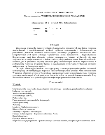 Kierunek studiów: ELEKTROTECHNIKA Nazwa przedmiotu: WIRTUALNE ŚRODOWISKO POMIAROWE (stacjonarne: 30 h – wykład, 30 h - laboratorium) Semestr: ? ?+1 W Ć 2E L P S 2 Cel zajęć: Zapoznanie z tematyką budowy wirtualnych przyrządów pomiarowych pod kątem tworzenia standardowych i specjalizowanych aplikacji ogólnego zastosowania i dedykowanych do prowadzenia pomiarów wielkości elektrycznych. Prezentacja przykładów zastosowania sieci komputerowych pod kątem zdalnego wykonywania zadań pomiarowych i diagnostycznych, Rozpatrywanie sieci jako elementu systemu pomiarowego, którego użytkownik nie musi znajdować się w miejscu zdarzenia, a jednocześnie uzyskuje podobny zestaw danych i możliwości działania, jak w przypadku fizycznej obecności przy kontrolowanym obiekcie. Wprowadzenie w problematykę tworzenia programów łącznie z zagadnieniami profilowania wydajności, szybkości wykonywania i wykorzystania pamięci. W części laboratoryjnej studenci tworzą programy o narastającym współczynniku złożoności. Efektem pracy laboratoryjnej jest napisanie wykonywalnego pliku aplikacji wraz z instalatorem. W program włączono również wykorzystanie sieci pomiarowych i komunikacyjnych do tworzenia systemów pomiarowych. Część praktyczna bazowała będzie na sprzęcie i oprogramowaniu firmy National Instruments oraz prezentacyjnych wersjach oprogramowania innych firm. Program zajęć: Wykład: Charakterystyka środowiska diagnostyczno-pomiarowego - instalacja, panel czołowy, schemat blokowy, typy danych. Analiza/usuwanie błędów. Modularyzacja (subVI). Pętle while i for. Funkcjonowanie przełączników logicznych. Rejestr przesuwny. Wykresy. Macierze /funkcje macierzowe. Klastry /funkcje klastrowe. Struktury – wyboru i sekwencyjne. Funkcje matematyczne – Expression i Formula Node. Dane łańcuchowe. Operacje plikowe we/wy. Indywidualizacja programów – panel czołowy, klawisze skrótów, modyfikacja właściwości, palet. Planowanie aplikacji – planowanie, projektowanie, implementacja, obsługa błędów. Projektowanie panelu czołowego – zagadnienia podstawowe, klastry logiczne, zdalne sterowanie panelem, dostęp przeglądarką WWW. Techniki zarządzania danymi – zmienne lokalne i globalne, datasocket. Sprzęt diagnostyczno-pomiarowy (DAQ, GPIB, VISA, Serial). Zarządzanie aplikacjami – układ plików, archiwizacja, dystrybucja. Wydajność – profilowanie, szybkość wykonywania operacji, wykorzystanie pamięci. Laboratorium: Zapoznanie ze środowiskiem programowym. Korzystanie z gotowych szablonów. Edycja elementów panelu czołowego. Korzystanie z węzłów typu Express. Ćwiczenie technik usuwania błędów z programu. Obsługa typowych węzłów programu. Podprogramy. Tworzenie ikon i paneli terminali. Wprowadzanie podprogramów. Dokumentowanie elementów programu. Pętla While (sposób funkcjonowania, sposób przekazywania danych przez tunele pętli). Rejestr przesuwny. Prezentacja danych za pomocą wykresu Waveform Chart. Stosowanie pętli For. Tablice tworzenie tablic oraz zapoznanie z funkcjami działania na tablicach. Korzystanie z wykresów XY. Zapoznanie z korzystaniem z wykresów natężenia (intensity plot). Klastry tworzenie obiektów klastrów na panelu czołowym oraz korzystanie z funkcji do łączenia i rozłączania danych o charakterze klastrowym. Zapoznanie z wykorzystaniem struktur wyboru (case structure). Struktura sekwencyjna (sequence structure) – przykładowe zastosowanie. Budowa przyrządu wirtualnego wykorzystującego węzły formuły do wykonywania złożonych działań matematycznych i wyświetlania ich na wykresie. Zmienne łańcuchowe - poznanie funkcji: formatowania do postaci łańcuchowej (Format Into String), łączenia łańcuchów (Concatenate Strings) i określania długości łańcuchów (String Length). Zapoznanie z mechanizmem obsługi plików z danymi (zapis i odczyt z pliku, zapisywanie tablicy dwuwymiarowej (2D) do pliku tekstowego w postaci arkusza danych). Deklaracja sposobu funkcjonowania podprogramów. Deklarowanie klawiszy skrótu dla funkcji panelu czołowego i konfigurowanie sposobu wyświetlania okien podprogramów inicjowanych za pomocą klawiszy skrótu. Obsługa klastrów za pomocy klawiszy skrótu. Zapoznanie z metodą edycji gotowych programów o konfiguracji utrudniającej modyfikację schematu blokowego. Program (instrument wirtualny) generujący, analizujący i wyświetlający serie danych, wykorzystujący standardowy mechanizm obsługi błędów. Utworzenie programu kontrolującego dane o użytkowniku bazującego na prostym modelu architektury. Obsługa szablonów. Konfiguracja (optymalizacja) panelu czołowego. Stosowanie kontrolki zakładkowej (tab control). Menu bazujące na klastrze logicznym. Węzły właściwości (property nodes). Wykorzystanie zmiennych lokalnych do inicjacji, modyfikowania wskaźników i kontrolek panelu czołowego programu. Używanie zmiennych globalnych do wymiany danych pomiędzy programami. Wymiana danych za pomocą mechanizmu DataSocket. Zapis i odczyt danych z plików binarnych. Przeglądanie i sterowanie programem ze zdalnego komputera z zainstalowanym środowiskiem. Zdalna obsługa programów za pośrednictwem protokołu HTTP i przeglądarki internetowej. Łączenie podprogramów ramach projektu. Zapoznanie się z wbudowanymi funkcjami środowiska LabVIEW ułatwiającymi obsługę projektów aplikacji. Tworzenie wykonywalnego pliku samodzielnej aplikacji - Application Builder. Laboratorium (opcjonalnie) Konstruowanie wirtualnego generatora sygnałów - budowa urządzeń wirtualnych, sterowanie parametrami wyjściowymi. Konstruowanie wirtualnego analizatora sygnałów - sterowanie parametrami wejściowymi urządzeń wirtualnych. Pomiary napięć (prądów) stałych i przemiennych. Woltomierz (amperomierz) – praktyczne pomiary napięć (prądów) w oparciu uprzednio utworzoną aplikację wirtualnego woltomierza i kartę pomiarową NI PCI-60X5E. Zasilacz n