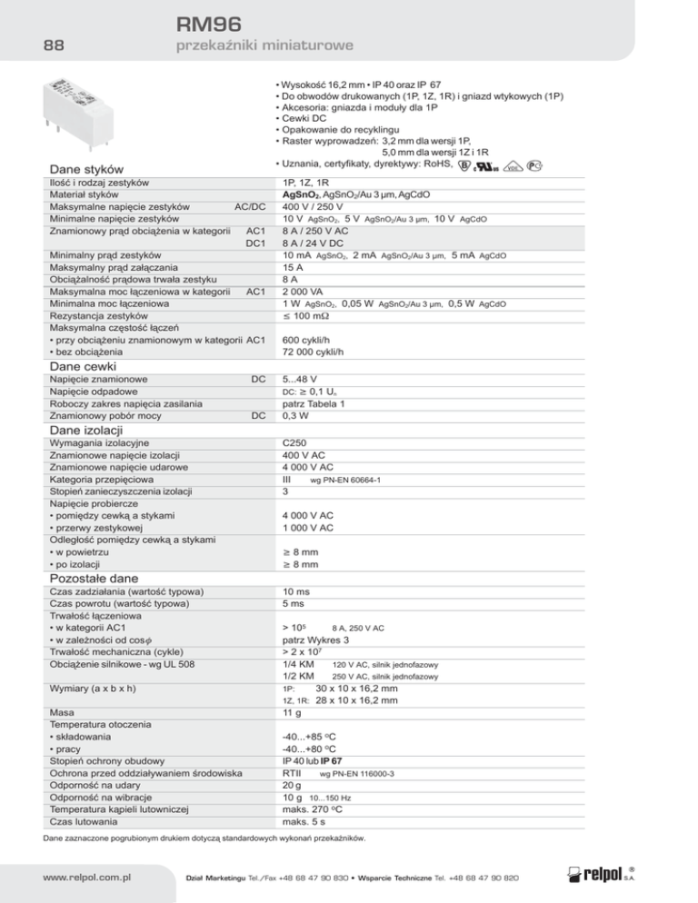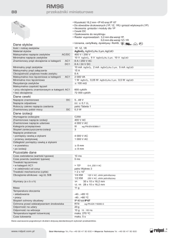 RM96 88 przekaŸniki miniaturowe • Wysokoœæ 16,2 mm • IP 40 oraz IP 67 • Do obwodów drukowanych (1P, 1Z, 1R) i gniazd wtykowych (1P) • Akcesoria: gniazda i modu³y dla 1P • Cewki DC • Opakowanie do recyklingu • Raster wyprowadzeñ: 3,2 mm dla wersji 1P, 5,0 mm dla wersji 1Z i 1R • Uznania, certyfikaty, dyrektywy: RoHS, Dane styków Iloœæ i rodzaj zestyków Materia³ styków Maksymalne napiêcie zestyków AC/DC Minimalne napiêcie zestyków Znamionowy pr¹d obci¹¿enia w kategorii AC1 DC1 Minimalny pr¹d zestyków Maksymalny pr¹d za³¹czania Obci¹¿alnoœæ pr¹dowa trwa³a zestyku Maksymalna moc ³¹czeniowa w kategorii AC1 Minimalna moc ³¹czeniowa Rezystancja zestyków Maksymalna czêstoœæ ³¹czeñ • przy obci¹¿eniu znamionowym w kategorii AC1 • bez obci¹¿enia 1P, 1Z, 1R AgSnO2, AgSnO2/Au 3 µm, AgCdO 400 V / 250 V 10 V AgSnO2, 5 V AgSnO2/Au 3 µm, 10 V AgCdO 8 A / 250 V AC 8 A / 24 V DC 10 mA AgSnO2, 2 mA AgSnO2/Au 3 µm, 5 mA AgCdO 15 A 8A 2 000 VA 1 W AgSnO2, 0,05 W AgSnO2/Au 3 µm, 0,5 W AgCdO ≤ 100 mΩ 600 cykli/h 72 000 cykli/h Dane cewki Napiêcie znamionowe Napiêcie odpadowe Roboczy zakres napiêcia zasilania Znamionowy pobór mocy DC DC 5...48 V DC: ≥ 0,1 Un patrz Tabela 1 0,3 W Dane izolacji Wymagania izolacyjne Znamionowe napiêcie izolacji Znamionowe napiêcie udarowe Kategoria przepiêciowa Stopieñ zanieczyszczenia izolacji Napiêcie probiercze • pomiêdzy cewk¹ a stykami • przerwy zestykowej Odleg³oœæ pomiêdzy cewk¹ a stykami • w powietrzu • po izolacji C250 400 V AC 4 000 V AC III wg PN-EN 60664-1 3 4 000 V AC 1 000 V AC ≥ 8 mm ≥ 8 mm Pozosta³e dane Czas zadzia³ania (wartoœæ typowa) Czas powrotu (wartoœæ typowa) Trwa³oœæ ³¹czeniowa • w kategorii AC1 • w zale¿noœci od cos φ Trwa³oœæ mechaniczna (cykle) Obci¹¿enie silnikowe - wg UL 508 Wymiary (a x b x h) Masa Temperatura otoczenia • sk³adowania • pracy Stopieñ ochrony obudowy Ochrona przed oddzia³ywaniem œrodowiska Odpornoœæ na udary Odpornoœæ na wibracje Temperatura k¹pieli lutowniczej Czas lutowania 10 ms 5 ms 8 A, 250 V AC > 105 patrz Wykres 3 > 2 x 107 1/4 KM 120 V AC, silnik jednofazowy 1/2 KM 250 V AC, silnik jednofazowy 30 x 10 x 16,2 mm 1P: 1Z, 1R: 28 x 10 x 16,2 mm 11 g -40...+85 oC -40...+80 oC IP 40 lub IP 67 RTII wg PN-EN 116000-3 20 g 10 g 10...150 Hz maks. 270 oC maks. 5 s Dane zaznaczone pogrubionym drukiem dotycz¹ standardowych wykonañ przekaŸników. www.relpol.com.pl Dzia³ Marketingu Tel./Fax +48 68 47 90 830 • Wsparcie Techniczne Tel. +48 68 47 90 820 RM96 przekaŸniki miniaturowe 89 Dane zaznaczone pogrubionym drukiem dotycz¹ standardowych wykonañ przekaŸników. 1P - prze³¹czny 1Z - zwierny, 1R - rozwierny 1P - prze³¹czny 1Z - zwierny 1R - rozwierny Rozstaw otworów monta¿owych (widok od strony lutowania) 1P - prze³¹czny 1Z - zwierny Dzia³ Marketingu Tel./Fax +48 68 47 90 830 • Wsparcie Techniczne Tel. +48 68 47 90 820 1R - rozwierny www.relpol.com.pl RM96 90 www.relpol.com.pl przekaŸniki miniaturowe Dzia³ Marketingu Tel./Fax +48 68 47 90 830 • Wsparcie Techniczne Tel. +48 68 47 90 820 RM96 przekaŸniki miniaturowe 91 Monta¿ PrzekaŸniki RM96 1P (1 zestyk prze³¹czny) przeznaczone s¹ do: • bezpoœredniego lutowania w obwodach drukowanych • gniazd wtykowych z zaciskami œrubowymi GZ96 z obejm¹ MS16, monta¿ na szynie 35 mm wg EN 50022 lub na p³ycie. Do gniazd oferowane s¹ modu³y sygnalizacyjne / przeciwprzepiêciowe typu M... (patrz str. 214). PrzekaŸniki RM96 1Z (1 zestyk zwierny) i RM96 1R (1 zestyk rozwierny) przeznaczone s¹ do bezpoœredniego lutowania w obwodach drukowanych. Oznaczenia kodowe do zamówieñ Stopieñ ochrony obudowy Typ Materia³ styków Iloœæ i rodzaj zestyków Sposób pod³¹czenia Kod cewki Materia³ styków 10 - AgCdO 30 - AgSnO2 32 - AgSnO2/Au 3 µm patrz Tabela 1 str. 89 Iloœæ i rodzaj zestyków 11 - 1P (prze³¹czny) 21 - 1Z (zwierny) 31 - 1R (rozwierny) Stopieñ ochrony obudowy 2 - w obudowie, wykonanie IP 40 3 - w obudowie, wykonanie wodoszczelne IP 67 Sposób pod³¹czenia 5 - do obwodów drukowanych (1P, 1Z, 1R) i gniazd (1P) Przyk³ady kodowania: RM96-3011-35-1012 RM96-3031-25-1024 przekaŸnik RM96, materia³ styków AgSnO2, z jednym zestykiem prze³¹cznym, w obudowie IP 67, do obwodów drukowanych i gniazd, wykonanie napiêciowe 12 V pr¹du sta³ego przekaŸnik RM96, materia³ styków AgSnO2, z jednym zestykiem rozwiernym, w obudowie IP 40, do obwodów drukowanych, wykonanie napiêciowe 24 V pr¹du sta³ego Nadruki na obudowach przekaŸników Oznakowania typów na obudowach przekaŸników RM96 nie odpowiadaj¹ oznaczeniom kodowym do zamówieñ. Przyk³adowe oznakowanie: RM96P-24-W RM96P - przekaŸnik RM96, z jednym zestykiem prze³¹cznym 24 - wykonanie napiêciowe 24 V pr¹du sta³ego W - w obudowie, wykonanie wodoszczelne IP 67 Dzia³ Marketingu Tel./Fax +48 68 47 90 830 • Wsparcie Techniczne Tel. +48 68 47 90 820 www.relpol.com.pl