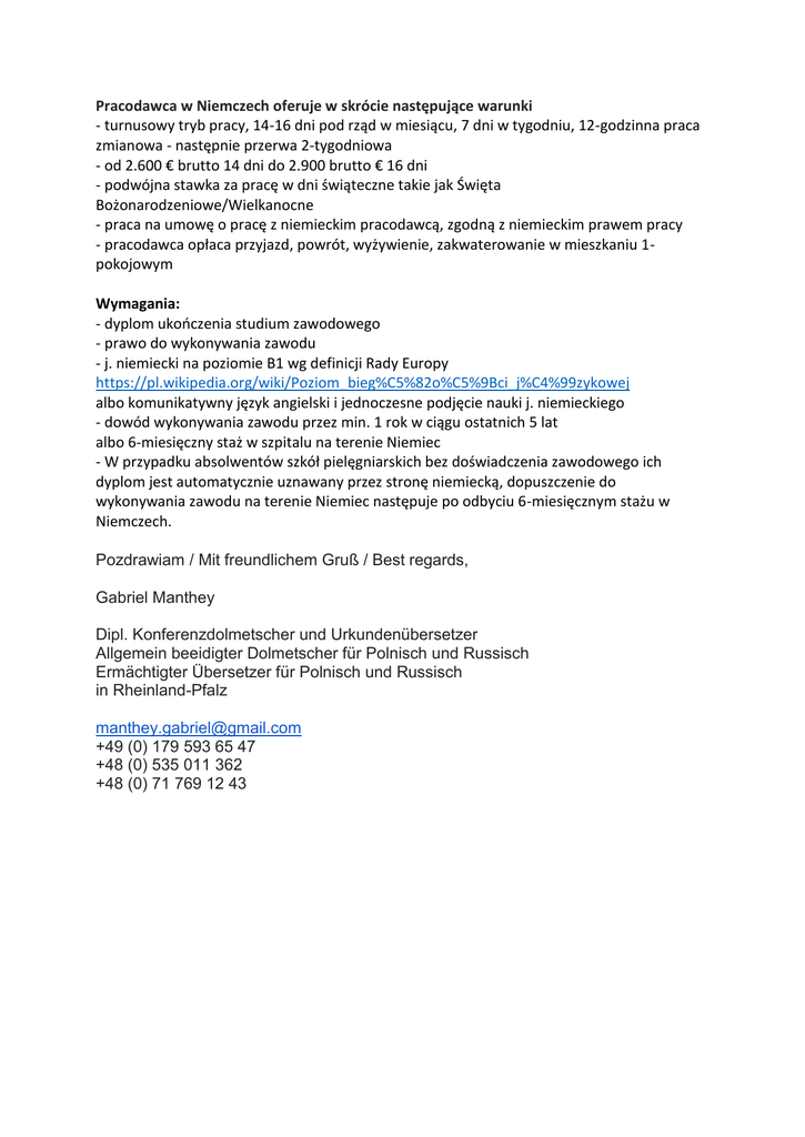 Pracodawca w Niemczech oferuje w skrócie następujące warunki - turnusowy tryb pracy, 14-16 dni pod rząd w miesiącu, 7 dni w tygodniu, 12-godzinna praca zmianowa - następnie przerwa 2-tygodniowa - od 2.600 € brutto 14 dni do 2.900 brutto € 16 dni - podwójna stawka za pracę w dni świąteczne takie jak Święta Bożonarodzeniowe/Wielkanocne - praca na umowę o pracę z niemieckim pracodawcą, zgodną z niemieckim prawem pracy - pracodawca opłaca przyjazd, powrót, wyżywienie, zakwaterowanie w mieszkaniu 1pokojowym Wymagania: - dyplom ukończenia studium zawodowego - prawo do wykonywania zawodu - j. niemiecki na poziomie B1 wg definicji Rady Europy https://pl.wikipedia.org/wiki/Poziom_bieg%C5%82o%C5%9Bci_j%C4%99zykowej albo komunikatywny język angielski i jednoczesne podjęcie nauki j. niemieckiego - dowód wykonywania zawodu przez min. 1 rok w ciągu ostatnich 5 lat albo 6-miesięczny staż w szpitalu na terenie Niemiec - W przypadku absolwentów szkół pielęgniarskich bez doświadczenia zawodowego ich dyplom jest automatycznie uznawany przez stronę niemiecką, dopuszczenie do wykonywania zawodu na terenie Niemiec następuje po odbyciu 6-miesięcznym stażu w Niemczech. Pozdrawiam / Mit freundlichem Gruß / Best regards, Gabriel Manthey Dipl. Konferenzdolmetscher und Urkundenübersetzer Allgemein beeidigter Dolmetscher für Polnisch und Russisch Ermächtigter Übersetzer für Polnisch und Russisch in Rheinland-Pfalz [email protected] +49 (0) 179 593 65 47 +48 (0) 535 011 362 +48 (0) 71 769 12 43
