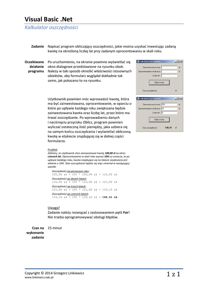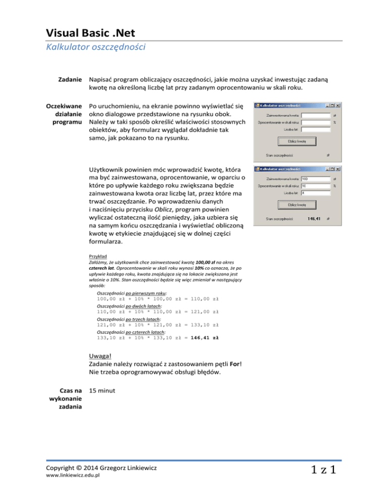 Visual Basic .Net Kalkulator oszczędności Zadanie Napisać program obliczający oszczędności, jakie można uzyskać inwestując zadaną kwotę na określoną liczbę lat przy zadanym oprocentowaniu w skali roku. Oczekiwane Po uruchomieniu, na ekranie powinno wyświetlać się działanie okno dialogowe przedstawione na rysunku obok. programu Należy w taki sposób określić właściwości stosownych obiektów, aby formularz wyglądał dokładnie tak samo, jak pokazano to na rysunku. Użytkownik powinien móc wprowadzić kwotę, która ma być zainwestowana, oprocentowanie, w oparciu o które po upływie każdego roku zwiększana będzie zainwestowana kwota oraz liczbę lat, przez które ma trwać oszczędzanie. Po wprowadzeniu danych i naciśnięciu przycisku Oblicz, program powinien wyliczać ostateczną ilość pieniędzy, jaka uzbiera się na samym końcu oszczędzania i wyświetlać obliczoną kwotę w etykiecie znajdującej się w dolnej części formularza. Przykład Załóżmy, że użytkownik chce zainwestować kwotę 100,00 zł na okres czterech lat. Oprocentowanie w skali roku wynosi 10% co oznacza, że po upływie każdego roku, kwota znajdująca się na lokacie zwiększana jest właśnie o 10%. Stan oszczędności będzie się więc zmieniał w następujący sposób: Oszczędności po pierwszym roku: 100,00 zł + 10% * 100,00 zł = 110,00 zł Oszczędności po dwóch latach: 110,00 zł + 10% * 110,00 zł = 121,00 zł Oszczędności po trzech latach: 121,00 zł + 10% * 121,00 zł = 133,10 zł Oszczędności po czterech latach: 133,10 zł + 10% * 133,10 zł = 146,41 zł Uwaga! Zadanie należy rozwiązać z zastosowaniem pętli For! Nie trzeba oprogramowywać obsługi błędów. Czas na 15 minut wykonanie zadania Copyright © 2014 Grzegorz Linkiewicz www.linkiewicz.edu.pl 1z1