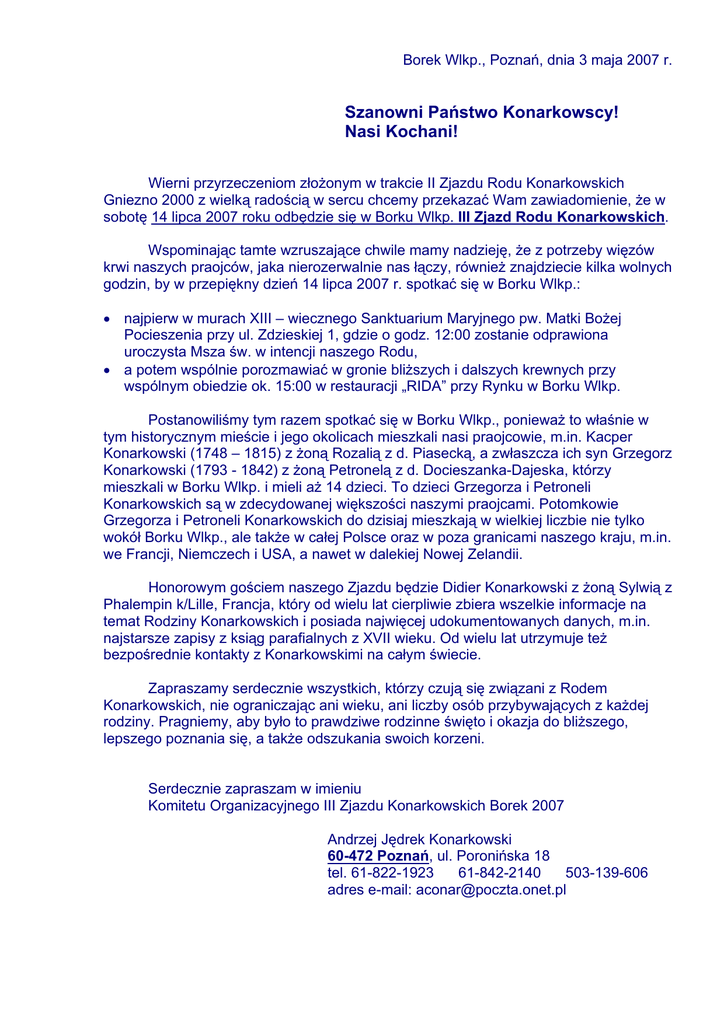 Borek Wlkp., Poznań, dnia 3 maja 2007 r. Szanowni Państwo Konarkowscy! Nasi Kochani! Wierni przyrzeczeniom złożonym w trakcie II Zjazdu Rodu Konarkowskich Gniezno 2000 z wielką radością w sercu chcemy przekazać Wam zawiadomienie, że w sobotę 14 lipca 2007 roku odbędzie się w Borku Wlkp. III Zjazd Rodu Konarkowskich. Wspominając tamte wzruszające chwile mamy nadzieję, że z potrzeby więzów krwi naszych praojców, jaka nierozerwalnie nas łączy, również znajdziecie kilka wolnych godzin, by w przepiękny dzień 14 lipca 2007 r. spotkać się w Borku Wlkp.: • najpierw w murach XIII – wiecznego Sanktuarium Maryjnego pw. Matki Bożej Pocieszenia przy ul. Zdzieskiej 1, gdzie o godz. 12:00 zostanie odprawiona uroczysta Msza św. w intencji naszego Rodu, • a potem wspólnie porozmawiać w gronie bliższych i dalszych krewnych przy wspólnym obiedzie ok. 15:00 w restauracji „RIDA” przy Rynku w Borku Wlkp. Postanowiliśmy tym razem spotkać się w Borku Wlkp., ponieważ to właśnie w tym historycznym mieście i jego okolicach mieszkali nasi praojcowie, m.in. Kacper Konarkowski (1748 – 1815) z żoną Rozalią z d. Piasecką, a zwłaszcza ich syn Grzegorz Konarkowski (1793 - 1842) z żoną Petronelą z d. Docieszanka-Dajeska, którzy mieszkali w Borku Wlkp. i mieli aż 14 dzieci. To dzieci Grzegorza i Petroneli Konarkowskich są w zdecydowanej większości naszymi praojcami. Potomkowie Grzegorza i Petroneli Konarkowskich do dzisiaj mieszkają w wielkiej liczbie nie tylko wokół Borku Wlkp., ale także w całej Polsce oraz w poza granicami naszego kraju, m.in. we Francji, Niemczech i USA, a nawet w dalekiej Nowej Zelandii. Honorowym gościem naszego Zjazdu będzie Didier Konarkowski z żoną Sylwią z Phalempin k/Lille, Francja, który od wielu lat cierpliwie zbiera wszelkie informacje na temat Rodziny Konarkowskich i posiada najwięcej udokumentowanych danych, m.in. najstarsze zapisy z ksiąg parafialnych z XVII wieku. Od wielu lat utrzymuje też bezpośrednie kontakty z Konarkowskimi na całym świecie. Zapraszamy serdecznie wszystkich, którzy czują się związani z Rodem Konarkowskich, nie ograniczając ani wieku, ani liczby osób przybywających z każdej rodziny. Pragniemy, aby było to prawdziwe rodzinne święto i okazja do bliższego, lepszego poznania się, a także odszukania swoich korzeni. Serdecznie zapraszam w imieniu Komitetu Organizacyjnego III Zjazdu Konarkowskich Borek 2007 Andrzej Jędrek Konarkowski 60-472 Poznań, ul. Poronińska 18 tel. 61-822-1923 61-842-2140 503-139-606 adres e-mail: [email protected] PROGRAM III Zjazdu Rodu Konarkowskich – Borek Wlkp., 14 lipca 2007 r. 10:00 10:00 – 12:00 12:00 Powitanie przybywających uczestników Zjazdu na placu przy kościele parafialnym pw. Matki Bożej Pocieszenia w Borku Wlkp., ul. Zdzieska 1 Swobodne rozmowy i wzajemne powitania uczestników przybyłych na Zjazd Uroczysta Msza św. w kościele pw. Matki Bożej Pocieszenia w intencji Rodu Konarkowskich; Mszę św. odprawi ks. Roman Grocholski, Proboszcz 13:00 – 13:30 Wspólna fotografia Rodziny Konarkowskich na placu przy kościele 13:30 – 15:00 Spacer uczestników Zjazdu ulicą Zdzieską na Rynek w Borku Wlkp. 15:00 – 16:00 Wspólny obiad w restauracji „RIDA” przy Rynku w Borku Wlkp. 16:00 – 20:00 Swobodne rozmowy pomiędzy uczestnikami Zjazdu Ważne informacje organizacyjne 1. Wszelkich informacji w sprawach Zjazdu udziela: Andrzej Jędrek Konarkowski 60-472 Poznań, ul. Poronińska 18, tel. 61-822-1923 61-842-2140 tel.kom. 503-139-606 adres e-mail: [email protected] 2. W restauracji „RIDA” będzie działał Punkt Informacyjny Zjazdu, gdzie odszukacie dane o swoich przodkach, nawet o tych z najdawniejszych lat. 3. Prosimy o zawiadomienie do 31 maja 2007 r. Andrzeja Konarkowskiego (listownie lub mailem) o swoim przyjeździe na Zjazd, podając swoje imię i nazwisko, adres zamieszkania, numer telefonu, adres e-mail poczty internetowej oraz liczbę osób towarzyszących. Wszystkie te dane bardzo ułatwią nam przekazywanie dalszych informacji o Zjeździe Rodu Konarkowskich Borek 2007. 4. W celu rezerwacji obiadów prosimy o podanie liczby osób przyjeżdżających na Zjazd wraz z osobą zgłaszającą się. 4. Potwierdzeniem udziału w Zjeździe jest wpłata 50,00 zł od każdej dorosłej osoby na konto: Bank Zachodni WBK w Poznaniu Numer konta: 43 1090 1737 0000 0001 0693 2141 z dopiskiem „Zjazd Konarkowskich Borek 2007”. Wpłata obejmuje jeden obiad w restauracji „RIDA” oraz inne niezbędne koszty, związane z organizacją naszego Zjazdu (rezerwacja Mszy św., ksero, znaczki, koperty, telefony itp.). 5. Prosimy o powiadamianie wszystkich swoich krewnych o Zjeździe. Gdy tylko będziemy znali ich adres, wyślemy do nich Zawiadomienie i Program III Zjazdu Rodu Konarkowskich. Serdecznie pozdrawiam, Andrzej Jędrek Konarkowski