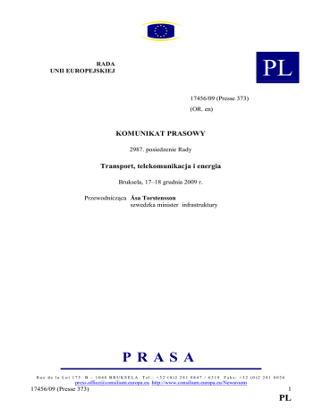 PL RADA UII EUROPEJSKIEJ 17456/09 (Presse 373) (OR. en) KOMUIKAT PRASOWY 2987. posiedzenie Rady Transport, telekomunikacja i energia Bruksela, 17–18 grudnia 2009 r. Przewodnicząca Åsa Torstensson szwedzka minister infrastruktury PRASA Rue de la Loi 175 B – 1048 BRUKSELA T el.: +32 (0)2 281 8847 / 6319 Fak s: +32 (0 )2 281 8026 [email protected] http://www.consilium.europa.eu/Newsroom 17456/09 (Presse 373) 1 PL 17.-18.XII.2009 Główne wyniki posiedzenia Rady W odniesieniu do transportu: Rada osiągnęła porozumienie polityczne w sprawie projektu rozporządzenia dotyczącego praw pasaŜerów w transporcie autobusowym i autokarowym. Ponadto uzgodniła ona ogólne podejście dotyczące projektu rozporządzenia w sprawie Europejskiej Agencji Globalnego Systemu Nawigacji Satelitarnej (GNSS) oraz ogólne podeście w odniesieniu do projektu dyrektywy w sprawie formalności sprawozdawczych dla statków wchodzących do lub wychodzących z portów UE. Rada upowaŜniła Komisję do wynegocjowania umowy o współpracy z Organizacją Międzynarodowego Lotnictwa Cywilnego (ICAO) oraz dokonała przeglądu postępów w drugim etapie negocjacji ze Stanami Zjednoczonymi Ameryki w sprawie usług lotniczych. W odniesieniu do telekomunikacji: Rada przeprowadziła debatę orientacyjną dotyczącą przyszłości strategii i2010 oraz przyjęła konkluzje w tej sprawie. Przyjęła równieŜ konkluzje w sprawie przekształcenia dywidendy cyfrowej w korzyści społeczne i wzrost gospodarczy oraz rezolucję w sprawie wspólnego europejskiego podejścia do bezpieczeństwa sieci i informacji. 17456/09 (Presse 373) 2 PL 17.-18.XII.2009 SPIS TREŚCI1 UCZESTICY .............................................................................................................................. 5 OMAWIAE PUKTY TRANSPORT LĄDOWY ............................................................................................................... 7 Prawa pasażerów w transporcie autobusowym i autokarowym ........................................................ 7 KWESTIE INTERMODALNOŚCI I SIECI INTERMODALNE .................................................... 9 Europejska Agencja Globalnego Systemu Nawigacji Satelitarnej (GNSS)....................................... 9 Inteligentne systemy transportowe ................................................................................................ 10 Zrównoważona przyszłość transportu – konkluzje prezydencji...................................................... 12 LOTNICTWO............................................................................................................................... 17 Opłaty za ochronę lotnictwa.......................................................................................................... 17 Umowa o współpracy z ICAO....................................................................................................... 18 Drugi etap negocjacji ze Stanami Zjednoczonymi Ameryki w sprawie usług lotniczych................ 19 ŻEGLUGA ................................................................................................................................... 20 Formalności sprawozdawcze dla statków ...................................................................................... 20 TELEKOMUNIKACJA................................................................................................................ 21 Strategia i2010 w przyszłości – konkluzje Rady............................................................................. 21 Dywidenda cyfrowa – konkluzje Rady........................................................................................... 22 Bezpieczeństwo sieci i informacji ................................................................................................. 22 SPRAWY RÓŻNE........................................................................................................................ 24 TRANSPORT ............................................................................................................................... 24 TELEKOMUNIKACJA................................................................................................................ 26 1 Jeżeli deklaracje, konkluzje lub rezolucje zostały przez Radę formalnie przyjęte, jest to zaznaczone w tytule danego punktu, a tekst jest umieszczony w cudzysłowie. Dokumenty, do których odesłano w tekście, są dostępne na internetowej stronie Rady (http://www.consilium.europa.eu). Gwiazdką oznaczono akty przyjęte wraz z oświadczeniami do protokołu Rady przeznaczonymi do wiadomości publicznej; oświadczenia te można znaleźć na wyżej wspomnianej internetowej stronie Rady lub uzyskać z biura prasowego. 17456/09 (Presse 373) 3 PL 17.-18.XII.2009 PRZY OKAZJI POSIEDZENIA RADY: ...................................................................................... 27 IE ZATWIERDZOE PUKTY TRANSPORT – Wytyczne dotyczące rozwoju transeuropejskiej sieci transportowej ..................................................................28 STOSUNKI ZEWNĘTRZNE – Rada Współpracy EU – Mołdawia ...................................................................................................................28 ŚRODOWISKO – Przemieszczanie odpadów – procedura regulacyjna połączona z kontrolą .........................................................29 ROZWÓJ – Wkład państw członkowskich na finansowanie Europejskiego Funduszu Rozwoju w 2011 roku .......................29 RYNEK WEWNĘTRZNY – Homologacja typu pojazdów silnikowych – maszyny jezdne nieporuszające się po drogach – procedura komitetowa .....................................................................................................................................................29 POLITYKA HANDLOWA – Środki antydumpingowe – roztwory mocznika i azotanu amonu – skóra zamszowa .........................................