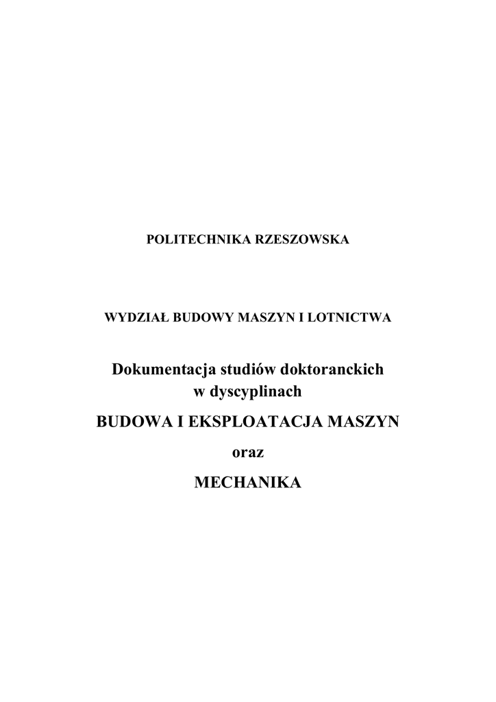 POLITECHNIKA RZESZOWSKA WYDZIAŁ BUDOWY MASZYN I LOTNICTWA Dokumentacja studiów doktoranckich w dyscyplinach BUDOWA I EKSPLOATACJA MASZYN oraz MECHANIKA 1. SYLWETKA ABSOLWENTA Studia doktoranckie jako trzeci etap kształcenia kadry naukowo-technicznej, przeznaczone są dla dobrze przygotowanych absolwentów studiów magisterskich o kierunku mechanicznym, którzy wykazują duże zaangażowanie w zakresie realizacji prac naukowo-badawczych. Pomagają one w realizacji rozprawy doktorskiej i przygotowują do jej obrony, co jest podstawą do nadania uczestnikom studiów stopnia doktora nauk technicznych. Absolwent studiów doktoranckich, który obronił rozprawę doktorską posiada zaawansowaną, aktualną wiedzę o charakterze teoretycznym i praktycznym związaną z obszarem prowadzonych badań, jak również potrafi rozwiązywać złożone zadania i problemy związane z reprezentowaną dyscypliną naukową. Posiada ponadto wiedzę dotyczącą metodyki oraz prawnych i ekonomicznych uwarunkowań prowadzenia badań naukowych, a także potrafi dokumentować wyniki prac badawczych oraz przygotowywać publikacje naukowe. Potrafi także skutecznie porozumiewać się w środowisku naukowym i zawodowym oraz wykorzystywać praktycznie metody badawcze właściwe dla dyscypliny naukowej w której prowadził badania. Dodatkowo ma wiedzę i umiejętności praktyczne w zakresie metodyki i nowoczesnych technik prowadzenia zajęć dydaktycznych. Po uzyskaniu stopnia doktora uczestnik studiów doktoranckich jest wszechstronnie przygotowany do wykonywania pracy naukowo-dydaktycznej w uczelniach wyższych i innych jednostkach naukowo-badawczych, a także do wykonywania zaawansowanych prac badawczo-rozwojowych w zakładach przemysłowych. 2. RAMOWY PROGRAM STUDIÓW Przedmiot W- wykład S- seminarium K- konwersatorium I. Przedmioty podstawowe 1. Wybrane zagadnienia z matematyki W I rok IV rok 45 E 2. Wybrane zagadnienia z mechaniki W 3. Techniki informatyczne S II rok III rok semestry 15 Z 30 E 15 Z II. Przedmioty kierunkowe * 1. Wybrane zagadnienia z budowy i eksploatacji maszyn W 2. Wybrane zagadnienia z technologii maszyn W 60 Suma ECTS 45 4 30 3 30 3 60 6 90 20 6 2 60 2 15 1 60 5 15 1 20 2 15 1 III. Przedmioty specjalistyczne z zakresu rozprawy doktorskiej * 1. Seminarium doktoranckie S 2. Wykład monograficzny 3. Konsultacje indywidualne tematu i zakresu pracy doktorskiej IV. Konwersatoria, seminaria, praktyki 1. Filozofia lub ekonomia S 2. Język obcy z zakresu terminologii technicznej K 3. Metodologia prowadzenia pracy naukowo-badawczej S 4. Nowoczesne techniki prowadzenia zajęć dydaktycznych S 5. Prawne i etyczne aspekty działalności naukowej 6. Ekonomiczne aspekty działalności naukowej 7. Zajęcia dydaktyczne doktoranta Razem godzin w roku 1.Wszczęcie przewodu doktorskiego 2.Zakończenie pracy doktorskiej 3.Obrona pracy doktorskiej 15 Z 30 30 30 Z 30 E 15 Z 15 Z 15 Z 15E 15Z 15E +5S 15Z 15Z +15 15Z ** 15Z+15 15Z 15Z 15 90 1 8 290 130 100 45 565 45 ** X * do wyboru przedmioty związane z kierunkiem pracy doktorskiej ** asystowanie w zajęciach E- egzamin Z- zaliczenie 15 15 Z Z 20Z X X
