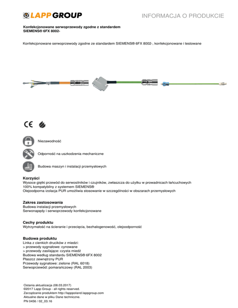 INFORMACJA O PRODUKCIE Konfekcjonowane serwoprzewody zgodne z standardem SIEMENS® 6FX 8002Konfekcjonowane serwoprzewody zgodne ze standardem SIEMENS® 6FX 8002-, konfekcjonowane i testowane Niezawodność Odporność na uszkodzenia mechaniczne Budowa maszyn i instalacji przemysłowych Korzyści Wysoce giętki przewód do serwosilników i czujników, zwłaszcza do użytku w prowadnicach łańcuchowych 100% kompatybilny z systemem SIEMENS® Olejoodporna izolacja PUR umożliwia stosowanie w szczególności w obszarach przemysłowych Zakres zastosowania Budowa instalacji przemysłowych Serwonapędy i serwoprzewody konfekcjonowane Cechy produktu Wytrzymałość na ścieranie i przecięcia, bezhalogenowość, olejoodporność Budowa produktu Linka z cienkich drucików z miedzi: > przewody sygnałowe: cynowane > przewody zasilające: czysta miedź Budowa według standardu SIEMENS® 6FX 8002 Płaszcz zewnętrzny PUR Przewody sygnałowe: zielone (RAL 6018) Serwoprzewód: pomarańczowy (RAL 2003) Ostania aktualizacja (08.03.2017) ©2017 Lapp Group - all rights reserved. Zarządzanie produktem http://lapppoland.lappgroup.com Aktualne dane w pliku Dane techniczne. PN 0456 / 02_03.16 INFORMACJA O PRODUKCIE Konfekcjonowane serwoprzewody zgodne z standardem SIEMENS® 6FX 8002- Uwaga Prosimy stosować się do wytycznych montażowych dotyczących przewodów przystosowanych do stosowania w prowadnicach łańcuchowych Maksymalna długość przewodów musi być zgodna z zaleceniami producentów napędów Dane techniczne odpowiadają zastosowaniu przewodów Budowa produktu Więcej wykonań i długości na zapytanie Dane techniczne Klasyfikacja: ETIM 5.0 Class-ID: EC000104 Opis klasy ETIM 5.0: Przewód sterowniczy Certyfikaty: Przewód zasilający: rejestracja VDE UL/CSA AWM Style 21223 CSA AWM I/II, A/B 1000 V 80° FT 1 Przewody sygnałowe: UL/CSA AWM Style 20236 Minimalny promień gięcia: Przewód zasilający: połączenia nieruchome: 4 x średnica połączenia ruchome: 1.5 mm² - 16 mm²: 7,5 x średnica 25 mm² - 50 mm²: 10 x średnica Przewód sygnałowy: połączenia nieruchome: 4 x średnica połączenia ruchome: 8 x średnica Napięcie nominalne: Przewody sygnałowe: 30 V AC (IEC)30 V AC/DC (UL/CSA) Przewody zasilające: żyły zasilające: U 0 /U 600/1000 V (IEC)1000 V (UL/CSA) żyły sterownicze:250 V AC (IEC)1000 V (UL/CSA) Zakres temperatury: Połączenia nieruchome: od -50°C do +80°C Połączenia ruchome: od -10°C do +60°C Wskazówka Wszystkie podane wartości dotyczące produktów są wartościami nominalnymi (o ile nie wskazano inaczej). Inne wartości, takie jak np. tolerancje mogą być przedstawione na zamówienie (jeżeli są dostępne i przeznaczone do publikacji). Nazwy produktów firmy Siemens (6FX5002/5008, 6FX7002/7008, 6FX8002/8008) są zarejestrowanymi znakami towarowymi firmy Siemens AG i służą tylko do celów porównawczych. DESINA® jest zastrzeżoną marką Związku Niemieckich Fabryk Obrabiarek Numer katalogowy odnosi się do oryginalnych produktów firmy LAPP Także inne wykonania oraz długości standardowe na zamówienie Fotografie nie mogą być używane do wymiarowania oraz nie stanowią szczegółowego odwzorowania przedstawionych produktów. * Podane ceny to ceny netto bez podatku VAT i dodatkowych opłat. Sprzedaż klientom biznesowym. Ostania aktualizacja (08.03.2017) ©2017 Lapp Group - all rights reserved. Zarządzanie produktem http://lapppoland.lappgroup.com Aktualne dane w pliku Dane techniczne. PN 0456 / 02_03.16 Powered by TCPDF (www.tcpdf.org) Długość [m] Oznaczenie według standardu SIEMENS® Oznaczenie przewodu według SIEMENS® Indeks miedzi [kg/1000 sztuk] Inne długości 70301568 10 6FX8002-2CF01-1BA0 6FX8008-1BD41 660 Inne odcinki na zapytanie 70430149 10 6FX8002-2DC00-1BA0 6FX8008-2DC00 410 Inne odcinki na zapytanie 70301586 10 6FX8002-5CA51-1BA0 6FX8008-1BB41 2710 Inne odcinki na zapytanie 70430008 10 6FX8002-5CS11-1BA0 6FX8008-1BB21 1280 Inne odcinki na zapytanie Konfekcjonowane serwoprzewody zgodne z standardem SIEMENS® 6FX 8002- Ostania aktualizacja (08.03.2017) ©2017 Lapp Group - all rights reserved. Zarządzanie produktem http://lapppoland.lappgroup.com Aktualne dane w pliku Dane techniczne. PN 0456 / 02_03.16 INFORMACJA O PRODUKCIE Powered by TCPDF (www.tcpdf.org) Numer katalogowy