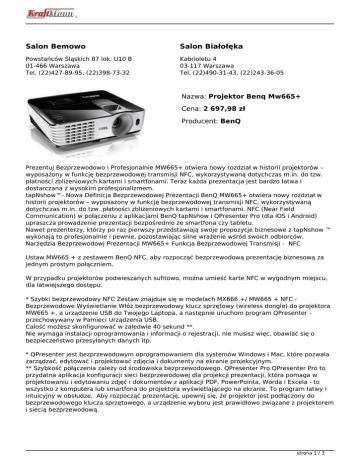 Salon Bemowo Salon Białołęka Powstańców Śląskich 87 lok. U10 B 01-466 Warszawa Tel. (22)427-89-95, (22)398-73-32 Kabrioletu 4 03-117 Warszawa Tel. (22)490-31-43, (22)243-36-05 Nazwa: Projektor Benq Mw665+ Cena: 2 697,98 zł Producent: BenQ Prezentuj Bezprzewodowo i Profesjonalnie MW665+ otwiera nowy rozdział w historii projektorów – wyposażony w funkcję bezprzewodowej transmisji NFC, wykorzystywaną dotychczas m.in. do tzw. płatności zbliżeniowych kartami i smartfonami. Teraz każda prezentacja jest bardzo łatwa i dostarczana z wysokim profesjonalizmem. tapNshow™- Nowa Definicja Bezprzewodowej Prezentacji BenQ MW665+ otwiera nowy rozdział w historii projektorów – wyposażony w funkcję bezprzewodowej transmisji NFC, wykorzystywaną dotychczas m.in. do tzw. płatności zbliżeniowych kartami i smartfonami. NFC (Near Field Communication) w połączeniu z aplikacjami BenQ tapNshow i QPresenter Pro (dla iOS i Android) upraszcza prowadzenie prezentacji bezpośrednio ze smartfona czy tabletu. Nawet prezenterzy, którzy po raz pierwszy przedstawiają swoje propozycje biznesowe z tapNshow ™ wykonają to profesjonalnie i pewnie, pozostawiając silne wrażenie wśród swoich odbiorców. Narzędzia Bezprzewodowj Prezentacji MW665+ Funkcja Bezprzewodowej Transmisji - NFC Ustaw MW665 + z zestawem BenQ NFC, aby rozpocząć bezprzewodową prezentację biznesową za jednym prostym połączniem. W przypadku projektorów podwieszanych sufitowo, można umieść karte NFC w wygodnym miejscu, dla łatwiejszego dostępu. * Szybki bezprzewodowy NFC Zestaw znajduje się w modelach MX666 +/ MW665 + NFC Bezprzewodowe Wyświetlanie Włóż bezprzewodowy klucz sprzętowy (wireless dongle) do projektora MW665 +, a urządzenie USB do Twojego Laptopa, a następnie uruchom program QPresenter przechowywany w Pamieci Urządzenia USB. Calość możesz skonfigurować w zaledwie 40 sekund **. Nie wymaga instalacji oprogramowania i informacji o rejestracji, nie musisz więc, obawiać się o bezpieczeństwo przesyłanych danych itp. * QPresenter jest bezprzewodowym oprogramowaniem dla systemów Windows i Mac, które pozwala zarządzać, edytować i projektować zdjęcia i dokumenty na ekranie projekcyjnym. ** Szybkość połączenia zależy od środowiska bezprzewodowego. QPresenter Pro QPresenter Pro to przydatna aplikacja konfiguracji sieci bezprzewodowej dla projekcji prezentacji, która pomaga w projektowaniu i edytowaniu zdjęć i dokumentów z aplikacji PDF, PowerPointa, Worda i Excela - to wszystko z komputera lub smartfona do projektora wyświetlającego na ekranie. To program łatwy i intuicyjny w obsłudze, Aby rozpocząć prezentację, upewnij się, że projektor jest podłączony do bezprzewodowego klucza sprzętowego, a urządzenie wyboru jest prawidłowo związane z projektorem i siecią bezprzewodową. strona 1 / 3 QPresenterPro - Android QPresenterPro - iOS Szybkie, Łatwe i Wszechstronne Funkcje Korekcji Obrazu 2D Keystone Regulacja obrazu w pionie i poziomie, wszystko po to, aby skorygować zniekształcenia trapezowe (efekt spowodowany, gdy projektor jest przechylony lub umieszczone poza centrum wyświtlania) wyrównując kąty dla uzyskania prawidłowej geometrii obrazu. Corner Fit Regulacja geometrii obrazu w pionie i poziomie (Keystone) oraz indywidualna korekcja położenia każdego narożnika obrazu (Corner Fit) umożliwia uzyskanie prawidłowej geometrii obrazu praktycznie w każdych warunkach. Ułatwia to zarówno instalację jak i codzienną eksploatację w różnych warunkach lokalowych. Genialna Jakość Obrazu Wysoki kontrast Wysoki współczynnik kontrastu zapewnia, że każdy tekst, obraz, wykres i wideo jest wyświetlane z optymalną jasnością i zwiększoną ostrością, zwłaszcza w przypadku danych liczbowych. To jest bardzo ważne dla prezenterów, aby publicznośc mogła zobaczyć pliki prezentacji jasno i wyrażnie, a przede wszystkim, mogła skupić się na treści wyświetlanych informacji. Wysoka Jasność Wysoka jasność projektora zapewnia wyświetlenie każdej prezentacji w jasnych odcieniach i wysokiej przejrzystość - nawet w stosunkowo jasnym otoczeniu. Niezależna Kontrola 2D Kolorów dla 6 Podstawowych Barw To narzędzie zarządzania kolorami pozwala na indywidualne dostrojenie, wzmocnienie nasycenia odcienia sześciu podstawowych kolorów (R / G / B / C / M / Y). * Zgodnie z projekcją obrazu 2D Funkcje Oszczędności Kosztów BenQ Technologia SmartEco™ Koszty wymiany lampy projektora tworzą największą część całkowitych kosztów eksploatacji projektora. W projektorach zastosowano rozwiązanie BenQ SmartEco - polegające na analizie wyświetlanego obrazu i bieżącej optymalizacji mocy lampy, tak aby uzyskać jak najlepszy obraz przy jak najmniejszym poborze prądu. Pozwala to nie tylko oszczędzać energię ale i wydłuża żywotność lampy, * Tryb SmartEco - do 70% oszczędności zużycia energii Tryb Eko Blank Tryb Eco Blank pozwala nauczycielom na brak podświetlenia ekranu projekcyjnego, w momencie gdy bezpośrednio chcą skupić uwagę swoich uczniów na swoim wykładzie - lub po prostu, gdy projektor nie jest używany. Po włączeniu tej funkcji moc lampy jest przyciemniona automatycznie, a dzięki temu, obniżeniu ulega całkowite zużycie energii elektrycznej nawet o 70%. Pełna Moc Lampy Uwaga Skupiona na Ekranie Tryb Eco Blank 30% Projekcja Lampy Uwaga Skupiona na Nauczycielu Tryb SmartEko: Mądre Zarządzanie Energią Wykrywając zawartość wejściową w celu określenia ilości wymaganej jasności potrzebnej do optymalnego wyświetlania barwy i działania kontrastu, Tryb SmartEco jest w stanie zmniejszyć siłę natężenia lampy, zapewniając jednocześnie doskonałą jakość obrazu. Tutaj nie ma żadnych kompromisów! Tryb Normalny 296W Zużycie Energii Tryb SmartEco 163W Zużycie Energii (Źródło: 2010 Philips white paper) Tryb Braku Sygnału Źródłowego Są takie chwile w pracy projektora, gdy projektor jest włączon