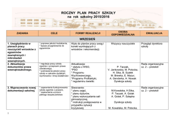 ROCZNY PLAN PRACY SZKOŁY na rok szkolny 2015/2016 ZADANIA CELE FORMY REALIZACJI OSOBA ODPOWIEDZIALNA EWALUACJA WRZESIEŃ 1. Uwzględnienie w planach pracy nauczycieli wniosków z egzaminów zewnętrznych i mikrobadań wewnętrznych. 2. Aktualizacja dokumentów prawa wewnątrzszkolnego. * poprawa jakości kształcenia, * lepsze przygotowanie do egzaminów Wpis do planów pracy uwag i korekt wynikających z wniosków i rekomendacji. * regulacja pracy szkoły zgodnie z przepisami prawa oświatowego, * podniesienie jakości pracy szkoły w zakresie dydaktyki, wychowania i innej działalności Aktualizacja: * statutu z WSO, *PSO * Programu Wychowawczego, *Programu Profilaktyki, * regulaminu świetlic 3. Wypracowanie nowej dokumentacji szkolnej. * zapewnienie funkcjonowania szkoły zgodnie z prawem, * zapewnienie uczniom pełnego bezpieczeństwa Stworzenie: * planu zajęć, * planu dyżurów, * planu wykorzystania sali gimnastycznej, * instrukcji postępowania w przypadku sytuacji kryzysowej 1 Wszyscy nauczyciele P. Taczak, V. Jankowska, M. Potocka, H. Sika, B. Szałek M. Brewka, E. Mazur, A. Genderka, H. Nowak Dyrekcja szkoły M.Kowalska, H.Sika, P. Taczak, A. Golak A. Golak, P. Szłapka Dyrekcja szkoły M. Kowalska, M. Potocka, Przegląd dyrektora szkoły Rada organizacyjna cz. 2 – protokół Rada organizacyjna cz. 2 – protokół * wieloletniego planu doskonalenia zawodowego * zebrania z rodzicami, * godziny wychowawcze, * aktualizacja strony internetowej szkoły 4. Zapoznanie uczniów i rodziców ze zmodyfikowaną dokumentacją szkolną. * usprawnienie współpracy między szkołą i rodzicami, * ujednolicenie sposobu współdziałania 5. Wypracowanie wzoru dokumentu potwierdzającego wolę rodziców na udział dziecka w różnych aspektach życia szkolnego. 6. Poprawa bezpieczeństwa w pobliżu szkoły. * ujednolicenie informacji zwrotnych, * tworzenie klimatu wzajemnej współpracy Stworzenie jednolitego dokumentu. * podniesienie poziomu bezpieczeństwa w pobliżu szkoły * rozbiórka budynku gospodarczego przy szkole, * modernizacja parkingu wewnętrznego * aktywizowanie rodziców i młodzieży do działań na rzecz środowiska szkolnego i lokalnego * komunikat do rodziców poprzez dziennik, * spotkanie rekrutacyjne z uczniami 8. Organizacja Dnia Chłopca. * podtrzymanie tradycji, * doskonalenie współpracy w grupie, * utrwalanie więzi koleżeńskich * apel okolicznościowy, * spotkania w klasach, * dyskoteka, * zabawy, konkursy 9. Integracja uczniów klas pierwszych. * integracja zespołu klasowego, * przełamanie onieśmielenia, * budzenie w uczniach odpowiedzialności za atmosferę w klasie poprzez tworzenie pozytywnych relacji nacechowanych życzliwością i zaufaniem Wyjazd jednodniowy. 7. Poszerzenie bazy danych wolontariuszy. 2 M. Mąderek, B. Porczak, K. Borowska, W. Żołnierek Wychowawcy, Wpisy w dzienniku Opiekun ICIM E. Lachendro Podpisy rodziców Dyrekcja szkoły Wychowawcy, Lista wolontariuszy Koordynator wolontariatu Opiekunowie samorządu, wychowawcy klas i oddz. przedszkolnych * strona internetowa szkoły, * wpisy w dzienniku, * prasa, program TV Wychowawcy klas pierwszych * strona internetowa szkoły, * wpisy w dzienniku 10. Wyposażenie uczniów w darmowe podręczniki. 11. Akcja „Bezpiecznie na drodze”. * regulacja pracy szkoły zgodnie z wytycznymi MEN Wydanie podręczników uczniom * zwiększenie poczucia bezpieczeństwa osobistego dzieci, * przeciwdziałanie zagrożeniom komunikacyjnym * wyjazd uczniów klas 1 SP do Śremu, * spotkanie z policją, strażą miejską oraz „Pyrkiem” Koordynator ds. * potwierdzenie podręczników, wychowawcy odbioru Wychowawcy klas 1 SP * strona internetowa szkoły, * wpisy w dzienniku * prasa, program TV Wychowawcy klas pierwszych oraz K. Ignaszewska, M. Kowalska, B. Porczak * strona internetowa szkoły, * wpisy w dzienniku * prasa, program TV H. Nowak * strona internetowa szkoły, * wpisy w dzienniku, * prasa, program TV Wszyscy nauczyciele * strona internetowa szkoły, * wpisy w dzienniku * prasa, program TV PAŹDZIERNIK 1. Ślubowanie uczniów klas pierwszych (SP i GIM) * włączenie uczniów klas pierwszych do społeczności szkolnej ZSPIG w Nochowie, *integracja środowiska szkolnego i domowego ucznia * apel okolicznościowy, * spotkanie z rodzicami 2. Pasowanie na Przedszkolaka (oddział przedszkolny w Wyrzece). * włączenie dzieci przedszkolnych do społeczności naszej szkoły, * integracja * uroczyste przyjęcie nowych dzieci do grupy przedszkolnej 3. Święto Edukacji Narodowej – Dzień Nauki Inaczej. * poszerzanie wiedzy o życiu patrona, * integracja społeczności szkolnej, * wzbudzanie szacunku do pracowników oświaty * przybliżenie uczniom osoby Jana Pawła II i jego roli we współczesnym świecie * nauka poprzez zabawę, * wyjazd edukacyjny Pielgrzymka do Łagiewnik. Katecheci * strona internetowa szkoły, * wpisy w dzienniku * prasa, program TV * zwrócenie uwagi na rolę biblioteki szkolnej w życiu szkoły, w nauce i rozwijaniu zainteresowań czytelniczych * spotkania biblioteczne, * konkursy czytelnicze, * pasowanie na czytelnika, * akcja „Cała Społeczność czyta dzieciom” Wychowawcy klas pierwszych SP, bibliotekarz, Ł. Borysewicz, M. DudziakKociałkowska * strona internetowa szkoły, * wpisy w dzienniku * prasa, program TV 4. Dzień poświęcony Świętemu Janowi Pawłowi II. (23 X). 5. Październik Miesiącem Bibliotek Szkolnych. 3 6. Rajd Pieczona Pyra. 7. Porządkowanie mogił żołnierskich. * aktywne spędzanie czasu, propagowanie ruchu i przebywania na świeżym powietrzu * integracja zespołów klasowych * rozwijanie uczuć patriotycznych, * wyrabianie szacunku do miejsc pamięci narodowej * marsz w terenie, * konkursy, * gry, zabawy Nauczyciele WF oraz M. Kowalska, M. Brewka, K. Borowska * strona internetowa szkoły, * wpisy w dzienniku, * prasa, program TV Wyjazd na cmentarz uczniów klas 1-3 SP Wychowawcy klas 1-3 SP * strona internetowa szkoły, * wpisy w dzienniku, * prasa, 
