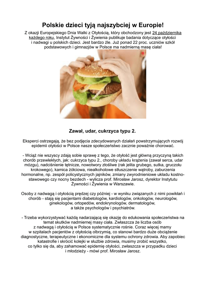 Polskie dzieci tyją najszybciej w Europie! Z okazji Europejskiego Dnia Walki z Otyłością, który obchodzony jest 24 października każdego roku, Instytut Żywności i Żywienia publikuje badania dotyczące otyłości i nadwagi u polskich dzieci. Jest bardzo źle. Już ponad 22 proc. uczniów szkół podstawowych i gimnazjów w Polsce ma nadmierną masę ciała! Zawał, udar, cukrzyca typu 2. Eksperci ostrzegają, że bez podjęcia zdecydowanych działań powstrzymujących rozwój epidemii otyłości w Polsce nasze społeczeństwo zacznie poważnie chorować. - Wciąż nie wszyscy zdają sobie sprawę z tego, że otyłość jest główną przyczyną takich chorób przewlekłych, jak: cukrzyca typu 2., choroby układu krążenia (zawał serca, udar mózgu), nadciśnienie tętnicze, nowotwory złośliwe (rak jelita grubego, sutka, gruczołu krokowego), kamica żółciowa, niealkoholowe stłuszczenie wątroby, zaburzenia hormonalne, np. zespół policystycznych jajników, zmiany zwyrodnieniowe układu kostnostawowego czy nocny bezdech - wylicza prof. Mirosław Jarosz, dyrektor Instytutu Żywności i Żywienia w Warszawie. Osoby z nadwagą i otyłością prędzej czy później - w wyniku związanych z nimi powikłań i chorób - stają się pacjentami diabetologów, kardiologów, onkologów, neurologów, ginekologów, ortopedów, endokrynologów, dermatologów, a także psychologów i psychiatrów. - Trzeba wykorzystywać każdą nadarzającą się okazję do edukowania społeczeństwa na temat skutków nadmiernej masy ciała. Zwłaszcza że liczba osób z nadwagą i otyłością w Polsce systematycznie rośnie. Coraz więcej mamy w szpitalach pacjentów z otyłością olbrzymią, co stanowi bardzo duże obciążenie diagnostyczne, terapeutyczne i ekonomiczne dla systemu ochrony zdrowia. Aby zapobiec katastrofie i skrócić kolejki w służbie zdrowia, musimy zrobić wszystko, co tylko się da, aby zahamować epidemię otyłości, zwłaszcza w przypadku dzieci i młodzieży - mówi prof. Mirosław Jarosz.