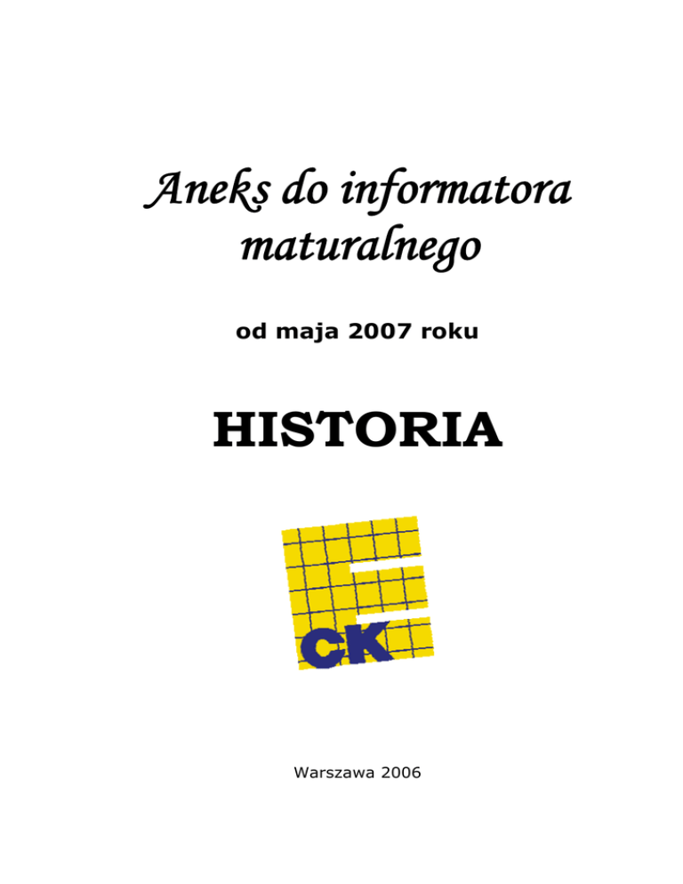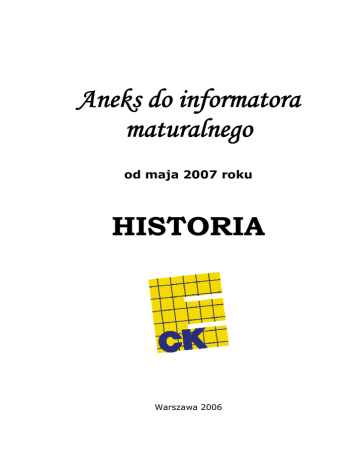 Aneks do informatora maturalnego od maja 2007 roku HISTORIA Warszawa 2006 Opracowano w Centralnej Komisji Egzaminacyjnej we współpracy z okręgowymi komisjami egzaminacyjnymi IV. STRUKTURA I FORMA EGZAMINU Egzamin maturalny z historii jest egzaminem pisemnym sprawdzającym wiadomości umiejętności określone w Standardach wymagań egzaminacyjnych i polega na rozwiązaniu zadań egzaminacyjnych zawartych w arkuszach egzaminacyjnych. Opis egzaminu z historii wybranej jako przedmiot obowiązkowy Historia jako przedmiot obowiązkowy może być zdawana na poziomie podstawowym albo na poziomie rozszerzonym. Wyboru poziomu zdający dokonuje w deklaracji, którą ma obowiązek złożyć do dnia 30 września roku szkolnego, w którym zamierza przystąpić do egzaminu maturalnego. 1. Egzamin na poziomie podstawowym trwa 120 minut i polega na rozwiązaniu testu, obejmującego cały zakres wymagań egzaminacyjnych. Zdający otrzymuje arkusz egzaminacyjny zawierający różnego rodzaju zadania: zadania zamknięte (wielokrotnego wyboru, na dobieranie, typu „prawda – fałsz”) i zadania otwarte, które wymagają samodzielnego formułowania zwięzłych odpowiedzi. Większość stanowią zadania z tzw. wyposażeniem, a więc z wykorzystaniem krótkiego tekstu źródłowego, ilustracji (ikonografii), mapy, danych statystycznych i innych źródeł wiedzy historycznej. Zadania w arkuszu uwzględniają historię polityczną, historię społecznogospodarczą oraz historię kultury ze wszystkich epok historycznych (starożytność, średniowiecze, czasy nowożytne, wiek XIX, wiek XX). Zadania sprawdzają umiejętności opisane we wszystkich standardach dla poziomu podstawowego. 2. Egzamin na poziomie rozszerzonym trwa 180 minut i składa się z trzech części. Wszystkie części zdawane są jednego dnia. Pomiędzy częściami egzaminu nie ma przerwy. Zdający otrzymuje jeden arkusz egzaminacyjny, w którym: a) część pierwsza polega na rozwiązaniu testu obejmującego cały zakres wymagań egzaminacyjnych. Zdający otrzymuje zestaw różnego rodzaju zadań: zamkniętych (wielokrotnego wyboru, na dobieranie, typu „prawda – fałsz”) i otwartych, które wymagają samodzielnego formułowania zwięzłych odpowiedzi. Większość stanowią zadania z tzw. wyposażeniem, a więc z wykorzystaniem krótkiego tekstu źródłowego, ilustracji (ikonografii), mapy, danych statystycznych i innych źródeł wiedzy historycznej. Zadania w tej części uwzględniają historię polityczną, historię społeczno-gospodarczą oraz historię kultury ze wszystkich wielkich epok historycznych (starożytność, średniowiecze, czasy nowożytne, wiek XIX, wiek XX) i sprawdzają umiejętności opisane we wszystkich standardach dla poziomu podstawowego i rozszerzonego b) część druga sprawdza umiejętności pracy z materiałem źródłowym, w tym umiejętności interpretowania i syntetyzowania. Zdający otrzymuje w tej części materiały źródłowe i zadania, które podejmują wybrane zagadnienie historyczne. Zdający udziela odpowiedzi na pytania do podanych w arkuszu różnorodnych źródeł wiedzy historycznej (źródła pisane, ikonograficzne, statystyczne, kartograficzne i inne) z co najmniej dwóch wielkich epok historycznych c) część trzecia sprawdza umiejętności formułowania wypowiedzi pisemnej, przedstawiania oraz oceniania zjawisk i procesów historycznych. W tej części egzaminu zdający pisze własny spójny tekst na jeden spośród dwóch tematów do wyboru. Tematy zaproponowane jako zadanie rozszerzonej odpowiedzi są zgodne z zagadnieniem głównym arkusza, ale obejmują problemy z innych epok historycznych niż zamieszczone materiały źródłowe. Zadanie rozszerzonej odpowiedzi sprawdza umiejętności opisane we wszystkich standardach. 3 Opis egzaminu z historii wybranej jako przedmiot dodatkowy Historia wybrana jako przedmiot dodatkowy jest zdawana na poziomie rozszerzonym. Egzamin na poziomie rozszerzonym trwa 180 minut i składa się z trzech części. Wszystkie części zdawane są jednego dnia. Pomiędzy częściami egzaminu nie ma przerwy. Zdający otrzymuje jeden arkusz egzaminacyjny, w którym: a) część pierwsza polega na rozwiązaniu testu obejmującego cały zakres wymagań egzaminacyjnych. Zdający otrzymuje zestaw różnego rodzaju zadań: zamkniętych (wielokrotnego wyboru, na dobieranie, typu „prawda – fałsz”) i otwartych, które wymagają samodzielnego formułowania zwięzłych odpowiedzi. Większość stanowią zadania z tzw. wyposażeniem, a więc z wykorzystaniem krótkiego tekstu źródłowego, ilustracji (ikonografii), mapy, danych statystycznych i innych źródeł wiedzy historycznej. Zadania w tej części uwzględniają historię polityczną, historię społeczno-gospodarczą oraz historię kultury ze wszystkich wielkich epok historycznych (starożytność, średniowiecze, czasy nowożytne, wiek XIX, wiek XX) i sprawdzają umiejętności opisane we wszystkich standardach dla poziomu podstawowego i rozszerzonego b) część druga sprawdza umiejętności pracy z materiałem źródłowym, w tym umiejętności interpretowania i syntetyzowania. Zdający otrzymuje w tej części materiały źródłowe i zadania, które podejmują wybrane zagadnienie historyczne. Zdający udziela odpowiedzi na pytania do podanych w arkuszu różnorodnych źródeł wiedzy historycznej (źródła pisane, ikonograficzne, statystyczne, kartograficzne i inne) z co najmniej dwóch wielkich epok historycznych c) część trzecia sprawdza umiejętności formułowania wypowiedzi pisemnej, przedstawiania oraz oceniania zjawisk i procesów historycznych. W tej części egzaminu zdający pisze własny spójny tekst na jeden spośród dwóch tematów do wyboru. Tematy zaproponowane jako zadanie rozszerzonej odpowiedzi są zgodne z zagadnieniem głównym arkusza, ale obejmują problemy z innych epok historycznych niż zamieszczone materiały źródłowe. Zadanie rozszerzonej odpowiedzi sprawdza um