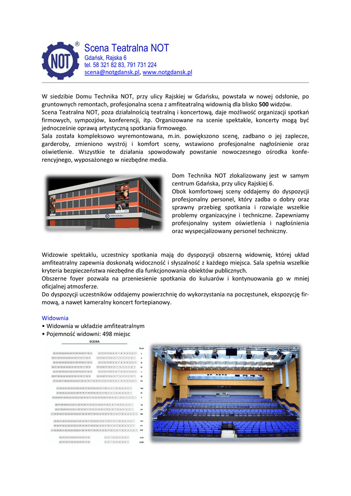 Scena Teatralna NOT Gdańsk, Rajska 6 tel. 58 321 82 83, 791 731 224 [email protected], www.notgdansk.pl W siedzibie Domu Technika NOT, przy ulicy Rajskiej w Gdańsku, powstała w nowej odsłonie, po gruntownych remontach, profesjonalna scena z amfiteatralną widownią dla blisko 500 widzów. Scena Teatralna NOT, poza działalnością teatralną i koncertową, daje możliwość organizacji spotkań firmowych, sympozjów, konferencji, itp. Organizowane na scenie spektakle, koncerty mogą być jednocześnie oprawą artystyczną spotkania firmowego. Sala została kompleksowo wyremontowana, m.in. powiększono scenę, zadbano o jej zaplecze, garderoby, zmieniono wystrój i komfort sceny, wstawiono profesjonalne nagłośnienie oraz oświetlenie. Wszystkie te działania spowodowały powstanie nowoczesnego ośrodka konferencyjnego, wyposażonego w niezbędne media. Dom Technika NOT zlokalizowany jest w samym centrum Gdańska, przy ulicy Rajskiej 6. Obok komfortowej sceny oddajemy do dyspozycji profesjonalny personel, który zadba o dobry oraz sprawny przebieg spotkania i rozwiąże wszelkie problemy organizacyjne i techniczne. Zapewniamy profesjonalny system oświetlenia i nagłośnienia oraz wyspecjalizowany personel techniczny. Widzowie spektaklu, uczestnicy spotkania mają do dyspozycji obszerną widownię, której układ amfiteatralny zapewnia doskonałą widoczność i słyszalność z każdego miejsca. Sala spełnia wszelkie kryteria bezpieczeństwa niezbędne dla funkcjonowania obiektów publicznych. Obszerne foyer pozwala na przeniesienie spotkania do kuluarów i kontynuowania go w mniej oficjalnej atmosferze. Do dyspozycji uczestników oddajemy powierzchnię do wykorzystania na poczęstunek, ekspozycję firmową, a nawet kameralny koncert fortepianowy. Widownia • Widownia w układzie amfiteatralnym • Pojemność widowni: 498 miejsc Scena • Scena jest umieszczona na wysokości 90 cm. • Posiada boczne kieszenie prawa/lewa • Posiada 2 pary schodów z poziomu widowni • Powierzchnia sceny: 88,4 m kw. • Pokrycie sceny: ciemno-szara wykładzina dywanowa • Horyzont czarny • Istnieje możliwość wypożyczenia podłogi baletowej Garderoby • 2 profesjonalne garderoby (10 stanowisk charakteryzatorskich) – Garderoba 105 – pow. 15,4 m kw. – Garderoba 110 – pow. 17,74 m kw. • Za dodatkową opłatą istnieje możliwość wypożyczenia i wyposażenia dodatkowych pomieszczeń na garderoby. Wyposażenie techniczne Dodatkowe wyposażenie techniczne Za dodatkowa opłatą możemy dostarczyć dodatkowy sprzęt techniczny, np. • mikrofony nagłowne • mikroporty • dodatkowe oświetlenie • dodatkowe nagłośnienie • projektory • ekrany • inne Dodatkowe usługi – płatne organizacja cateringu organizacja projekcji organizacja tłumaczenia symultanicznego oprawa artystyczna spotkania wynajem dodatkowych garderób obsługa montażu/demontażu zapewnienie specjalistycznej podłogi baletowej inne Działania marketingowe Podmiot wynajmujący Scenę może wykorzystać okazję spotkania do działań marketingowych, prosprzedażowych: branding Wynajmującego na miejscu wydarzenia: standy, plakaty, roll-up, inne oraz prezentacjaekspozycja firmy na foyer. Posiadamy Biuro Obsługi Widzów, gdzie sprzedamy Państwa bilety (za umówioną prowizję), wzmocnimy także działania promujące spektakl. Warunki wynajmu Sceny Scena Teatralna NOT oddaje Najemcy scenę, widownię, garderoby, foyer w ramach standardu wraz z wyposażeniem j.w. i obsługą j.w. Wszelkie dodatkowe usługi, wyposażenie, działania, itp. zlecone przez Wynajmującego odbywają się za dodatkową opłatą przed eventem. Całość kwoty wynajmu i obsługi musi zostać zapłacona do dnia eventu.
