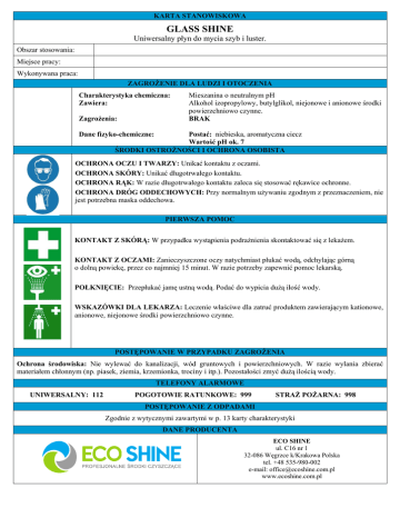 KARTA STANOWISKOWA GLASS SHINE Uniwersalny płyn płyn do mycia szyb i luster. luster Obszar stosowania: Miejsce pracy: Wykonywana praca: ZAGROŻENIE DLA LUDZI I OTOCZENIA Charakterystyka chemiczna: Zawiera: Zagrożenia: Mieszanina o neutralnym pH Alkohol izopropylowy, izopropylowy butylglikol butylglikol,, niejonowe i anionowe środki powierzchniowo czynne zynne. BRAK niebieska aromatyczna ciecz Postać: niebieska, Wartość pH ok. 7 ŚRODKI OSTROŻNOŚCI I OCHRONA OSOBISTA Dane fizyko-chemiczne: fizyko chemiczne: OCHRONA OCZU I TWARZY: Unikać kontaktu z oczami. OCHRONA SKÓRY: Unikać długotrwałego kontaktu. OCHRONA RĄK: W razie długotrwałego kontaktu zaleca się stosować rękawice ochronne. OCHRONA DRÓG ODDECHOWYCH: Przy normalnym używaniu zgodnym z przeznaczeniem, nie jest potrzebna maska oddechowa. PIERWSZA POMOC KONTAKT Z SKÓRĄ: W przypadku wystąpienia podrażnienia skontaktować się z lekażem. KONTAKT Z OCZAMI: Zanieczyszczone oczy natychmiast płukać wodą, odchylając górną o dolną powiekę, przez co najmniej 15 minut. W razie potrzeby zapewnić pomoc lekarską. POŁKNIĘCIE: Przepłukać rzepłukać jamę ustną wodą. Podać Podać do wypicia dużą ilość wody. WSKAZÓWKI DLA LEKARZA: Leczenie właściwe dla zatruć produkt produktem zawierającym kationowe, anionowe, niejonowe środki powierzchniowo czynne. POSTĘPOWANIE W PRZYPADKU ZAGROŻENIA Ochrona środowiska: Nie wylewać do kanalizacji, wód gruntowych i powierzchniowych. W razie wylania zbierać materiałem chłonnym (np. piasek, ziemia, krzemionka, trociny i itp.). Pozostałości zmyć dużą ilością wody. TELEFONY ALARMOWE UNIWERSALNY: 112 POGOTOWIE RATUNKOWE: 999 STRAŻ POŻARNA: 998 POSTĘPOWANIE Z ODPADAMI Zgodnie z wytycznymi zawartymi w p. 13 karty charakterystyki DANE PRODUCENTA ECO SHINE ul. C16 nr 1 32--086 086 Węgrzce k/Krakowa Polska tel. +48 535 535-980-002 e--mail: [email protected] www.ecoshine.com.pl