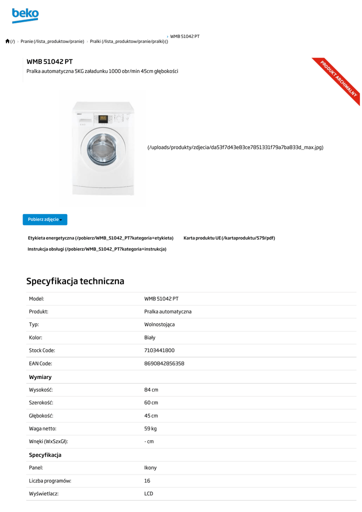 › WMB 51042 PT (/) › Pranie (/lista_produktow/pranie) › Pralki (/lista_produktow/pranie/pralki) () WMB 51042 PT Pralka automatyczna 5KG załadunku 1000 obr/min 45cm głębokości (/uploads/produkty/zdjecia/da53f7d43e83ce7851331f79a7ba833d_max.jpg) Pobierz zdjęcie Etykieta energetyczna (/pobierz/WMB_51042_PT?kategoria=etykieta) Karta produktu UE (/kartaproduktu/579/pdf) Instrukcja obsługi (/pobierz/WMB_51042_PT?kategoria=instrukcja) Specyfikacja techniczna Model: WMB 51042 PT Produkt: Pralka automatyczna Typ: Wolnostojąca Kolor: Biały Stock Code: 7103441800 EAN Code: 8690842856358 Wymiary Wysokość: 84 cm Szerokość: 60 cm Głębokość: 45 cm Waga netto: 59 kg Wnęki (WxSzxGł): - cm Specyfikacja Panel: Ikony Liczba programów: 16 Wyświetlacz: LCD Opóźnienie startu: 0-24 Grzałka niklowana: Tak Wskaźnik czasu do końca programu: Tak Kontrolki przebiegu programu: Tak Blokada przed dziećmi: Tak Regulacja prędkości wirowania: Tak System automatycznej kontroli zużycia wody: Tak Elektroniczny system wyważania wsadu: Tak AquaFusion: Tak System Overflow: Tak Funkcje dodatkowe Funkcja 1: Pranie wstępne Funkcja 2: Pranie ekspresowe Funkcja 3: Pupil Funkcja 4: Bez zagnieceń Parametry Rodzaj: Wolnostojąca Pojemność: 5 kg Klasa Efektywności Energetycznej: A++ Indeks Efektywności Energetycznej (EEI): 50,9 Roczne zużycie energii (AE_c) : 146 kWh Zużycie energii (E_t) : 0,636 kWh Zużycie energii na programie 60°C przy pełnym załadunku (E_t.60) : 0,736 kWh Zużycie energii na programie 40°C przy częściowym załadunku (E_t.40.1/2) : 0,515 kWh Czas prania na programie 40°C przy częściowym załadunku (T_t.40.1/2) : 129 min Zużycie wody (W_t) : 33 l Roczne zużycie wody (AW_c) : 7260 l Klasa Efektywności wirowania: C Wilgotność prania po zakończonym cyklu: 62 Maksymalna prędkość wirowania: 1000 Poziom Hałasu Prania/Wirowania : 59/71 dB Czas trwania programu (T_t) : 145 min Czas trwania programu 60 °C przy pełnym załadunku (T_t.60) : 159 min Zużycie energii na programie 60 °C przy częściowym załadunku (E_t.60.1/2) : 0,623 kWh Czas trwania programu na programie 60°C przy częściowym załadunku: 129 Zużycie energii w trybie Off : 0,2 W Zużycie energii w trybie czuwania (P_l) : 1W Czas trwania trybu czuwania (T_l) : min Programy Program 1: Bawełna (zimna woda-90) Program 2: Bawełna Eco Program 3: BabyProtect Program 4: Daily Express Program 5: Xpress Super Short Program 6: Freshen Up Program 7: Eco Clean 20 Program 8: Self Clean Program 9: Wirowanie+odpompowanie Program 10: Płukanie Program 11: Pranie ręczne Program 12: Wełna (zimna woda-40) Program 13: Dark Care Program 14: Shirt Program 15: Mix 40 Program 16: Syntetyczne (zimna woda-60) Wyjaśnienie 1: Zużycie energii na podstawie 220 cykli standardowych 60°C i 40°C w programie Bawełna, przy pełnym i częściowym załadunku. Rzeczywiste zużycie zależy od sposobu korzystania z urządzenia. Wyjaśnienie 2: Zużycie wody na podstawie 220 cykli standardowych 60°C i 40°C w programie Bawełna, przy pełnym i częściowym załadunku. Rzeczywiste zużycie zależy od sposobu korzystania z urządzenia. Wyjaśnienie 3: "Standardowy program prania tkanin bawełnianych w 60 °C” i „standardowy program prania tkanin bawełnianych w 40 °C” stanowią standardowe programy prania, do których odnoszą się informacje na etykiecie i w karcie, że są one odpowiednie do prania Technologie Klasa energetyczna A++ Dzięki zastosowaniu najnowszej technologii produkty z klasą efektywności energetycznej A++ to gwarancja bardzo niskiego zużycia energii, a produkty w tej klasie nie tylko pomogą podreperować budżet rodzinny, ale również dbają o środowisko naturalne. AquaFusion Podczas prania w standardowych pralkach około 20% detergentu jest nieefektywnie wypłukiwane z wodą. Innowacyjna technologia AquaFusionTM polega na zablokowaniu odpływu co zapobiega stratom proszku, tak że jest on wykorzystywany praktycznie w całości. Dzięki temu efektywność prania jest większa, a Ty oszczędzasz detergent i pieniądze podczas każdego prania. BabyProtect Program BabyProtect został specjalnie stworzony do higienicznego prania ubranek niemowlęcych i odzieży osób cierpiących na alergie skórne. Poprzez wydłużone pranie w wyższej temperaturze oraz dodatkowe i intensywne płukanie program eliminuje bakterie oraz zapewnia doskonałe rezultaty prania i całkowite wypłukanie środka piorącego, którego pozostałości są jedną z najczęstszych przyczyn alergii skórnych Program Dark Care Nie musisz dłużej martwić się o trwałość koloru swoich ciemnych ubrań. Pralki Beko posiadają specjalny program do prania wrażliwych na blaknięcie bawełnianych lub syntetycznych tkanin w ciemnych kolorach. Pranie przebiega w niskich temperaturach, przy łagodnych ruchach bębna i małej prędkości wirowania oraz zwiększonym poborze wody podczas cyklu płukania. Program Dark Care zaprogramowany jest dla połowy maksymalnego wkładu w zakresie temperatur 30°C 40°C. Do prania tkanin w ciemnych kolorach zaleca się używać przeznaczonych do tego celu płynnych detergentów lub środków do prania wełny. Funkcja Pupil Beko znalazło doskonałe rozwiązanie dla wszystkich miłośników zwierząt domowych a w szczególności włochatych pupili. Specjalna funkcja PUPIL w wybranych modelach pralek Beko doskonale usuwa sierść Twojego czworonożnego przyjaciela. Dzięki innowacyjnym technologiom zastosowanym w produktach firmy Beko, nie musisz wyskubywać czy wygotowywać sierści z pokrytych nią ubrań. W pralkach posiadających funkcję PUPIL postawiliśmy na wielokrotne płukanie i odwirowywanie tak, by Wasze ubrania po skończonym praniu były idealnie czyste. Ponadto dodatkowe podgrzewanie wody ma na celu skutecznie rozluźniać włókna tkanin przed samym procesem płukania tak, by jak największa ilość sierści mogła zostać skutecznie usunięta. Cykl prania, który został specjalnie zmodyfi