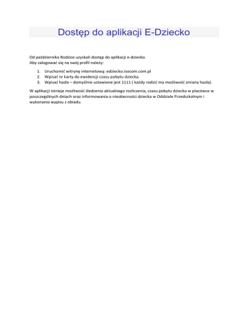 Dostęp do aplikacji E-Dziecko Od października Rodzice uzyskali dostęp do aplikacji e-dziecko. Aby zalogować się na swój profil należy: 1. Uruchomić witrynę internetową: edziecko.isocom.com.pl 2. Wpisać nr karty do ewidencji czasu pobytu dziecka. 3. Wpisać hasło – domyślnie ustawione jest 1111 ( każdy rodzić ma możliwość zmiany hasła). W aplikacji istnieje możliwość śledzenia aktualnego rozliczenia, czasu pobytu dziecka w placówce w poszczególnych dniach oraz informowania o nieobecności dziecka w Oddziale Przedszkolnym i wykonania wypisu z obiadu.