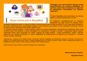 W zeszłym roku nasza świetlica szkolna została zakwalifikowana do programu MegaMisja. Od września część dzieci uczestniczy w zajęciach. W październiku otrzymaliśmy już pierwsze nagrody . Program MegaMisja jest odpowiedzią na potrzebę edukacji cyfrowej najmłodszych uczniów. W świetlicach zakwalifikowanych do programu MegaMisja cykl zajęć potrwa 10 miesięcy. Dzieci zdobędą kompetencje ważne w cyfrowym świecie, nauczą się jak chronić swoją prywatność w sieci, jakie treści publikować, jak unikać niebezpieczeństw, przestrzegać netykiety i praw autorskich, jak znaleźć w sieci wiarygodne informacje. Nauczą się także tworzyć i edytować proste grafiki, dźwięki i filmy. To wszystko poprzez zabawę - forma programu opiera się na grze edukacyjnej z animowanymi bohaterami, którzy mają mnóstwo pytań oraz kłopotów, a dzieci pomagają im je rozwiązywać. Pracując w grupach i podejmując kolejne zadania, zdobywają punkty, które zamieniają na „realne” nagrody dla swojej świetlicy - sprzęt multimedialny, książki, materiały plastyczne, gry, zabawki edukacyjne. Co ważne, MegaMisja nie polega jedynie na zajęciach przy komputerze - uczniowie rysują, wycinają i dyskutują. Organizatorem programu jest Fundacja Orange. Honorowym Patronem MegaMisji jest Ministerstwo Cyfryzacji. Partnerami merytorycznymi programu są: Fundacja Nowoczesna Polska, Fundacja Highlight/inaczej oraz Centrum Cyfrowe Projekt: Polska. Ambasadorami programu są: Magdalena Kumorek- aktorka, a także Grzegorz Kasdepke, autor książek dla dzieci. Więcej informacji można znaleźć na stronie internetowej www.megamisja.pl Wychowawczyni świetlicy, Agnieszka Sikora