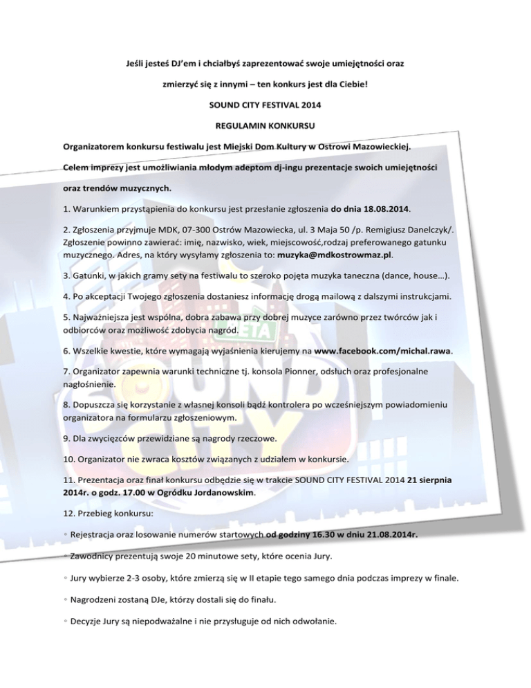 Jeśli jesteś DJ’em i chciałbyś zaprezentować swoje umiejętności oraz zmierzyć się z innymi – ten konkurs jest dla Ciebie! SOUND CITY FESTIVAL 2014 REGULAMIN KONKURSU Organizatorem konkursu festiwalu jest Miejski Dom Kultury w Ostrowi Mazowieckiej. Celem imprezy jest umożliwiania młodym adeptom dj-ingu prezentacje swoich umiejętności oraz trendów muzycznych. 1. Warunkiem przystąpienia do konkursu jest przesłanie zgłoszenia do dnia 18.08.2014. 2. Zgłoszenia przyjmuje MDK, 07-300 Ostrów Mazowiecka, ul. 3 Maja 50 /p. Remigiusz Danelczyk/. Zgłoszenie powinno zawierać: imię, nazwisko, wiek, miejscowość,rodzaj preferowanego gatunku muzycznego. Adres, na który wysyłamy zgłoszenia to: [email protected]. 3. Gatunki, w jakich gramy sety na festiwalu to szeroko pojęta muzyka taneczna (dance, house…). 4. Po akceptacji Twojego zgłoszenia dostaniesz informację drogą mailową z dalszymi instrukcjami. 5. Najważniejsza jest wspólna, dobra zabawa przy dobrej muzyce zarówno przez twórców jak i odbiorców oraz możliwość zdobycia nagród. 6. Wszelkie kwestie, które wymagają wyjaśnienia kierujemy na www.facebook.com/michal.rawa. 7. Organizator zapewnia warunki techniczne tj. konsola Pionner, odsłuch oraz profesjonalne nagłośnienie. 8. Dopuszcza się korzystanie z własnej konsoli bądź kontrolera po wcześniejszym powiadomieniu organizatora na formularzu zgłoszeniowym. 9. Dla zwycięzców przewidziane są nagrody rzeczowe. 10. Organizator nie zwraca kosztów związanych z udziałem w konkursie. 11. Prezentacja oraz finał konkursu odbędzie się w trakcie SOUND CITY FESTIVAL 2014 21 sierpnia 2014r. o godz. 17.00 w Ogródku Jordanowskim. 12. Przebieg konkursu: ◦ Rejestracja oraz losowanie numerów startowych od godziny 16.30 w dniu 21.08.2014r. ◦ Zawodnicy prezentują swoje 20 minutowe sety, które ocenia Jury. ◦ Jury wybierze 2-3 osoby, które zmierzą się w II etapie tego samego dnia podczas imprezy w finale. ◦ Nagrodzeni zostaną DJe, którzy dostali się do finału. ◦ Decyzje Jury są niepodważalne i nie przysługuje od nich odwołanie. 13. Jury będzie oceniać : ◦ technika (płynność przejść) ◦ oryginalność seta ◦ koncepcja i dynamika (ilość właściwie zmiksowanych utworów) 14. Jury konkursu (festiwalu): ◦ Andrzej Przesmycki (Fatum), ◦ Łukasz Wyszyński (Maddy Eshel), ◦ Michał Rawa (Rava), ◦ Piotr Krassowski (Xavier) 15. Pełna lista DJ-ów biorących udział w konkursie zostanie ogłoszona 19.08.2013. Aby wziąć udział w konkursie należy zapoznać się z regulaminem. Wysłanie zgłoszenia równa się akceptacji regulaminu konkursu. Sponsorem imprezy jest sklep „LFX Agency”. Najlepszy DJShop w Warszawie!!!