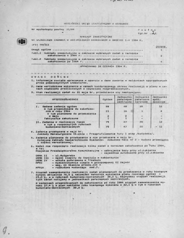 WOJEWÓDZKI UKZ40 STATYSTYCZNY W KRAKOWIE. Nr wychodzący poufny J1/U4 P o u f no Egz .Nr ,4>U. NAKŁADY INWESTYCYJNE NA WAŻNIEJSZE ZADANIA W WOJ.MIEJSKIM KRAKOWSKIM W OKRESIE I-V 1984 R. SPIS treSci Uwagi ogólne Strona ................................................ ........ 1 Tubl.l Nakłady inwestycyjno w zakresie wybranych zadań o terminie zakończenia w 1984 r..................... ....... ......... 2 Tubl.2 Nakłady inwestycyjne w zakresie wybranych zadań o terminie zakończenia po 1984 r. . ..................... ............. 4 OPRACOWANO 18 CZERWCA 1984 R. UWAGI OGÓLNE 1 Informacja została opracowana w oparciu o dane zawarte w meldunkach sporządzanych przez poszczególnych inwestorów. 2 Dane wartościowe wykonania w cenach każdorazowego okresu realizacji a planu w ce nach częściowo przeliczonych a częściowo nieprzeliczonych. 3 Start realizacji zadań nu 31 maja br. przedstawia się następująco t WYSZCZEGÓLNIENIE I. Badane zadania ogółem w tym przewidziane do zakończania w roku 19134 w tym planowane do przekazania w maju faktycznie zakończone II. Zadania w realizacji razem w tym o rozpoczętych robotach budowlano-montażowych Ogółem Jednostki państwowe centralne Jednostki państwowe terenowe Jednostki spół dzielcze 48 28 12 21 16 1 4 2 1 2 1 - - 79 47 20 12 79 47 20 88 • 12 4 Zadania przekazane w maju br. Zakłady Metalurgiczne Skupina - Przeprofilowanie huty X etap /końcówka/. 5 Zadania planowane do przekazania a nie przekazane w maju br. Kolejowe Zakłady Nawierzchniowe Bieżanów- dobudowa hali nr 2 - budowa przewiązki i części warsztatowej. 6 Nodal nie rozpoczęto realizacji kilku zadań z terminem zakończenia po roku 1984, a to i ' Miejskie Przedsiębiorstwo Komunikacyjne - uzbrojenie bazy przy ul.Łokietka - zajezdnia autobusowa przy ul.Łokietka - ul.Bułgarska DRMK IX - węzeł cieplny do Szpitala w Kobierzynie DRMK III - szkoła podstawowa w Trzebuni DRMK IV - wymiennikownia ciepła w przepompowni EC Uajwór MPEC - mag. EC Skawina przede.III A - rozbudowa wodociągu zad.7. MPWiK 7. Stopień zaawansowania realizacji zadań planowanych do przekazania w roku bieżącym wynosi aktualnie 76,5 % natomiast wskaźnik wykonania planu rocznego ogółem » , 25,0 %, a w robotach budowlano-montażowych 38,2 %. Najwyższy stopień realizacji tych zadań notujemy w Jednostkach państwowych centralnych. W zadaniach przewidzianych do zakończenia po roku 1984 stopień zaawansowania wy nosi 37,4 % a plan nakładów roku bieżącego wykonano w 32,1 % w tym w robotach budowlano-montażowych 32,2 %, V TABL.l NAKŁADY INWESTYCYONE W ZAKRESIE WYBRANYCH ZADAŃ O TERMINIE ZAKOŃCZENIA W 1984 R. Piano- INWESTOR - NAZWA ZADANIA termin zakoń czenia inwes tycji kosztorysowa ogółem Nakłady poniesłone od poczętku realiza cji do końca V/84 r. w tys.złotych % Nakłady od poczętku roku do końca okresu sp rawozdawczego nania na- ogółem roboty budowlano-montażowe % plan roczny wyko nanie - % wyko nania planu plan roczny wyko nanie W % w tys.złotych w % w tys .złotych wyko nanie planu Generalny wykonawca » % OGbŁEM X 5623165 4302988 76.5 1595274 398259 25.0 819659 313004 38.2 X Jednostki państwowe centralne X 4723415 3910744 82,8 1169697 338276 28,9 499526 254426 50,9 X IX 1984 175528 136689 77.9 39966 35522 88.9 28866 33383 115.6 X 1984 150000 128695 35,8 40125 18820 46.9 35515 18679 52.6 IX 1984 802187 790697 93.5 10000 27161 8000 24488 3x "Energoprzem" Kraków XII 1984 203500 175940 86.5 16478 3175 19.2 15278 2907 19,0 System gospo darczy XII 1984 161500 156513 96,9 6342 1355 21.4 5422 1324 24,4 System gospo darczy IX 1984 747580 717751 96.1 85000 40416 47,5 73570 30027 40,8 "Krakbud" XII 1984 339700 69430 20.4 306053 35783 11.7 23250 3867 16.6 "Energoprzem" IV 1984 430993 427373 99.2 20143 12388 61,5 9036 1546 17.1 "Stomil" XII 1984 867000 509175 58.7 458718 100893 22.0 176899 89634 50,7 "Budostal - 1" Min.Nauki 1 Szkolnictwa Wyższego Zarzęd Inwestycji Szkół Wyższych - stołówka studencko-pracown.AGH "Che mobudowa* Kraków Min.Górnictwa i Energetyki Zakład Energetyczny Kraków - budowa bazy zaplecza technicznego ZEK Zespół Elektrociepłowni - budowa EC Łęg IV etap zad .nr 1 2.7X Krak .Przede.Bud Przemysłowego Min.Hutnictwa i Przemysłu Maszynowego Krak.F-ka Kabli i Maszyn Kablow. - rozszerzenie produkcji deficy towych asortymentów kabli elekt roenergetycznych - rozszerzenie produkcji defi cytowych asortymentów prze wodów nawojowych Centrum Naukowo-Produkcyjne •Unitra-Telpod' - rozbudowa zakładu Zakłady Metalurgiczne Skawina - budowa Wydziału Produkcji Kół Jezdnych Min .Przem.Chemicznego i Lekkiego Krak.Z-dy Przem.Gum.‘Stomil* - intensyfikacja produkcji wyro bów gumowych.medyczno-sanitarn. Min.Budownictwa 1 Przemysłu Materiałów Budowlanych Krak.Przeds.Ceramiki Budowlanej - rozbudowa zakładu Zesławice I TASL.l HAKŁAOY IN*E5TYCY3H£ * ZAKRESIE WYSRANYCH ZOli : TE.RYZ*.ZE ZAKOŃCZENIA V. 1984 R. /^ok./ Kin .Rolnictwa i Gosp-Żywnościowe; Okręgowe Przede.Przee-Mięsnego - rozbudowa i modernizacja zakładu X 1964 Min-Koeunikacj1 Kolejowe Z-dy Nawierzchniowe Bieżanów V/VI - dobudowę hali nr 2 - budowa 1984 przewiązki i części warsztatowej Wyko— name na kła dów w % Nakłady oć początki sp rawcźdawczego ogółee plan roczny *y*>r.anie w tys .złotych wy«LO'■sr.is plaraj Śo 1 w tys.złotych % i INWESTOR - NAZWA ZADANIA * Xa<łacyj ponoeJ sicne eć ■ Wartość początku koszto realiza rysowa cji do ogołoć końca V/34 r. i V Plano wany termin zakoń czenia inwes tycji rooqrv sucoNiano-■or.tsżc • e ! % , ! 3-.an wyko wyko roczny nanie nania planu w % w tys.złotych Generalny ca w % <ra<TC6-3 . 121661 115176 54.6 12500 ' 7581 ’ 50,5 1200C 7448 62,1 101236 93162 52.0 13538 54 65 40,4 9490 5428 57,2 VIII 1964 160480 159754 59.5 1600 379 54,9 1600 456 28., 5 VI 1984 152580 145630 55.4 11549 4599 39,8 4000 3700 32,5 Z-ay Przemysłu Metal.-Crze. n. Myślenice VII 1984 178540 153394 36,0 67000 42362 63,2 39100 3