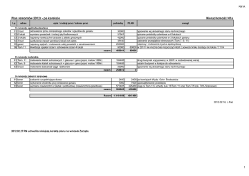 RN1A Nieruchomość N1a Plan remontów 2012r - po korekcie Lp 5 51 52 53 54 55 56 8 81 82 83 9 91 92 93 adres opis / rodzaj prac / zakres prac potrzeby remonty ogólnobudowlane odnowienie tynku mineralnego cokołów i zjazdów do garażu 5 bud 6 lokali wymiana posadzek i izolacji płyt balkonowych 3 lokale naprawy nawierzchni tarasów z płytek gresowych 3 bud wydłużenie nasad wentylacji lokali ost piętra garaż naprawy spękań i malowanie całej posadzki z oznakowaniami Tarn.11 likwidacja spękań ścian i odnowienie ścian 4 lokali razem: 30000 51941 42000 35100 250000 60000 469041 razem: 104406 104406 50000 258812 razem: 2400 7000 573405 582805 remonty malarskie Tarn. 11 malowanie klatek schodowych + glazura + gres (poprz malow 1999r) Tarn. 9 malowanie klatek schodowych + glazura + gres (poprz malow 1999r) 5 bud malowanie balustrad loggii i balkonów remonty zieleni i terenowe teren sadzenie uzupełniające drzew teren wykonanie chodnika przy stróżowce garażu teren wymiana nawierzchni z płytek i podbudowy (nawierzchnia granitowa) Razem 1 310 658 PLAN uwagi typowanie wg aktualnego stanu technicznego spisane protokóły usterkowe w 6 lokalach spisane protokóły usterkowe w 3 lokalach parteru zalecenie przeglądów okresowych (Tarn.7, 9, 11) naprawy i malowanie żywica epoksydową 60000 w 2011r nie można było rozpocząć robót z powodu braku dostepu do lokalu T.11/4 60000 drugi budynek wytypowany w 2007r w rozbudowanej wersji ostatni budynek w kolejce do odnowienia typowanie wg aktualnego stanu technicznego 0 2400 po komisjach Wydz. Ochr. Środowiska 7000 uporządkowanie przedeptu 426469 ciąg za Tarn.13 i schody Łuk.13/Tarn.11 oraz Tarn.7/9 (ok. 74% finansowo) 435869 495 869 2012.02.16, J.Paź 2012.02.27 RN uchwaliła niniejszą korektę planu na wniosek Zarządu 1