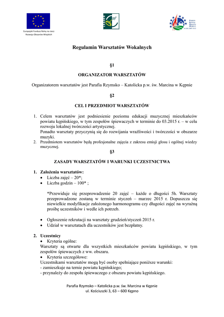 Europejski Fundusz Rolny na rzecz Rozwoju Obszarów Wiejskich Regulamin Warsztatów Wokalnych §1 ORGANIZATOR WARSZTATÓW Organizatorem warsztatów jest Parafia Rzymsko – Katolicka p.w. św. Marcina w Kępnie §2 CEL I PRZEDMIOT WARSZTATÓW 1. Celem warsztatów jest podniesienie poziomu edukacji muzycznej mieszkańców powiatu kępińskiego, w tym zespołów śpiewaczych w terminie do 03.2015 r. – w celu rozwoju lokalnej twórczości artystycznej. Ponadto warsztaty przyczynią się do rozwijania wrażliwości i twórczości w obszarze muzyki. 2. Przedmiotem warsztatów będą profesjonalne zajęcia z zakresu emisji głosu i ogólnej wiedzy muzycznej. §3 ZASADY WARSZTATÓW I WARUNKI UCZESTNICTWA 1. Założenia warsztatów: Liczba zajęć – 20*; Liczba godzin – 100* ; *Przewiduje się przeprowadzenie 20 zajęć – każde o długości 5h. Warsztaty przeprowadzone zostaną w terminie styczeń – marzec 2015 r. Dopuszcza się niewielkie modyfikacje założonego harmonogramu czy długości zajęć na wyraźną prośbę uczestników i wedle ich potrzeb. Ogłoszenie rekrutacji na warsztaty grudzień/styczeń 2015 r. Udział w warsztatach dla uczestników jest bezpłatny. 2. Uczestnicy Kryteria ogólne: Warsztaty są otwarte dla wszystkich mieszkańców powiatu kępińskiego, w tym zespołów śpiewaczych z ww. obszaru. Kryteria szczegółowe: Uczestnikami warsztatów mogą być osoby spełniające poniższe warunki: - zamieszkuje na ternie powiatu kępińskiego; - przynależy do zespołu śpiewaczego z obszaru powiatu kępińskiego. Parafia Rzymsko – Katolicka p.w. św. Marcina w Kępnie ul. Kościuszki 3, 63 – 600 Kępno Europejski Fundusz Rolny na rzecz Rozwoju Obszarów Wiejskich 3. Zasady rekrutacji Składanie dokumentów rekrutacyjnych: - rekrutacja uczestników przewidziana jest w terminie grudzień/styczeń 2015 r. - maksymalna w warsztatach będzie mogło uczestniczyć 30 osób. - informacja na temat rozpoczęcia procedury rekrutacji będzie dostępna w siedzibie Organizatora oraz na stronie internetowej. - wzór formularza rekrutacyjnego dostępny będzie na stronie internetowej oraz w siedzibie organizatora; - rekrutacja do projektu będzie odbywała się poprzez wypełnienie przez uczestnika Formularz rekrutacyjnego wraz z załącznikami. 4. Forma przesyłania formularzy zgłoszeniowych: a) Formularze zgłoszeniowe (załącznik nr 1 do Regulaminu) należy dostarczyć osobiście lub przesłać pocztą na adres: Parafia Rzymsko – Katolicka p.w. św. Marcina w Kępnie ul. Kościuszki 3, 63-600 Kępno z dopiskiem na kopercie Warsztaty wokalne b) Uczestnicy warsztatów do nadesłanych formularzy dodają oświadczenie – zgodę na przetwarzanie danych osobowych (załącznik nr 1 do Regulaminu). c) Formularze rekrutacyjne należy złożyć w wyznaczonym przez Organizatora terminie. d) Formularze złożone po wyznaczonym terminie nie będą podlegać rozpatrzeniu. e) Podpisanie formularza rekrutacyjnego oznacza, że kandydat jest świadomy jego treści i spełnia kryteria pozwalające na udział w warsztatach. 5. Wybór uczestników warsztatów: f) Wszystkie złożone formularze podlegać będą ocenie formalnej prowadzonej przez Organizatora. g) Osoby, których formularze zostały ocenione pozytywnie pod względem formalnym zaproszone zostaną na rozmowę kwalifikacyjną i przesłuchanie określające predyspozycje kandydata do udziału w warsztatach. h) Rozmowę kwalifikacyjną i przesłuchanie prowadzić będzie Jury powołane przez Organizatora. Decyzje jury są ostateczne. i) Wyniki naboru ogłoszone zostaną na stronie internetowej Organizatora. j) Na podstawie oceny kandydatów zostanie stworzona lista rankingowa uczestników warsztatów. W przypadku tej samej liczby punktów decydować będzie kolejność wpłynięcia formularza rekrutacyjnego. k) Organizator przewiduje utworzenie listy rezerwowej na wypadek rezygnacji z warsztatów, któregoś z uczestników. l) W przypadku zbyt małej liczby zgłoszeń Organizator przewiduje wydłużenie rekrutacji. Parafia Rzymsko – Katolicka p.w. św. Marcina w Kępnie ul. Kościuszki 3, 63 – 600 Kępno Europejski Fundusz Rolny na rzecz Rozwoju Obszarów Wiejskich m) Udział w warsztatach jest równoznaczny z wyrażeniem przez osoby uczestniczące w nich zgody na przetwarzanie przez organizatora ich danych osobowych na potrzeby konkursu, oraz w celach marketingowych organizatora (Ustawa z dn. 29.08.1997 o ochronie danych osobowych Dz.U. 1997 Nr 133 poz.833 z póz. zm.). n) Wszystkie zakwalifikowane na warsztaty osoby podpiszą przygotowane przez Organizatora deklaracje uczestnictwa. §4 WARUNKI UCZESTNICTWA W WARSZTATACH 1. 2. 3. 4. Uczestnictwo w warsztatach jest dla wszystkich uczestników obowiązkowe. Organizator dopuszcza maksymalnie dwie usprawiedliwione nieobecności. Warsztaty przeprowadzone będą według przygotowanego harmonogramu zajęć. Organizator dopuszcza możliwość zmiany terminu zajęć w przypadku zgłoszenia przez uczestnika braku możliwości obecności na zajęciach w terminie wskazanym w harmonogramie zajęć. §5 POSTANOWIENIA KOŃCOWE 1. Regulamin warsztatów dostępny jest w siedzibie Organizatora. 2. Złożenie formularza rekrutacyjnego jest równoznaczne z akceptacją warunków regulaminu. 3.Dodatkowych informacji udziela Organizator pod numerem tel.: 512 349 518 Parafia Rzymsko – Katolicka p.w. św. Marcina w Kępnie ul. Kościuszki 3, 63 – 600 Kępno Europejski Fundusz Rolny na rzecz Rozwoju Obszarów Wiejskich Załączniki nr 1: Karta zgłoszeniowa FORMULARZ ZGŁOSZENIOWY Warsztaty Wokalne 1. Dane uczestnika Imię i nazwisko Adres zamieszkania, gmina Telefon kontaktowy Adres e-mail Członek zespołu śpiewaczego □ tak □ nie Parafia Rzymsko – Katolicka p.w. św. Marcina w Kępnie ul. Kościuszki 3, 63 – 600 Kępno Europejski Fundusz Rolny na rzecz Rozwoju Obszarów Wiejskich O ŚWIADCZ ENI E 1. Oświadczam, że zapoznałem/łam się z Regulaminem Warsztatów Wokalnych i akceptuję 