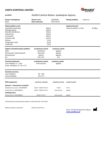 KARTA KONTROLI JAKOŚCI produkt: Giolitti Cantoni Bulion- podwójnie stężony Numer katalogowy: 6412 Numer serii: Data ważności: Skład podłoża w g/l: Hydrolizat kazeinowy Wyciąg mięsny Ekstrakt drożdżowy Chlorek litu D-mannitol Chlorek sodu Glicyna Pirogronian sodu Tween 80 20160209 2017-02-03 oczekiwany wynik: słomkowy klarowny płynna 6,9 ± 0,2 Kontrola jałowości: czas inkubacji: 3 - 5 dni temp. inkubacji: 37 i 25 ± 2˚C oczekiwany wynik: brak wzrostu Kontrola wzrostu: czas inkubacji: temp inkubacji: Mikroorganizm: wybiórcze Suplementy g/l: Telluryn potasu x 3 H2O 20,0 g 10,0 g 10,0 g 10,0 g 40,0 g 10,0 g 2,4 g 6,0 g 2,0 g Ogólna charakterystyka podłoża: kolor klarowność / jednorodność konsystencja pH Rodzaj podłoża: uzyskany wynik: zgodny zgodny zgodny 6,9 uzyskany wynik: zgodny 18 - 24h 35 ± 2˚C czas/temp. inkubacji oczekiwany wynik: uzyskany wynik: Staphylococcus aureus WDCM00034 24±2h - 48±2h/ 37±1°C >10 jtk Escherichia coli WDCM00013 24±2h - 48±2h/ 37±1°C brak wzrostu zgodny 48±2h/ 37±1°C brak wzrostu zgodny Żyzność - mieszanina szczepów 57 jtk Selektywność: Escherichia coli WDCM00013 Kontrola jakości przeprowadzona zgodnie z zaleceniami ISO 11133:2014. Badania wykonał i zatwierdził: Monika Zimmermann Graso, 83-200 Starogard Gd, Krąg 4a www.podloza.pl 0,108 g