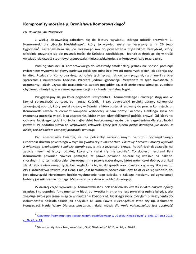 Kompromisy moralne p. Bronisława Komorowskiego1 Dk. dr Jacek Jan Pawłowicz Z wielką ciekawością zabrałem się do lektury wywiadu, którego udzielił prezydent B. Komorowski dla „Gościa Niedzielnego”, który to wywiad został zamieszczony w nr 26 tego tygodnika2. Zastanawiałem się, co ciekawego ma do powiedzenia czytelnikom Prezydent, który oficjalnie przyznaje się do przynależności do Kościoła katolickiego. Jednak zagłębiając się w treśd wywiadu ciekawośd stopniowo ustępowała miejsca zdziwieniu, a w koocowej fazie przerażeniu. Pominę stosunek B. Komorowskiego do katastrofy smoleoskiej, jednak nie sposób pominąd milczeniem wypowiedzi głowy paostwa polskiego odnośnie kwestii moralnych takich jak aborcja czy in vitro. Poglądy p. Komorowskiego odnośnie tych spraw, jak on sam przyznał, są znane i są one sprzeczne z nauczaniem Kościoła. Przeraża jednak ignorancja Prezydenta w tych kwestiach, a argumenty, jakich używa dla uzasadnienia swoich poglądów są, delikatnie rzecz ujmując, zupełnie chybione, infantylne, a w samej argumentacji brak fundamentalnej logiki. Przyglądnijmy się po kolei poglądom Prezydenta B. Komorowskiego i dlaczego stoją one w jawnej sprzecznośd do tego, co naucza Kościół. I tak obywatelski projekt ustawy całkowicie zakazującej aborcji, który został złożony w Sejmie, a który został skierowany do prac w komisjach, p. Komorowski uważa za element kampanii wyborczej, a sam pomysł ochrony ludzkiego życia od momentu poczęcia widzi, jako zagrożenie, które może zdestabilizowad polskie prawo! Od kiedy to ochrona ludzkiego życia i to życia najbardziej bezbronnego może byd zagrożeniem dla stabilności prawa?! W dodatku słowa te wypowiada człowiek, który jest ojcem piątki dorosłych już dzieci, a dzisiaj też dziadkiem rosnącej gromadki wnucząt. Pan Komorowski twierdzi, że nie potrafiłby narzucid innym heroizmu obowiązkowego urodzenia dziecka powstałego w wyniku gwałtu czy z kazirodztwa. Postawy heroizmu muszą wynikad z własnego przekonania i nakazu moralnego, a nie z przymusu prawa. Potrafi jednak zezwolid na zabicie niewinnej istoty ludzkiej, która „na świat się nie prosiła”. To dopiero heroizm! Pan Komorowski powinien również pamiętad, że prawo powinno opierad się właśnie na nakazie moralnym i to tym najbardziej pierwotnym, na prawie naturalnym, które mówi czyo dobro, a unikaj zła. A zabicie niewinnego życia, bez względu na to, w jaki sposób ono powstało czy w wyniku gwałtu, czy z kazirodztwa zawsze jest złem. I nie jest heroizmem pozwolenie, aby to dziecko się urodziło, to jest obowiązek! Heroizmem będzie wychowanie tego dziecka, a takiego heroizmu od zgwałconej kobiety już nikt się nie domaga. Może urodzone dziecko oddad do adopcji. W dalszej części wywiadu p. Komorowski stosunek Kościoła do kwestii in vitro nazywa opinią księdza. I tu popełnia fundamentalny błąd, bo kwestia in vitro nie jest prywatną opinią księdza, ale znajduje swoje poczesne miejsce w nauczaniu Kościoła nt. ludzkiego życia. Odsyłam p. Prezydenta do dokumentów Kościoła takich jak encyklika bł. Jana Pawła II Evangelium vitae czy np. dokument Kongregacji Nauki Wiary Dignitas personae. I dalej mówi: dla mnie najważniejsza jest zgodnośd 1 Obszerne fragmenty tego tekstu zostały opublikowane w „Gościu Niedzielnym” z dnia 17 lipca 2011 r., Nr 28, s. 13. 2 Nie ma polityki bez kompromisów, „Gośd Niedzielny” 2011, nr 26, s. 26-28. praktyki własnego życia z nauką Kościoła. I w tym właśnie tkwi cały szkopuł. Bo nie ma zgodności z tym, co Pan Prezydent mówi nt. in vitro z tym, co w danej materii naucza Kościół! Pan Komorowski żyje według schematu jakiegoś dualizmu moralnego, gdyż odróżnia imperatyw moralny od życia społecznego, a przecież życie społeczne musi byd podporządkowane imperatywowi moralnemu, a nie odwrotnie. Zresztą potwierdzeniem tezy o dualizmie moralnym p. Komorowskiego są jego własne słowa, że swoim życiu prywatnym, życiu Bronisława Komorowskiego będę się starał respektowad naukę Kościoła, którego jestem cząstką. Ale już, jako Prezydent RP, będzie zachęcad do szukania kompromisów politycznych, a nie wojen ideologicznych. Tak więc dla p. Prezydenta ochrona ludzkiego życia od momentu poczęcia jest ideologią, a nie nakazem moralnym wypływającym z przykazania „nie zabijaj!”. W kwestii szukania kompromisów, nawet tych politycznych, p. Komorowski również mija się z tym, co naucza Kościół. Magisterium Kościoła w Nocie doktrynalnej dotyczącej pewnych kwestii związanych z udziałem i postawą katolików w życiu politycznym Kongregacji Nauki Wiary z 2002 r. wyraźnie poucza, że tam gdzie dochodzi do konfrontacji wiary i moralności katolicki polityk nie może się godzid na jakiekolwiek kompromisy i wchodzid w dwuznaczne układy wybierając „mniejsze zło” lub idąc na „kompromis”. W takich sytuacjach jego odpowiedzialnośd wobec Boga, własnego sumienia i wyborców, którzy go wybrali (kierując się często tym, że jest on właśnie katolikiem) staje się tym większa i wymaga od niego jednoznacznych i klarownym postaw opowiadających się po stronie dobra. Tej odpowiedzialności i przejrzystości wymaga się od katolickiego polityka zwłaszcza wobec tak fundamentalnych spraw, jakim jest obowiązek poszanowania i ochrony ludzkiego życia od momentu jego poczęcia. Stąd też katolicki polityk nie może stosowad w swojej działalności politycznej i parlamentarnej tak modnej dzisiaj i głoszonej przez tzw. „nowoczesnych katolików” zasady autonomii sfery kościelnej i politycznej. Kongregacja w przywołanej Nocie z naciskiem podkreśla, że ta zasada nie ma zastosowania tam, gdzie w grę wchodzą rozwiązania, które przekreślałyby lub podważały wymagania etyczne o fundamentalnym znaczeniu dla dobra wspólnego całego społeczeostwa. W dokumencie tym Kościół poucza, że błędem