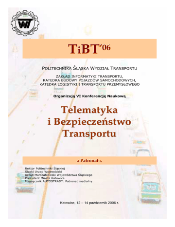 TiBT ’06 POLITECHNIKA ŚLĄSKA WYDZIAŁ TRANSPORTU ZAKŁAD INFORMATYKI TRANSPORTU, KATEDRA BUDOWY POJAZDÓW SAMOCHODOWYCH, KATEDRA LOGISTYKI I TRANSPORTU PRZEMYSŁOWEGO Organizują VI Konferencję Naukową Telematyka i Bezpieczeństwo Transportu ..:: PPaattrroonnaatt ::.. Rektor Politechniki Śląskiej Śląski Urząd Wojewódzki Urząd Marszałkowski Województwa Śląskiego Prezydent Miasta Katowice Miesięcznik AUTOSTRADY: Patronat medialny Katowice, 12 – 14 październik 2006 r. ..:: IInnssttyyttuuccjjee w wssppóółłpprraaccuujjąąccee ::.. AGH, Katedra Automatyki ERA Pardubice University of Technology Polska Akademia Nauk, Sekcja Elektroniki, Oddział Śląski Polska Akademia Nauk, Sekcja Transportu, Oddział Śląski Politechnika Rzeszowska Savonia Polytechnic SWARCO TECHNOLOGY, DK Śląska Komenda Policji, WORD, Katowice, ZIR – SSR Bytom ..:: K Koooorrddyynnaattoorrzzyy K Koonnffeerreennccjjii ::.. Prof. Andrzej Wilk, Prof. Jan Piecha, Prof. Sylwester Markusik. ..:: K Koom miitteett PPrrooggrraam moow wyy ::.. Prof. A. Adamski Prof A. Bargiela Prof. W. Brusov Prof. M. Chmurawa Prof. A.Chudzikiewicz Prof. J. Kleprlik Prof. K. Krystek Prof. Tuula Linnas Prof. M.Luft Prof. B. Łazarz Prof. Łukasik Prof. J. Niittymaki Prof. S. Makusik Prof. A. Mitas Prof. M. Pałys Prof. J. Piecha Prof. A. Sładkowski Prof. R. Szopa Prof. R. Tadeusiewicz Prof. M. Tracz Prof. A. Wilk Dr. Z. Mikrut Dr. W. Pamuła Dr. P. Porwik Mgr A. Czarnowski Mgr J. Stumpf Mgr. R. Balcer Msc M. Sondergaard AGH Kraków Nottingham Trent University, UK Politechnika Rzeszowska Politechnika Śląska Politechnika Warszawska Pardubice University of Technology, CZ Politechnika Gdańska Savonia Polytechnic, FIN Politechnika Radomska Politechnika Śląska Politechnika Radomska Helsinki University of Technology, FIN Politechnika Śląska Politechnika Śląska Politechnika Warszawska Politechnika Śląska Politechnika Śląska WORD Katowice AGH Kraków Politechnika Krakowska Politechnika Śląska AGH Kraków Politechnika Śląska Uniwersytet Śląski Scieca London, UK Urząd Marszałkowski, Katowice ZIR- SSR Bytom SWARCO Technology, DK 2 ..:: T Teem maattyykkaa kkoonnffeerreennccjjii ::.. Teletransmisja i tel-nawigacja, systemy teletransmisji i łączności bezprzewodowej, techniki symulacyjne, sterowniki mikroprogramowane, gromadzenie i przekazywanie danych, rozległe komputerowe sieci teletransmisyjne naleŜą dziś do standardów w systemach transportu. Miary bezpieczeństwa ruchu drogowego, bezpieczne systemy transportu, bezpieczeństwo bierne i czynne pojazdów – ogólnie bezpieczeństwo jako kryterium sterowania ruchem jest najwaŜniejszym elementem oceny jakości rozwiązań transportowych. Podstawą dla optymalizacji algorytmów oddziaływania na zachowania uczestników ruchu drogowego jest informacja o ruchu, którą zapewniają systemy monitorowania. Celem konferencji jest promocja nowych opracowań, szkolenie uŜytkowników tych rozwiązań oraz prezentacja zespołów specjalistów przygotowanych do wdroŜeń współczesnych rozwiązań w dziedzinie transportu. Konferencja jest elementem europejskiego programu transferu nauki (Science Shops) do odbiorców regionalnych. Program konferencji realizowany będzie w trzech sekcjach tematycznych: SEKCJA A. Telematyka Transportu - przew. Prof. J. Piecha Rejestracja i przetwarzanie danych, sterowniki ruchu drogowego: wideo rejestracja, techniki przetwarzania obrazów, monitorowanie ruchu, urządzenia peryferyjne. Zarządzanie transportem w aglomeracjach miejskich, techniki modelowania i symulacji systemów transportu, rozproszone systemy sterowania, SEKCJA B. Bezpieczeństwo Ruchu Drogowego - przew. Prof. B. Łazarz Infrastruktura drogowa i uwarunkowania urbanistyczne, komputerowe systemy wspomagania projektowania, prognozowanie ruchu i potrzeby regionalne, miary bezpieczeństwa ruchu drogowego, bezpieczne systemy transportu, bezpieczeństwo bierne i czynne pojazdów, badania statystyczne, metody prewencji, programy badawcze. SEKCJA C. Logistyka i Transport Zintegrowany - przew. Prof. S. Markusik Przygotowanie ładunków, organizacja i koordynacja przeładunków, transport przemysłowy i środki transportu, metody koordynacji i centra logistyczne transportu, zintegrowane systemy transportowe. Transport lotniczy i morski, obiekty i drogi powietrzne, drogi i ładunki morskie, bezpieczeństwo rozległych systemów transportu. Logistyka zintegrowanych układów transportowych z portami lotniczymi i morskimi. ..:: W Waażżnnee ddaattyy ::.. rejestracja i nadsyłanie prac 30 sierpień 2006 r. potwierdzenie przyjęcia prac 10 wrzesień 2006 r. termin wniesienia opłaty 22 wrzesień 2006 r. prace nadesłane w terminie będą recenzowane do publikacji w monografii i na CDROM. ..:: O Oppłłaattyy ::.. Udział w konferencji (Katowice)*: Publikacja w monografii Stoisko firmowe: Reklama w materiałach konferencji: 500 zł do 30 lipca 2006 r (550 zł po 30 lipca 2006 r) 100 zł (dopłata) 600 zł 300 zł 3 *Opłata obejmuje: wstęp na obrady, materiały konferencyjne, dwa obiady, bankiet, kawę, napoje. Opłata nie obejmuje hotelu (rezerwacja we własnym zakresie). Udział w warsztatach (Ustroń): 250 zł (autokar, hotel, posiłki i spotkanie koleŜeńskie) Wpłata na rachunek: Politechnika Śląska, ING Bank Śląski Oddział Gliwice nr konta: 60105012301000000202113056 z dopiskiem „konferencja TiBT’06” ..:: SSeekkrreettaarriiaatt kkoonnffeerreennccjjii ::.. B. Płaczek, M. Staniek, T.Figlus, G.Garncarz [email protected] www.konferencje.polsl.pl/tibt ..:: K Koom miitteett oorrggaanniizzaaccyyjjnnyy ::.. J. Piecha, S. Markusik, B. Łazarz, M. Chmurawa, W. Pamuła, S. Kubit ..:: K Koorreessppoonnddeennccjjaa ::.. Politechnika Śląska, Wydział Transportu, Zakład Informatyki Transportu 40-019 Katowice ul. Krasińskiego 13, p.408 [email protected] SEKCJA A SEKCJA B tel. 032-6034288 tel. 032-6034118 fax 032-6034330 fax 032-6034108 SEKCJA C tel. 032-6034149 fax 032-6034157 .