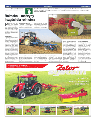 Strona 26 www.wrp.pl Opr. Daniel Alankiewicz na podstawie materiałów Rolmako Nr 05/2009 (57) Firma Rolmako rozpoczęła działalność w 1982 roku produkcją maszyn do zbioru buraków cukrowych oraz przyczep rolniczych. Obecnie, po wielu latach, firma wyspecjalizowała się jako producent maszyn rolniczych oraz części zamiennych. Rolmako – maszyny i części dla rolnictwa F irma z Psar Małych koło Wrześni świadczy kompleksowe usługi z zakresu obróbki blach oraz realizuje zamówienia indywidualne na części nietypowe, także do maszyn produkcji zagranicznej. Części do maszyn Produkcja części zamiennych to głównie elementy do kombajnu zbożowego Bizon. Sita, klepiska, podsiewacze i inne podzespoły do kombajnów zagranicznych wykonywane są na zamówienie według dostarczonej dokumentacji lub wzoru. Większa część działalności firmy skoncentrowana jest na wytwarzaniu maszyn rolniczych. Wszystkie części metalowe maszyn poddawane są obróbce śrutowania i malowaniu proszkowemu, co gwarantuje wieloletnią trwałość lakierowanych powierzchni. Bogata oferta owijarek bel Jednym z ważniejszych urządzeń w ofercie Rolmako są owijarki bel. Stacjo- narna owijarka bel w wersji podstawowej owija bele folią 500 mm. Użytkując owijarkę z uniwersalnym podajnikiem folii stosuje się folie 500 mm lub 750 mm, w pierwszym wypadku wykonuje się 24 owinięcia, a w drugim 18. Rolmako po- siada w swojej ofercie również owijarki samozaładowcze Z 259, przeznaczone do pracy w większych gospodarstwach. Stoły do rzepaku Firmie z Psar Małych udało się stworzyć bogatą ofertę stołów do rzepaku do kombajnów różnych marek. Producent w stałej sprzedaży posiada przystawki do rzepaku przeznaczone do współpracy z najbardziej popularnymi kombajnami, pozostałe produkowane są na indywidualne zamówienie klienta. Kosa główna napędzana jest przez przekładnię Schumacher, kosy boczne mogą być napędzane mechanicznie lub elektrycznie. Przystawki z Rolmako wydłużają heder o 800 mm. Maszyny do podorywki Kolejną grupą maszyn produkowanych przez Rolmako są kulty watory podorywkowe. Maszyna występuje w czterech szerokościach roboczych 2,1 m, 2,6 m, 3,0 m, 3,9 m. Klient może wybierać spośród dwóch wałów strunowych, podobnie jest z elementami roboczymi maszyny. Opcjonalnie kultywator może być wyposażony w siewnik poplonu. n WR-068/09