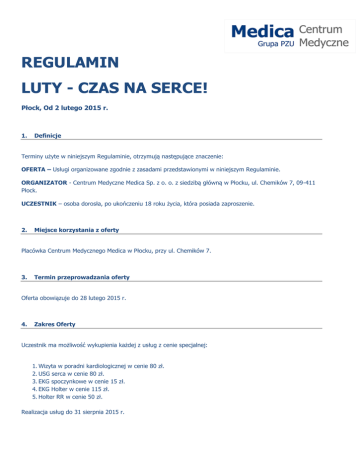 REGULAMIN LUTY - CZAS NA SERCE! Płock, Od 2 lutego 2015 r. 1. Definicje Terminy użyte w niniejszym Regulaminie, otrzymują następujące znaczenie: OFERTA – Usługi organizowane zgodnie z zasadami przedstawionymi w niniejszym Regulaminie. ORGANIZATOR - Centrum Medyczne Medica Sp. z o. o. z siedzibą główną w Płocku, ul. Chemików 7, 09-411 Płock. UCZESTNIK – osoba dorosła, po ukończeniu 18 roku życia, która posiada zaproszenie. 2. Miejsce korzystania z oferty Placówka Centrum Medycznego Medica w Płocku, przy ul. Chemików 7. 3. Termin przeprowadzania oferty Oferta obowiązuje do 28 lutego 2015 r. 4. Zakres Oferty Uczestnik ma możliwość wykupienia każdej z usług z cenie specjalnej: 1. Wizyta w poradni kardiologicznej w cenie 80 zł. 2. USG serca w cenie 80 zł. 3. EKG spoczynkowe w cenie 15 zł. 4. EKG Holter w cenie 115 zł. 5. Holter RR w cenie 50 zł. Realizacja usług do 31 sierpnia 2015 r. 5. Warunki skorzystania z oferty Warunkiem skorzystania z usług objętych Ofertą jest wykupienie jednej lub wielu usług wskazanych w pkt. 4 oraz zapoznanie się z niniejszym Regulaminem. Warunkiem skorzystania z następujących usług: 1. Wizyta w poradni kardiologicznej. 2. USG serca. Jest zapisanie się na wybraną usługę/i telefonicznie pod numerem telefonu: 24 364 70 00 wew. 4, lub osobiście w siedzibie CM Medica przy ul. Chemików 7 od poniedziałku do piątku w godz.: 6:00 – 19:00, w przychodni ul. Kutrzeby 11 od poniedziałku do piątku w godz.: 7:00 – 18:00 lub w Galerii Handlowej Wisła na stoisku CM Medica od poniedziałku do piątku w godz.: 14:00 – 18:00 oraz w soboty i w niedziele w godz.: 12:00 – 20:00. Warunkiem skorzystania z następujących usług: 1. EKG Holter w cenie 115 zł. 2. Holter RR w cenie 50 zł. Jest zapisanie się na wybraną usługę/i telefonicznie pod numerem telefonu: 24 365 09 95 lub osobiście w siedzibie CM Medica przy ul. Chemików 7 od poniedziałku do piątku w godz.: 7:00 – 14:35 w gabinecie numer 87a. 1. EKG spoczynkowe w cenie 15 zł. EKG spoczynkowe nie wymaga wcześniejszej rejestracji Realizacja usług, o których mowa w pkt. 4, następuje w momencie okazania zaproszenia, którego wzór stanowi Załącznik nr 1 do niniejszego Regulaminu. 6. Informacje dodatkowe 1. Usługi wchodzące w skład oferty realizowane są przez lekarzy specjalistów oraz uprawnionych pracowników Centrum Medycznego Medica Sp. z o.o. Uczestnik nie jest obowiązany posiadać skierowań na usługi zawarte w Ofercie. Usługi nie mogą zostać zamienione na inne usługi i inne świadczenia. Jeżeli Uczestnik nie wykorzysta wykupionych usług do 31 sierpnia 2015 roku, nie otrzymuje zwrotu równowartości niewykorzystanych usług. Czas rozpoczęcia realizacji usług rozpoczyna się w momencie zakupu. Informacje dotyczące oferty dostępne są na stronie www.cmmedica.pl oraz pod numerem telefonu 24 364 70 00 wew. 4 oraz w każdej siedzibie Organizatora. Regulamin dostępny jest na stronie www.cmmedica.pl. Pytania oraz reklamacje dotyczące Promocji można kierować na adres email: [email protected]. CM Medica nie ponosi odpowiedzialności za zaproszenia na usługi, które zostały utracone lub uszkodzone po ich wydaniu Uczestnikowi. 2. 3. 4. 5. 6. 7. Forma płatności 1. Płatności na usługi Uczestnik dokonuje osobiście w siedzibie CM Medica przy ul. Chemików 7 od poniedziałku do piątku w godz.: 6:00 – 19:00, w przychodni ul. Kutrzeby 11 od poniedziałku do piątku w godz.: 7:00 – 18:00 oraz w Galerii Handlowej Wisła na stoisku CM Medica od poniedziałku do piątku w godz.: 14:00 – 18:00 oraz w soboty i w niedziele w godz.: 12:00 – 20:00. 2. Płatności bezgotówkowe realizowane są w siedzibie CM Medica przy ul. Chemików 7 od poniedziałku do piątku w godz.: 6:00 – 19:00. 3. Po dokonaniu płatności za wybrane usługi, o których mowa w pkt 4 Regulaminu, Uczestnik otrzymuje zaproszenie. 8. Postanowienia końcowe 1. Organizator zastrzega sobie prawo zmiany niniejszego Regulaminu. Wszelkie zmiany w niniejszym Regulaminie wymagają zachowania formy pisemnej pod rygorem nieważności i będą obowiązywały po upływie 7 dni od dnia ich ogłoszenia w placówkach medycznych CM Medica. Wszelkie załączniki do niniejszego Regulaminu stanowią jego integralną część. 2. Załącznik 1