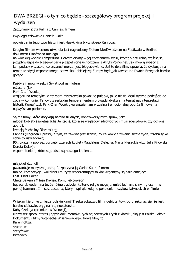 DWA BRZEGI - o tym co będzie - szczegółowy program projekcji i wydarzeń Zaczynamy Złotą Palmą z Cannes, filmem zwykłego człowieka Daniela Blake opowiadaniu tego typu historii jest klasyk kina brytyjskiego Ken Loach. Drugim filmem wieczoru otwarcia jest nagrodzony Złotym Niedźwiedziem na Festiwalu w Berlinie dokument Gianfranco Rosiego na włoskiej wyspie Lampedusa. Uczestniczymy w jej codziennym życiu, którego naturalną częścią są przypływające do brzegów barki przepełnione uchodźcami z Afryki Północnej. Jak mówią rybacy z Lampedusy wszystko, co przynosi morze, jest błogosławione. Już te dwa filmy sprawią, że dyskusje na temat kondycji współczesnego człowieka i dzisiejszej Europy będą jak zawsze na Dwóch Brzegach bardzo gorące. Każdy z filmów w sekcji Świat pod namiotem reżysera (jak Park Chan Wooka, względu na tematykę. Vinterberg mistrzowsko pokazuje pułapki, jakie niesie idealistyczne podejście do życia w komunie. Tanovic z serbskim temperamentem prowadzi dyskurs na temat nadinterpretacji historii. Koreańczyk Park Chan Wook gwarantuje nam wizualną i emocjonalną podróż filmową na najwyższym poziomie. Są też filmy, które dotykają bardzo trudnych, kontrowersyjnych spraw, jak: młodej kobiety (świetna Julia Jentsch), która ze względów zdrowotnych musi zdecydować czy dokona aborcji; kreacją Michaliny Olszanskiej; Cannes (Nagroda Fipresci) o tym, że zawsze jest szansa, by całkowicie zmienić swoje życie, trzeba tylko sobie to uświadomić; 90., ukazany poprzez portrety czterech kobiet (Magdalena Cielecka, Marta Nieradkiewicz, Julia Kijowska, Dorota Kolak); wspomnieniom, które są podstawą naszego istnienia. miejskiej dżungli gwarantuje muzyczną ucztę. Rozpoczyna ją Carlos Saura filmem taniec, kompozycje, wokaliści i muzycy reprezentujący folklor Argentyny są oszałamiające. Lost. Chet Baker Cheta Bakera i Milesa Davisa. Komu kibicować? będąca dowodem na to, że różne tradycje, kultury, religie mogą brzmieć jednym, silnym głosem, w pełnej harmonii. I mistrz Lecuona, który inspiruje kolejne pokolenia muzyków latynoskich w filmie W jakim kierunku zmierza polskie kino? Trzeba zobaczyć filmy debiutantów, by przekonać się, że jest bardzo ciekawie, oryginalnie, nowatorsko. Kuby Czekaja (premiera w Wenecji), Mamy też sporo interesujących dokumentów, tych najnowszych i tych z klasyki jaką jest Polska Szkoła Dokumentu i filmy Wojciecha Wiszniewskiego. Nowe filmy to Barenholtzu, szatanem szeryfowie Brzegach. Strona 1/2 Retrospektywy filmowe to spotkanie z kinem, które znamy, uwielbiamy i chętnie do niego powracamy albo też o którym słyszeliśmy i wiemy, że jest ważne, ale nigdy nie było szansy żeby je zobaczyć. Oto one: Filmy Andrzeja Żuławskiego: od Filmy z Bogusławem Lindą w sekcji zaczynając, przez aktora. mamy szansę zobaczyć go w filmach czterech wybitnych włoskich reżyserów: Ettore Scola dzień Antonioni Włoskiej w Warszawie. Podczas Piotra Dumałę (film Ponadto polskie przeboje filmowe z lat 30. XX wieku (przy współpracy z Filmoteką Narodową), filmy młodych ze Studia Munka, spektakle z cyklu Teatroteka, prezentujące młodą polską dramaturgię (przy współpracy z WFDiF). A także wystawy, koncerty w Kazimierzu, Janowcu i Mięćmierzu, pokazy dla najmłodszych widzów w GOK w Janowcu i codziennie kilka spotkań z twórcami, aktorkami, aktorami i reżyserami w Black Red White Cafe. Tak mijać nam będą te za krótkie dni i noce 10. Festiwalu Filmu i Sztuki Dwa Brzegi w Kazimierzu Dolnym i Janowcu nad Wisłą. Zapraszamy, Grażyna Torbicka z zespołem źódło: dwabrzegi.pl Program projekcji filmowych dostepny jest TUTAJ Program Spotkań i wydarzeń TUTAJ Strona 2/2 Powered by TCPDF (www.tcpdf.org)