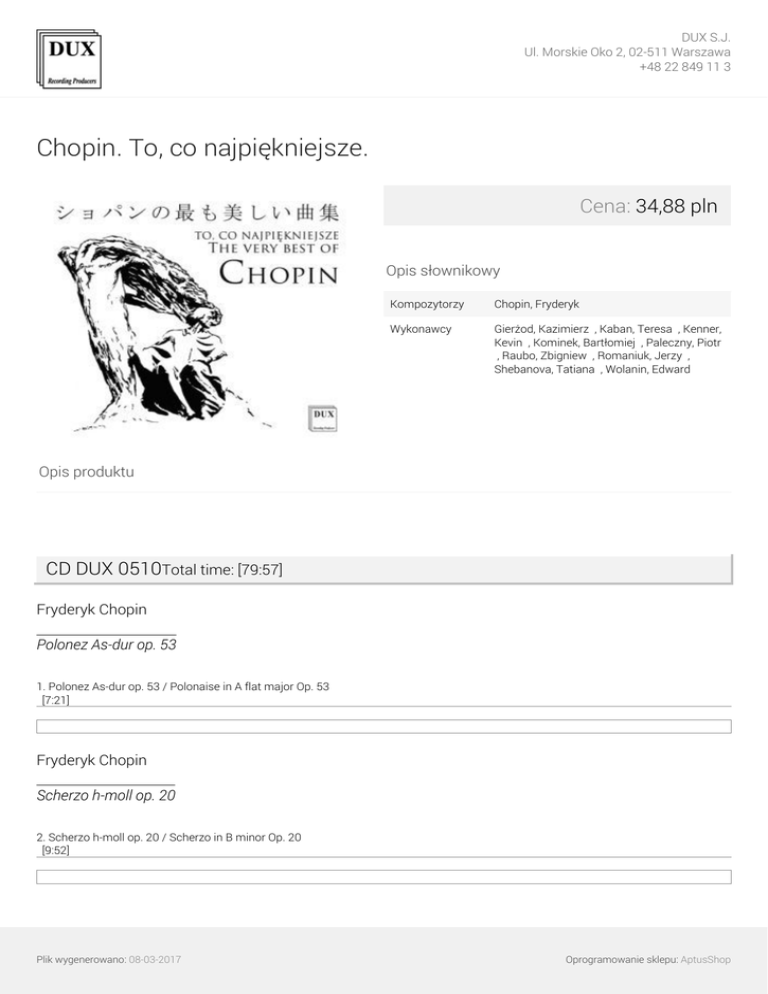 DUX S.J. Ul. Morskie Oko 2, 02-511 Warszawa +48 22 849 11 3 Chopin. To, co najpiękniejsze. Cena: 34,88 pln Opis słownikowy Kompozytorzy Chopin, Fryderyk ∎ Wykonawcy Gierżod, Kazimierz ∎, Kaban, Teresa ∎, Kenner, Kevin ∎, Kominek, Bartłomiej ∎, Paleczny, Piotr ∎, Raubo, Zbigniew ∎, Romaniuk, Jerzy ∎, Shebanova, Tatiana ∎, Wolanin, Edward ∎ Opis produktu CD DUX 0510Total time: [79:57] Fryderyk Chopin Polonez As-dur op. 53 1. Polonez As-dur op. 53 / Polonaise in A flat major Op. 53 [7:21] Fryderyk Chopin Scherzo h-moll op. 20 2. Scherzo h-moll op. 20 / Scherzo in B minor Op. 20 [9:52] Plik wygenerowano: 08-03-2017 Oprogramowanie sklepu: AptusShop DUX S.J. Ul. Morskie Oko 2, 02-511 Warszawa +48 22 849 11 3 Fryderyk Chopin Ballada nr 1 g-moll op. 23 3. Ballada g-moll op. 23 / Ballade in G minor Op. 23 [9:17] Fryderyk Chopin Etiuda E-dur op. 10 nr 3 4. Etiuda E-dur op. 10 nr 3 / Etude in E major Op. 10 No. 3 [4:18] Fryderyk Chopin Etiuda c-moll op. 10 nr 12 “Rewolucyjna” 5. Etiuda c-moll op. 10 nr 12 „Rewolucyjna” / Etude in C minor Op. 10 No. 12 ”Revolutionary” [2:34] Fryderyk Chopin Etiuda As-dur op. 25 nr 1 6. Etiuda As-dur op. 25 nr 1 / Etude in A flat major Op. 25 No. 1 [2:58] Fryderyk Chopin Fantazja-Impromptu cis-moll op. 66 7. Fantazja-Impromptu op. 66 / Fantasia-Impromptu Op. 66 [5:15] Fryderyk Chopin Plik wygenerowano: 08-03-2017 Oprogramowanie sklepu: AptusShop DUX S.J. Ul. Morskie Oko 2, 02-511 Warszawa +48 22 849 11 3 Mazurek C-dur op. 67 nr 3 8. Mazurek C-dur op. 67 nr 3 / Mazurka in C major Op. 67 No. 3 [1:18] Fryderyk Chopin Mazurek a-moll op. 67 nr 4 9. Mazurek a-moll op. 67 nr 4 / Mazurka in A minor Op. 67 No. 4 [2:55] Fryderyk Chopin Mazurek cis-moll op. 63 nr 3 10. Mazurek cis-moll op. 63 nr 3 / Mazurka in C sharp minor Op. 63 No. 3 [2:05] Fryderyk Chopin Berceuse Des-dur op. 57 11. Berceuse Des-dur op. 57 / Berceuse in D flat major Op. 57 [5:44] Fryderyk Chopin Walc Des-dur op. 64 nr 1 „Minutowy“ 12. Walc Des-dur op. 64 nr 1 / Waltz in D flat major Op. 64 No. 1 [1:56] Fryderyk Chopin Walc cis-moll op. 64 nr 2 Plik wygenerowano: 08-03-2017 Oprogramowanie sklepu: AptusShop DUX S.J. Ul. Morskie Oko 2, 02-511 Warszawa +48 22 849 11 3 13. Walc cis-moll op. 64 nr 2 / Waltz in C sharp minor Op. 64 No. 2 [3:22] Fryderyk Chopin Walc F-dur op. 34 nr 3 14. Walc F-dur op. 34 nr 3 / Waltz in F major Op. 34 No. 3 [2:20] Fryderyk Chopin Preludium A-dur op. 28 nr 7 15. Preludium A-dur op. 28 nr 7 / Prelude in A major Op. 28 No. 7 [1:04] Fryderyk Chopin Preludium cis-moll op. 28 nr 10 16. Preludium cis-moll op. 28 nr 10 / Prelude in C sharp minor Op. 28 No. 10 [0:40] Fryderyk Chopin Preludium Es-dur op. 28 nr 19 17. Preludium Es-dur op. 28 nr 19 / Prelude in E flat major Op. 28 No. 19 [1:15] Fryderyk Chopin Preludium c-moll op. 28 nr 20 18. Preludium c-moll op. 28 nr 20 / Prelude in C minor Op. 28 No. 20 [2:07] Plik wygenerowano: 08-03-2017 Oprogramowanie sklepu: AptusShop DUX S.J. Ul. Morskie Oko 2, 02-511 Warszawa +48 22 849 11 3 Fryderyk Chopin Preludium d-moll op. 28 nr 24 19. Preludium d-moll op. 28 nr 24 / Prelude in D minor Op. 28 No. 24 [2:30] Fryderyk Chopin Nokturn Es-dur op. 9 nr 2 20. Nokturn Es-dur op. 9 nr 2 / Nocturne in E flat major Op. 9 No. 2 [4:34] Fryderyk Chopin Nokturn Des-dur op. 27 nr 2 21. Nokturn Des-dur op. 27 nr 2 / Nocturne in D flat major Op. 27 No. 2 [6:33] CD DUX 0511Total time: [78:56] Fryderyk Chopin Życzenie op. 74 nr 1 (St.Witwicki) 1. Życzenie op. 74 nr 1 / A Young Girl’s Wish Op. 74 No. 1 [1:48] Fryderyk Chopin Gdzie lubi op. 74 nr 5 Plik wygenerowano: 08-03-2017 Oprogramowanie sklepu: AptusShop DUX S.J. Ul. Morskie Oko 2, 02-511 Warszawa +48 22 849 11 3 2. Gdzie lubi op. 74 nr 5 / What she likes Op. 74 No. 5 [1:15] Fryderyk Chopin Hulanka op. 74 nr 4 3. Hulanka op. 74 nr 4 / A Drinking Song Op. 74 No. 4 [2:05] Fryderyk Chopin Piosnka litewska op. 74 nr 16 4. Piosnka litewska op. 74 nr 16 / Lithuanian Song Op. 74 No. 16 [2:27] Fryderyk Chopin Śliczny chłopiec op. 74 nr 8 5. Śliczny chłopiec op. 74 nr 8 / The Handsome Lad Op. 74 No. 8 [3:13] Fryderyk Chopin Wariacje D-dur na temat pieśni T. Moore’a 6. Wariacje D-dur na temat pieśni T. Moore’a na 4 ręce / Variations on the Theme by T. Moore for Four Hands [7:50] Fryderyk Chopin Koncert fortepianowy e-moll op. 11 7. Koncert fortepianowy e-moll op. 11 / Piano Concerto in E minor Op. 11: Romance. Larghetto [10:24] Plik wygenerowano: 08-03-2017 Oprogramowanie sklepu: AptusShop DUX S.J. Ul. Morskie Oko 2, 02-511 Warszawa +48 22 849 11 3 Fryderyk Chopin Rondo a la Krakowiak F-dur op. 14 8. Rondo a la Krakowiak F-dur op. 14 / Concert Rondo in F major Op. 14 a la Cracovienne [14:49] Fryderyk Chopin Allegro concertante A-dur op. 46 9. Allegro de Concert A-dur op. 46 / Allegro de Concert in A major Op. 46 [12:12] Fryderyk Chopin Andante Spianato i Wielki Polonez Es-dur op. 22 10. Andante Spianato i Wielki Polonez Es-dur op. 22 / Andante Spianato & Great Polonaise in E flat major Op. 22 [13:16] Fryderyk Chopin 3 Preludia z op. 28 – e-moll nr 4, h-moll nr 6, Des-dur nr 15 – wersja orkiestrowa 11. 3 Preludia z op. 28 – e-moll nr 4, h-moll nr 6, Des-dur nr 15 – wersja orkiestrowa / Three Preludies from Op. 28 – E minor No. 4, B minor Nr 6, D flat major No. 15 – orchestral version [9:36] Wykonawcy: Bartłomiej Kominek /fortepian/ Edward Wolanin /fortepian/ Jerzy Romaniuk /fortepian/ Kazimierz Gierżod /fortepian/ Kevin Kenner /fortepian/ Piotr Paleczny /fortepian/ Tatiana Shebanova /fortepian/ Teresa Kaban /fortepian/ Zbigniew Raubo /fortepian/ Plik wygenerowano: 08-03-2017 Powered by TCPDF (www.tcpdf.org) Oprogramowanie sklepu: AptusShop