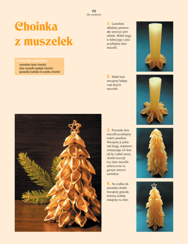 70 Dla cierpliwych Choinka z muszelek 1. Cannelloni układamy pionowo, aby utworzyć pień choinki. Wokół niego, w dolnej jego części przyklejamy duże muszelki. POTRZEBNE MAKARONY: cannelloni (pień choinki) duże muszelki (gałązki choinki) gwiazdka (ozdoba na czubku choinki) 2. Wokół nich mocujemy kolejny rząd dużych muszelek. 3. Pozostałe duże muszelki przyklejamy wokół cannelloni. Mocujemy je jedna nad drugą, stopniowo zmniejszając ich ilość, tak by czubek naszej choinki tworzyły trzy duże muszelki umieszczone na górnym otworze cannelloni. 4. Na czubku tak powstałej choinki mocujemy gwiazdę. Gotową ozdobę malujemy na złoto.