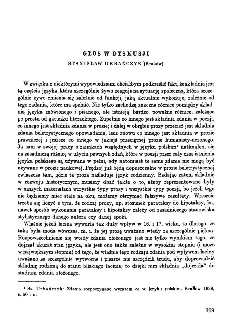 GŁOS W D Y S K U S J I S T A N I S Ł A W U R B A Ń C Z Y K (Kraków) W związku z niektórymi wypowiedziami chciałbym podkreślić fakt, że składnia jest tą częścią języka, która szczególnie żywo reaguje na sytuację społeczną, która szcze gólnie żywo zmienia się zależnie od funkcji, jaką aktualnie wykonuje, zależnie od tego zadania, które ma spełnić. Nie tylko zachodzą znaczne różnice pomiędzy skład nią języka mówionego i pisanego, ale istnieją bardzo poważne różnice, zależące po prostu od gatunku literackiego. Zupełnie co innego jest składnia zdania w poezji, co innego jest składnia zdania w prozie; i dalej w obrębie prozy przecież jest składnia zdania beletrystycznego opowiadania, lecz znowu co innego jest składnia w prozie prawniczej i jeszcze co innego w jakiejś przeciętnej prozie humanisty-uczonego. Ja sam w swojej pracy o zaimkach względnych w języku polskim natknąłem się na zasadniczą różnicę w użyciu pewnych zdań, które w poezji przez cały czas istnienia języka polskiego są używane w pełni, gdy natomiast te same zdania nie mogą być używane w prozie naukowej. Prędzej już będą dopuszczalne w prozie beletrystycznej zwłaszcza tam, gdzie ta proza naśladuje język codzienny. Badając zatem składnię w rozwoju historycznym, musimy dbać także o to, ażeby reprezentowane były w naszych materiałach wcuystkie typy prozy i wszystkie typy poezji, ba jeżeli tego nie będziemy mieć stale na oku, możemy otrzymać fałszywe rezultaty. Wreszcie trzeba się liczyć z tym, że rodzaj prozy, np. stosunek parataksy do hipotaksy, ba, nawet sposób wykonania parataksy i hipotaksy zależy od zasadniczego stanowiska stylistycznego danego autora czy danej epoki. Właśnie jeżeli łacina wywarła tak duży wpływ w 16. i 17. wieku, to dlatego, że taka była moda wówczas, m. i. że jej prozę uważano wtedy za szczególnie piękną. Kozpowszechnienie się wtedy zdania złożonego jest nie tylko wynikiem tego, że dojrzał akurat stan języka, ale jest ono także zależne w wysokim stopniu (i może w największym stopniu) od tego, że właśnie tego rodzaju zdania pod wpływem łaciny uważano za szczególnie wytworne i pisarze nie szczędzili trudu, aby doprowadzić składnię rodzimą do stanu bliskiego łacinie; to dzięki nim składnia „dojrzała" do stadium zdania złożonego. 1 1 St. U r b a ń c z y k : Zdania rozpoczynane wyrazem co w języku polskim. KraKów 1939, a. 50 i n. 309 Wpływ łaciny w 16. i 17. wieku jest w Polsce bardzo silny. Ale w 18. wieku sytuacja się zmienia, bo wzorem stały się zdania francuskie różniące się od kon strukcji opartej na wzorze łacińskim. I ciekawa rzecz, później rozwój szedł, jak mi się wydaje, w ten sposób, że wpływ zdania francuskiego zaznaczał się przede wszyst kim w prozie beletrystycznej, natomiast w prozie, którą bym nazwał urzędową, urzędniczą czy administracyjną, jeszcze będą trwały wpływy składni łacińskiej, przy czym będą też bardzo silnie działały wzory zdania niemieckiego w związku z użyciem w administracji języka niemieckiego, narzuconego znacznej części Polski. W ten sposób możemy mieć w tym samym języku, w tym samym czasie różne typy budowy zdania, zależnie od gatunku literackiego. W 19. i 20. wieku budowa polskiego zdania złożonego w porównaniu z budową tego samego zdania w wieku 16. i 17. staje się na ogół prostsza, jakby się to po wiedziało popularnie, nie wchodząc w to, na czym to polega. Ale jeżeli tak się dzieje, to zmiana znowuż zależy od czynników społecznych, mianowicie do pewnego stopnia przyczyną jest zanik autorytetu łaciny, stopniowe zmniejszanie się ilości ludzi przechodzących naukę łaciny w szkole. Lecz mi się zdaje, że jest jeszcze inny do niosły czynnik, mianowicie zrodzenie się wpływu języka mówionego. Jeżeli jednak ten wpływ wzrósł, to chyba dzięki temu, że ogromnie wzrosła ilość ludzi wykształconych, którzy biorą udział w życiu kulturalnym społeczeństwa; gdzie ludzi piszących a po sługujących się równocześnie w słowie mówioną formą języka literackiego jest stosunkowo niewiele, to ta grupa ludzi może sobie pozwolić na to (i można ich wy szkolić odpowiednio), żeby się posługiwali przynajmniej w piśmie jakimiś szczególnie trudnymi czy sztucznymi sposobami konstrukcji zdania, odbiegającymi od mówionej formy języka kulturalnego. Gdy zaś zastęp tych ludzi ogromnie wzrośnie, to wtedy wzrośnie ich nacisk na język także pisany i rezultatem jest przybliżenie języka pisanego do języka mówionego. Kilka słów jeszcze w związku z tym, co mówił profesor Havranek, rozróżniając materiały wystarczające od wyczerpujących. To rozróżnienie jest bardzo szczęśliwe. Mnie się zdaje, że przy każdej pracy przychodzi taki moment przy zbieraniu mate riałów, gdy dalsze zbieranie nie wnosi już nic w istocie nowego; wtedy jest to wska zówką, że trzeba przerwać, nie dążąc do wyczerpania. Jest to sytuacja podobna do tej, którą w zakresie leksyki przedstawił prof. Kuraszkiewicz w referacie swoim, ogłoszonym w książce zbiorowej poświęconej Odrodzeniu w Polsce. Pokazał, że jeżeli się przeprowadza ekscerpcję na przestrzeni wielkiego utworu, to opłaca się ją prowadzić do pewnego momentu. Wtedy przyrost jest szybki, potem jednak przy chodzi taki moment, kiedy przyrost jest bardzo powolny, ekscerpcja się właściwie nie opłaca. Zupełnie podobna sytuacja jest przy zbieraniu każdego innego materiału. 2 3 2 Por. też wypowiedź B. HavTanka w książce Vyvoj spisovneho jazyka teskeho, s. 49. Wł. Kuraszkiewicz: Szkice o języku Mikołaja Reja (Odrodzenie w Polsce, t. III: Historia języka, cz. I, s. 113—360), s. 170 i n. 3 310