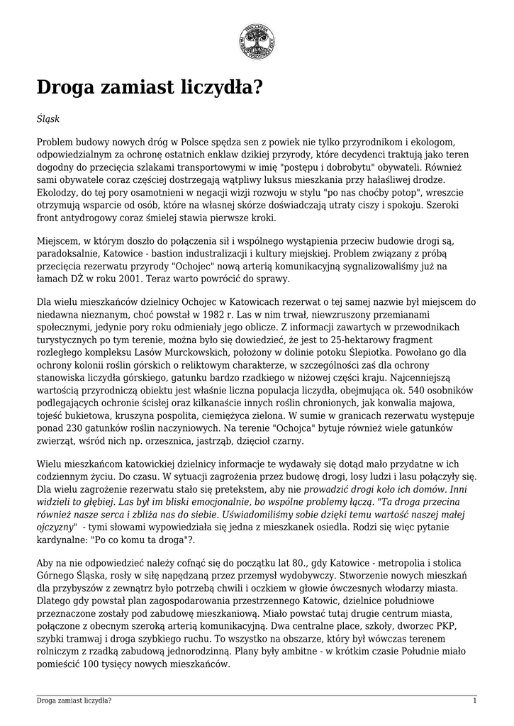 Droga zamiast liczydła? Śląsk Problem budowy nowych dróg w Polsce spędza sen z powiek nie tylko przyrodnikom i ekologom, odpowiedzialnym za ochronę ostatnich enklaw dzikiej przyrody, które decydenci traktują jako teren dogodny do przecięcia szlakami transportowymi w imię "postępu i dobrobytu" obywateli. Również sami obywatele coraz częściej dostrzegają wątpliwy luksus mieszkania przy hałaśliwej drodze. Ekolodzy, do tej pory osamotnieni w negacji wizji rozwoju w stylu "po nas choćby potop", wreszcie otrzymują wsparcie od osób, które na własnej skórze doświadczają utraty ciszy i spokoju. Szeroki front antydrogowy coraz śmielej stawia pierwsze kroki. Miejscem, w którym doszło do połączenia sił i wspólnego wystąpienia przeciw budowie drogi są, paradoksalnie, Katowice - bastion industralizacji i kultury miejskiej. Problem związany z próbą przecięcia rezerwatu przyrody "Ochojec" nową arterią komunikacyjną sygnalizowaliśmy już na łamach DŻ w roku 2001. Teraz warto powrócić do sprawy. Dla wielu mieszkańców dzielnicy Ochojec w Katowicach rezerwat o tej samej nazwie był miejscem do niedawna nieznanym, choć powstał w 1982 r. Las w nim trwał, niewzruszony przemianami społecznymi, jedynie pory roku odmieniały jego oblicze. Z informacji zawartych w przewodnikach turystycznych po tym terenie, można było się dowiedzieć, że jest to 25-hektarowy fragment rozległego kompleksu Lasów Murckowskich, położony w dolinie potoku Ślepiotka. Powołano go dla ochrony kolonii roślin górskich o reliktowym charakterze, w szczególności zaś dla ochrony stanowiska liczydła górskiego, gatunku bardzo rzadkiego w niżowej części kraju. Najcenniejszą wartością przyrodniczą obiektu jest właśnie liczna populacja liczydła, obejmująca ok. 540 osobników podlegających ochronie ścisłej oraz kilkanaście innych roślin chronionych, jak konwalia majowa, tojeść bukietowa, kruszyna pospolita, ciemiężyca zielona. W sumie w granicach rezerwatu występuje ponad 230 gatunków roślin naczyniowych. Na terenie "Ochojca" bytuje również wiele gatunków zwierząt, wśród nich np. orzesznica, jastrząb, dzięcioł czarny. Wielu mieszkańcom katowickiej dzielnicy informacje te wydawały się dotąd mało przydatne w ich codziennym życiu. Do czasu. W sytuacji zagrożenia przez budowę drogi, losy ludzi i lasu połączyły się. Dla wielu zagrożenie rezerwatu stało się pretekstem, aby nie prowadzić drogi koło ich domów. Inni widzieli to głębiej. Las był im bliski emocjonalnie, bo wspólne problemy łączą. "Ta droga przecina również nasze serca i zbliża nas do siebie. Uświadomiliśmy sobie dzięki temu wartość naszej małej ojczyzny" - tymi słowami wypowiedziała się jedna z mieszkanek osiedla. Rodzi się więc pytanie kardynalne: "Po co komu ta droga"?. Aby na nie odpowiedzieć należy cofnąć się do początku lat 80., gdy Katowice - metropolia i stolica Górnego Śląska, rosły w siłę napędzaną przez przemysł wydobywczy. Stworzenie nowych mieszkań dla przybyszów z zewnątrz było potrzebą chwili i oczkiem w głowie ówczesnych włodarzy miasta. Dlatego gdy powstał plan zagospodarowania przestrzennego Katowic, dzielnice południowe przeznaczone zostały pod zabudowę mieszkaniową. Miało powstać tutaj drugie centrum miasta, połączone z obecnym szeroką arterią komunikacyjną. Dwa centralne place, szkoły, dworzec PKP, szybki tramwaj i droga szybkiego ruchu. To wszystko na obszarze, który był wówczas terenem rolniczym z rzadką zabudową jednorodzinną. Plany były ambitne - w krótkim czasie Południe miało pomieścić 100 tysięcy nowych mieszkańców. Droga zamiast liczydła? 1 Jednak, jak mówią, nie zna się dnia ani godziny. Burzliwe lata 80. wywróciły do góry nogami takie wizje. Budowa drugiego centrum Katowic stała się fikcją. Z ambitnych planów zrealizowano zaledwie jedno osiedle, "Odrodzenie", z 6 tys. mieszkańców. Przestała również istnieć potrzeba budowy tak dużej drogi na południe. Mimo tego splotu różnych okoliczności, w ostatnim planie przestrzennym dla Katowic arteria drogowa znów została przerysowana. Budziło to uzasadnione wątpliwości nawet samych architektów. "Być może potrzebna jest nowa sieć dróg o znaczeniu lokalnym, ale droga ponadlokalna" - dziwił się Tadeusz Czerwiński, który 20 lat temu współtworzył plan zagospodarowania przestrzeni dla dzielnicy południowej. - Moim zdaniem projektanci drogi podeszli do zmian w planie przestrzennym bezkrytycznie. Powinno nad nim pracować szerokie gremium fachowców od komunikacji i przyrody, bo południowe dzielnice to płuca Katowic". Jeśli więc samych architektów nurtowały obawy co do zasadności tej inwestycji, trudno się dziwić przyrodnikom, którzy nie mieli żadnych wątpliwości, że drogi tej być nie powinno i należy ją z planów usunąć. Centrum Dziedzictwa Przyrody Górnego Śląska (CDPGŚ) jako organizacja przyrodnicza, która doskonale znała walory tego miejsca, podjęła się prowadzenia działań dla obrony "Ochojca". Mimo argumentów urzędników, że arteria przejdzie po obrzeżach rezerwatu, nie rozwiązywało to problemu. "Przesuwanie drogi na terenie rezerwatu niczego nie rozwiąże oponował twórca rezerwatu Jerzy B. Parusel, dyrektor CDPGŚ. - Nie ma znaczenia, jaką szerokość będzie miała szosa. Ściana lasu, która chroni liczydło, zostanie wycięta, a budowa nasypu spowoduje radykalną zmianę mikroklimatu. Liczydło wyginie, a przesadzić go nie można. Podejmowaliśmy takie próby, ale się nie powiodły". Pisma i wystąpienia do odpowiednich władz nie przynosiły jednak rezultatów. Został natomiast osiągnięty inny cel. Mieszkańcy tej dzielnicy, widząc zagrożenie dla własnego spokoju i zagładę miejsca niedzielnych spacerów, stanęli po stronie przyrodników. Tworzył się nowy, oddolny ruch społeczny. Mimo to władze miasta nie dawały za wygraną. "Na razie nie ma 