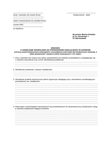 -----------------------------------------------(imię i nazwisko lub nazwa firmy) ------------------------------------------------------------------------------------------------(adres zamieszkania lub siedziba firmy) -----------------------------------------------(numer NIP) -----------------------------------------------(nr telefonu) ---------------------------------------------(miejscowość , data) Burmistrz Miasta Kłodzka pl. B. Chrobrego 1 57-300 Kłodzko WNIOSEK O UDZIELENIE ZEZWOLENIA NA PROWADZENIE DZIAŁALNOŚCI W ZAKRESIE ochrony przed bezdomnymi zwierzętami / prowadzenia schronisk dla bezdomnych zwierząt, a takŜe grzebowisk i spalarni zwłok zwierzęcych i ich części 1. Imię i nazwisko lub nazwa oraz adres zamieszkania lub siedziby przedsiębiorcy ubiegającego się o wydanie zezwolenia oraz numer identyfikacji podatkowej ................................................................................................................................................................ ................................................................................................................................................................ ................................................................................................................................................................ 2. Określenie przedmiotu i obszaru działalności ................................................................................................................................................................... ................................................................................................................................................................... ................................................................................................................................................................... 3. Określenie środków technicznych jakimi dysponuje ubiegający się o zezwolenie umoŜliwiających prowadzenie ww. działalności ................................................................................................................................................................ ................................................................................................................................................................ ................................................................................................................................................................ ................................................................................................................................................................ ................................................................................................................................................................ ................................................................................................................................................................ ................................................................................................................................................................ ................................................................................................................................................................ ................................................................................................................................................................ ................................................................................................................................................................ ................................................................................................................................................................ 4. Informacje o technologiach stosowanych lub przewidzianych do stosowania przy świadczeniu usług w zakresie działalności objętej wnioskiem ................................................................................................................................................................ ................................................................................................................................................................ ................................................................................................................................................................ ................................................................................................................................................................ ................................................................................................................................................................ ................................................................................................................................................................ ................................................................................................................................................................ ................................................................................................................................................................ 5. Proponowane zabiegi z zakresu ochrony środowiska i ochrony sanitarnej planowane po zakończeniu działalności ................................................................................................................................................................ ................................................................................................................................................................ ................................................................................................................................................................ ................................................................................................................................................................ ........................