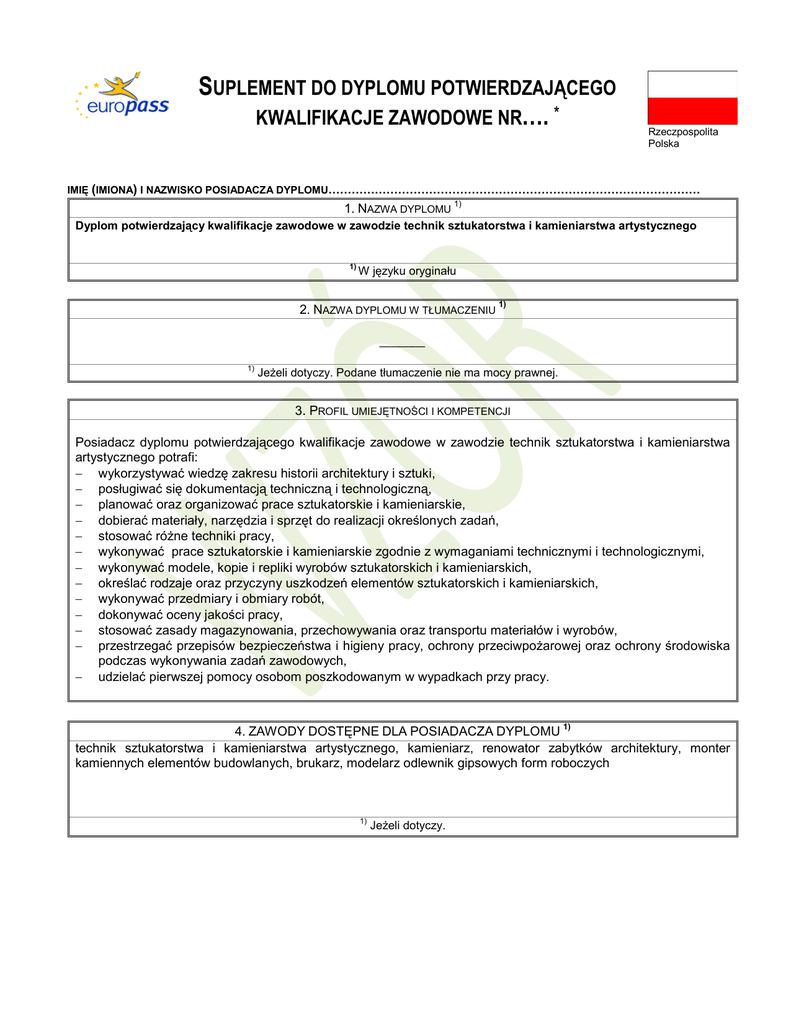 SUPLEMENT DO DYPLOMU POTWIERDZAJĄCEGO KWALIFIKACJE ZAWODOWE NR…. * Rzeczpospolita Polska IMIĘ (IMIONA) I NAZWISKO POSIADACZA DYPLOMU…………………………………………………………………………………… 1. NAZWA DYPLOMU 1) Dyplom potwierdzający kwalifikacje zawodowe w zawodzie technik sztukatorstwa i kamieniarstwa artystycznego 1) W języku oryginału 2. NAZWA DYPLOMU W TŁUMACZENIU 1) _______ 1) Jeżeli dotyczy. Podane tłumaczenie nie ma mocy prawnej. 3. PROFIL UMIEJĘTNOŚCI I KOMPETENCJI Posiadacz dyplomu potwierdzającego kwalifikacje zawodowe w zawodzie technik sztukatorstwa i kamieniarstwa artystycznego potrafi: − wykorzystywać wiedzę zakresu historii architektury i sztuki, − posługiwać się dokumentacją techniczną i technologiczną, − planować oraz organizować prace sztukatorskie i kamieniarskie, − dobierać materiały, narzędzia i sprzęt do realizacji określonych zadań, − stosować różne techniki pracy, − wykonywać prace sztukatorskie i kamieniarskie zgodnie z wymaganiami technicznymi i technologicznymi, − wykonywać modele, kopie i repliki wyrobów sztukatorskich i kamieniarskich, − określać rodzaje oraz przyczyny uszkodzeń elementów sztukatorskich i kamieniarskich, − wykonywać przedmiary i obmiary robót, − dokonywać oceny jakości pracy, − stosować zasady magazynowania, przechowywania oraz transportu materiałów i wyrobów, − przestrzegać przepisów bezpieczeństwa i higieny pracy, ochrony przeciwpożarowej oraz ochrony środowiska podczas wykonywania zadań zawodowych, − udzielać pierwszej pomocy osobom poszkodowanym w wypadkach przy pracy. 4. ZAWODY DOSTĘPNE DLA POSIADACZA DYPLOMU technik sztukatorstwa i kamieniarstwa artystycznego, kamieniarz, renowator zabytków architektury, monter kamiennych elementów budowlanych, brukarz, modelarz odlewnik gipsowych form roboczych 1) 1) Jeżeli dotyczy. 2 str. 5. PODSTAWA WYDANIA DYPLOMU Nazwa podmiotu wydającego dyplom Okręgowa Komisja Egzaminacyjna w …………………………. Nazwa władz sprawujących nadzór nad podmiotem wydającym dyplom Minister Edukacji Narodowej Poziom wykształcenia (krajowy lub międzynarodowy) ISCED 3 Warunki zdania egzaminu kwalifikacje zawodowe potwierdzającego Egzamin podzielony jest na dwa etapy: Etap I pisemny Część I – co najmniej 50% punktów możliwych do uzyskania Część II – co najmniej 30% punktów możliwych do uzyskania Etap II praktyczny Co najmniej 75% punktów możliwych do uzyskania Dostęp do następnego poziomu kształcenia Jeżeli posiadacz dyplomu uzyskał świadectwo dojrzałości, może kontynuować kształcenie w szkole wyższej Umowy międzynarodowe _______ Podstawa prawna wydania dyplomu stosowne rozporządzenie 6. PRZEBIEG KSZTAŁCENIA ZAKOŃCZONEGO UZYSKANIEM DYPLOMU Posiadacz dyplomu zdał egzamin potwierdzający kwalifikacje zawodowe po uzyskaniu świadectwa ukończenia 4-letniego technikum Opis uzyskanego wykształcenia / szkolenia zawodowego Kształcenie teoretyczne Udział procentowy w programie (%) Kształcenie praktyczne 35 65 Informacje dodatkowe: Okręgowa Komisja Egzaminacyjna w ………………………, e-mail: Więcej informacji (w tym opis krajowego systemu kwalifikacji) można znaleźć w Internecie pod adresem: www.men.gov.pl, www.koweziu.edu.pl Krajowy punkt informacyjny: www.europass.org.pl * Nota objaśniająca Niniejszy dokument ma na celu dostarczenie dodatkowych informacji na temat dyplomu potwierdzającego kwalifikacje zawodowe i sam w sobie nie ma mocy prawnej. Podstawą opisu są następujące teksty: Rezolucja Rady nr 93/C 49/01 z dnia 3 grudnia 1992 r. dotycząca przejrzystości kwalifikacji, Rezolucja Rady nr 96/C 224/04 z dnia 15 lipca 1996 r. dotycząca przejrzystości dyplomów szkolenia zawodowego, Zalecenie Parlamentu Europejskiego oraz Rady nr 2001/613/EC z dnia 10 lipca 2001 r. w sprawie mobilności w ramach Wspólnoty studentów, osób przechodzących szkolenia, wolontariuszy, nauczycieli i instruktorów. Więcej informacji można uzyskać pod adresem: http://europass.cedefop.eu.int © European Communities 2002