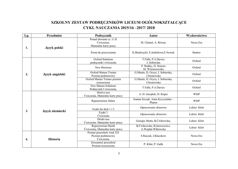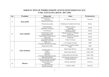 SZKOLNY ZESTAW PODRĘCZNIKÓW LICEUM OGÓLNOKSZTAŁCĄCE CYKL NAUCZANIA 2015/16 –2017/ 2018 Lp. 1. Przedmiot Język polski Podręcznik Autor Wydawnictwo Ponad słowami cz. I i II Ćwiczenia, Maturalne karty pracy M. Chmiel, A. Równy Nowa Era Świat do przeczytania K.Biedrzycki, E.Jaskółowa,E.Nowak Stentor Oxford Solutions podręcznik i ćwiczenia T.Falla, P.A.Davies J. Sobierska P. Radley, D. Simons M. Wieruszewska G.Manin, D. Gryca, J. Sobierska, J.Sosnowska G.Manin, D. Gryca, J. Sobierska, J.Sosnowska New Horizons 2. Język angielski Oxford Matura Trainer Poziom podstawowy Oxford Matura Trainer poziom rozszerzony New Matura Solutions Podręcznik I ćwiczenia, Motive neu Ćwiczenia, Maturalne karty pracy Repetytorium Abitur 3. 4. Język niemiecki Historia Exakt fur dich 1 i 2 Exakt 3 Ćwiczenia Direkt neu Ćwiczenia, Maturalne karty pracy Repetytorium Direkt Ćwiczenia, Maturalne karty pracy Poznać przeszłość wiek XX Poziom podstawowy Ćwiczenia, Zrozumieć przeszłość Poziom rozszerzony 1 Oxford Oxford Oxford Oxford T.Falla, P.A.Davies Oxford A. D. Jarząbek, D. Koper WSiP Joanna Szczęk, Anna Kryczyńska – Pharm WSiP Opracowanie zbiorowe Lektor Klett Opracowanie zbiorowe Lektor Klett Georgio Motta, B.Ćwikowska, Lektor Klett B.Ćwikowska, B.Jaroszweicz, A.Wojdat-Wiktewska Lektor Klett S Raszuk, J.Kłaczkow Nowa Era P. Klint, P. Galik Nowa Era 5. Historia i społeczeństwo Poznać przeszłość Ćwiczenia, 6. Wiedza o społeczeństwie W centrum uwagi Ćwiczenia, Maturalne karty pracy 7. Historia wojskowości 8. Wiedza o kulturze 9. Matematyka 10. Fizyka i Astronomia 11. Chemia 12. 13. Biologia Przyroda Iwona Janicka A. Janicki Wojna i i wojskowość Karty pracy Spotkania z kulturą Ćwiczenia, Maturalne karty pracy Matematyka, Zbiór zadań, Ćwiczenia, Zbiór zadań i zestawów maturalnych, Arkusze maturalne Matematyka Zbiór zadań, Ćwiczenia, Zbiór zadań i zestawów maturalnych, Arkusze maturalne Odkryć fizykę Zbiór zadań, Ćwiczenia, Zbiór zadań i zestawów maturalnych, Arkusze maturalne To jest chemia poziom podstawowy i poziom rozszerzony: To jest chmia Zbiór zadań, Ćwiczenia, Zbiór zadań i zestawów maturalnych, Arkusze maturalne Po prostu Poziom podstawowy Poziom rozszerzony: Biologia na czasie 1,2,3 Ćwiczenia pt. Maturalne karty pracy 2 Nowa Era J. Centek Nowa Era M. Bokiniec, B. Forysiewicz, J, Michałowski Nowa Era W. Babiński, L. Chańko, J .Czarnowska, J. Wesołowska Nowa Era H. Pawłowski OPERON M.Braun, W.Śliwa Nowa Era R.Hassa, A.Mrzigod, J.Mrizgod Nowa Era K.Archacka, R .Archacki, K. Spalik, J. Stocka Cz. 1 M. Guzik i inni Cz.2 i 3 F. Dubert i inni M. Galikowski, R. Hassa M. Kaczmarzyk, A. Mrzigod J. Mrzigod, M. Wiąckowski Przyroda cz. 1 i 2 Nowa Era WSiP Nowa Era Nowa Era 14. Podstawy przedsiębiorczości 15. Geografia 16. Technologia informacyjna 17. Edukacja dla bezpieczeństwa 18. Religia Wychowanie do życia w rodzinie 19. Krok w przedsiębiorczość Zeszyt ćwiczeń Oblicza geografii, Z.Makieła,T.Rachwał Nowa Era R.Uliszak, K.Wiederman M. Kubik, M. Nikołajew – Banaszewska R. Malarz, M. Więckowski Karty pracy ucznia Maturalne karty pracy Oblicza geografii 1 Maturalne karty pracy 1 Oblicza geografii 2 Informatyka .Po prostu Edukacja dla bezpieczeństwa Ćwiczenia, W blasku Bożej prawdy T. Rachwał Zdzisław Nowakowski M. Goniewicz, A. W. Nowak, Z. Smutek T. Śmiech, E. Kondrak Jedność Wychowanie do życia w rodzinie M. Ryś Rubikon Nowa Era WSiP Operon Zaleca się korzystanie z pomocy w formie repetytoriów, słowników, atlasów, opracowań, zbiorów zadań, wzorów pism, faktur itp. dopuszczonych przez Ministerstwo Oświaty. 3