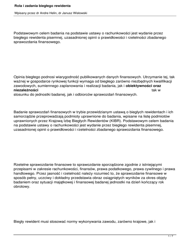 Rola i zadania biegłego rewidenta Wpisany przez dr Andre Helin, dr Janusz Wisłowski Podstawowym celem badania na podstawie ustawy o rachunkowości jest wydanie przez biegłego rewidenta pisemnej, uzasadnionej opinii o prawidłowości i rzetelności zbadanego sprawozdania finansowego. Opinia biegłego podnosi wiarygodność publikowanych danych finansowych. Utrzymanie tej, tak ważnej w gospodarce rynkowej funkcji wymaga od biegłego zarówno niezbędnych kwalifikacji zawodowych, sumiennego zaplanowania i realizacji badania, jak i obiektywności oraz niezależności tak w stosunku do jednostki badanej, jak i odbiorców sprawozdań finansowych. Badanie sprawozdań finansowych w trybie przewidzianym ustawą o biegłych rewidentach i ich samorządzie przeprowadzają podmioty uprawnione do badania, wpisane na listę podmiotów uprawnionych przez Krajową Izbę Biegłych Rewidentów (KIBR). Podstawowym celem badania na podstawie ustawy o rachunkowości jest wydanie przez biegłego rewidenta pisemnej, uzasadnionej opinii o prawidłowości i rzetelności zbadanego sprawozdania finansowego. Rzetelne sprawozdanie finansowe to sprawozdanie sporządzone zgodnie z istniejącymi przepisami w zakresie rachunkowości, finansów, prawa podatkowego, prawa cywilnego i prawa handlowego. Przez jasność i rzetelność należy rozumieć to, że sprawozdanie finansowe w sposób pełny, uczciwy i dokładny przedstawia obraz osiągniętych wyników za okres objęty badaniem oraz sytuacji majątkowej i finansowej badanej jednostki na dzień kończący rok obrotowy. Biegły rewident musi stosować normy wykonywania zawodu, zarówno krajowe, jak i 1/7 Rola i zadania biegłego rewidenta Wpisany przez dr Andre Helin, dr Janusz Wisłowski międzynarodowe. Na wstępie opracowuje plan badania, po czym przystępuje do badania poszczególnych części sprawozdania finansowego, zwanych obszarami badania. Od jakości prac przygotowawczych zależy jakość badania, a także jego efektywność. Odpowiednio opracowane procedury badania systemów kontroli wewnętrznej nie tylko umożliwiają efektywne wykrycie ewentualnych zagrożeń dla jednostki, jak ryzyko oszustw, ale też zapewniają szybkie zbadanie i wyrażenie opinii o rzetelności, prawidłowości i jasności każdego obszaru sprawozdania finansowego oraz prawidłowości ksiąg rachunkowych stanowiących podstawę jego sporządzenia. Warto podkreślić, że za kilkoma akapitami opinii o rzetelności, prawidłowości i jasności sprawozdania finansowego czy kilkoma, kilkunastoma, czy czasem, o ile biegły niepotrzebnie powiela informację z informacji dodatkowej kilkudziesięcioma stronami raportu uzupełniającego opinię z badania sprawozdania finansowego kryje się żmudne i odpowiedzialne badanie wszystkich podstawowych obszarów bilansu oraz rachunku zysków i strat. Oczywiście często zdarza się, że poszczególne obszary są nieistotne i nie wymagają dokładnego badania, ale zawsze należy co najmniej wykonać test na kompletność każdego obszaru, czy przypadkiem nie pominięto istniejących danych, które powinny znaleźć się w tym obszarze, zmieniając jego wartość z nieistotnej na istotną. Tryb badania sprawozdań finansowych Oprócz sprawozdania finansowego biegły rewident ocenia informacje finansowe pochodzące z innych źródeł. Do takich informacji należą: sprawozdanie z działalności jednostki, prospekty emisyjne, publikowane wskaźniki finansowe, plany inwestycyjne i finansowe, sprawozdania GUS oraz wszystkie inne informacje często podawane równolegle z rocznym sprawozdaniem finansowym. W myśl przepisów ustawy o rachunkowości nie są one objęte badaniem biegłego, z wyjątkiem obowiązkowej oceny sprawozdania z działalności jednostki. Biegły powinien jednak co najmniej upewnić się, że informacje te są spójne z danymi sprawozdania finansowego i że w sposób rzetelny odpowiadają aktualnej sytuacji finansowej i możliwościom rozwojowym jednostki. 2/7 Rola i zadania biegłego rewidenta Wpisany przez dr Andre Helin, dr Janusz Wisłowski Biegły rewident, wydając opinię o rzetelności i prawidłowości danych, powinien krytycznie ocenić zastosowane przez przedsiębiorstwo zasady rachunkowości w odniesieniu do charakteru działalności gospodarczej jednostki, wielkości i rodzaju posiadanych zasobów oraz możliwości poprawnej interpretacji sprawozdania finansowego przez szeroki krąg odbiorców, jakimi są akcjonariusze albo udziałowcy, instytucje finansowe, kontrahenci, organy podatkowe. Praktyka zawodowa, jak też procedury korporacyjne BDO pozwoliły na wypracowanie szeregu metod i technik badania, które w sposób racjonalny, poprzez ograniczoną, reprezentatywną kontrolę, stwarzają podstawę do wydania uzasadnionej opinii o całości danych finansowych. Planując badanie sprawozdania finansowego oraz później, już w trakcie badania, biegły rewident ocenia wdrożone przez jednostkę systemy rachunkowości i kontroli wewnętrznej. Ich ocena jest wykorzystana m.in. przy wyborze metod i technik badania oraz zakresu wybieranych próbek przy badaniu metodą reprezentatywną. Sumienna realizacja badania zakłada, że biegły podczas badania wykorzystuje właśnie te techniki i metody badania, które najbardziej odpowiadają zakresowi i charakterowi działalności jednostki oraz jej strukturze organizacyjnej. Żadne metody i techniki badania nie gwarantują jednak wykrycia wszystkich nieprawidłowości. Potwierdzenie zakresu badania podkreśla nieograniczony dostęp biegłego do wszystkich istotnych informacji, jakie biegły samodzielnie i niezależnie wybrał, twierdząc, że są niezbędne do wypełnienia jego funkcji. Biegły rewident powinien tak zaplanować swoją pracę, aby umożliwić przeprowadzenie badania sprawozdania finansowego w sposób efektywny i w odpowiednim czasie. Tryb badania sprawozdań finansowych można logicznie i chronologicznie podzielić na następujące obszary: 3/7 Rola i zadania biegłeg