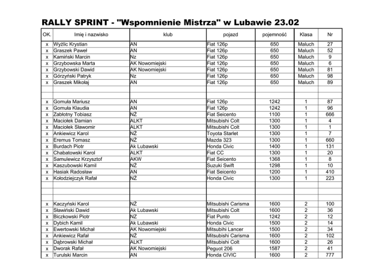 RALLY SPRINT - "Wspomnienie Mistrza" w Lubawie 23.02 OK. Imię i nazwisko klub pojazd pojemność Klasa Nr x x x x x x x Wyżlic Krystian Graszek Paweł Kamiński Marcin Grzybowska Marta Grzybowski Dawid Górzyński Patryk Graszek Mikołaj AN AN Nz AK Nowomiejski AK Nowomiejski Nz AN Fiat 126p Fiat 126p Fiat 126p Fiat 126p Fiat 126p Fiat 126p Fiat 126p 650 650 650 650 650 650 650 Maluch Maluch Maluch Maluch Maluch Maluch Maluch 27 52 9 6 81 98 89 x x x x x x x x x x x x x Gomuła Mariusz Gomuła Klaudia Zabłotny Tobiasz Maciołek Damian Maciołek Sławomir Ankiewicz Karol Eremus Tomasz Burdach Piotr Chabatowski Karol Samulewicz Krzysztof Kaszubowski Kamil Hasiak Radosław Kołodziejczyk Rafał AN AN NŻ ALKT ALKT NŻ NŻ Ak Lubawski ALKT AKW NŻ AN NŻ Fiat 126p Fiat 126p Fiat Seicento Mitsubishi Colt Mitsubishi Colt Toyota Starlet Mazda 323 Honda Civic Fiat CC Fiat Seicento Suzuki Swift Fiat Seicento Honda Civic 1242 1242 1100 1300 1300 1300 1300 1400 1300 1368 1298 1200 1300 1 1 1 1 1 1 1 1 1 1 1 1 1 87 96 666 4 1 7 660 131 20 8 10 410 223 x x x x x x x x x Kaczyński Karol Sławiński Dawid Biczkowski Piotr Dybich Kamil Ewertowski Michał Ankiewicz Rafał Dąbrowski Michał Dworak Rafał Turulski Marcin NŻ Ak Lubawski NZ Ak Lubawski AK Nowomiejski NŻ ALKT AK Nowomiejski AN Mitsubishi Carisma Mitsubishi Colt Fiat Punto Honda Civic Mitsubihi Lancer Mitsubishi Carisma Mitsubishi Colt Peguot 206 Honda CIVIC 1600 1600 1242 1500 1500 1600 1600 1587 1600 2 2 2 2 2 2 2 2 2 100 36 12 14 34 102 26 41 777 x x Łukaszewski Sławomir Włodarczyk Marek ALKT AN Mitsubishi Colt Honda Civic 1600 1595 2 2 140 25 x x x x x x x Patan Tomasz Kozłowski Krzysztof Kozłowski Radosław Trojanowski Hubert Kubat Iwona Szejerka Dariusz Szejerka Andrzej Nz AN AN Nz Nz AN Nz BMW Ford Fiesta Ford Fiesta Opel kadet Peugeot 205 Honda CIVIC Honda CIVIC 1796 1998 1998 1998 1900 1800 1800 3 3 3 3 3 3 3 29 70 44 35 13 11 77 x x x x x Klemm Eligiusz Krawiecki Mateusz Olejnik Krystian Derewońko Marcin Pniewski Tomasz OKM ALKT Nz Nz AN Subaru Impreza Subaru Impreza Toyota Celica Polonez 2000 Mitsubshii Evo 2500 1998 2000 2000 2000 4 4 4 4 4 177 18 2999 28 98 RALLY SPRINT - "Wspomnienie Mistrza" w Lubawie 23.02 Imię i nazwisko x Wyżlic Krystian Graszek Paweł Kamiński Marcin Grzybowska Marta Grzybowski Dawid Górzyński Patryk Graszek Mikołaj ok x x x x x x x 0 0 x x x x x x x x x x x x x 0 0 Gomuła Mariusz Gomuła Klaudia Zabłotny Tobiasz Maciołek Damian Maciołek Sławomir Ankiewicz Karol Eremus Tomasz Burdach Piotr Chabatowski Karol Samulewicz Krzysztof Kaszubowski Kamil Hasiak Radosław Kołodziejczyk Rafał 0 0 0 x x x x x x x x x x x 0 0 0 Kaczyński Karol Sławiński Dawid Biczkowski Piotr Dybich Kamil Ewertowski Michał Ankiewicz Rafał Dąbrowski Michał Dworak Rafał Turulski Marcin Łukaszewski Sławomir Włodarczyk Marek 0 0 0 0 Klasa xx Maluch Maluch Maluch Maluch Maluch Maluch Maluch 0 0 1 1 1 1 1 1 1 1 1 1 1 1 1 0 0 0 2 2 2 2 2 2 2 2 2 2 2 0 0 Nr x 27 52 9 6 81 98 89 0 0 87 96 666 4 1 7 660 131 20 8 10 410 223 0 0 0 100 36 12 14 34 102 26 41 777 140 25 0 0 1 czas 60,920 64,320 131,100 131,100 61,520 59,700 59,080 62,620 55,830 54,430 59,720 62,750 58,300 60,380 64,130 60,870 61,850 54,440 61,250 63,000 57,220 58,980 2 taryfa czas 3 taryfa czas 60,010 66,810 68,850 61,530 76,340 132,730 65,940 64,900 69,880 60,780 59,350 73,720 60,250 59,990 59,890 58,790 64,020 57,290 55,880 60,210 60,660 132,730 59,530 65,130 60,710 61,440 61,090 60,960 59,270 63,880 63,130 62,980 58,630 59,780 60,910 63,700 58,380 61,440 62,600 57,550 59,840 4 taryfa czas 5 taryfa czas 6 taryfa czas taryfa SUMA Miejsce Miejsce w x w klasie generalce 120,930 I 130,260 III 131,710 138,730 122,310 II 207,440 263,830 0,000 0,000 118,880 138,850 121,770 119,770 119,590 117,870 126,640 113,120 II 110,310 I 121,120 120,380 259,180 116,680 III 0,000 0,000 0,000 121,800 122,400 119,650 128,010 124,000 124,830 113,070 I 122,690 125,600 114,770 II 118,820 III 0,000 0,000 RALLY SPRINT - "Wspomnienie Mistrza" w Lubawie 23.02 Imię i nazwisko x ok 0 0 x x x x x x x 0 0 Patan Tomasz Kozłowski Krzysztof Kozłowski Radosław Trojanowski Hubert Kubat Iwona Szejerka Dariusz Szejerka Andrzej 0 0 0 x x x x x x x x 0 0 0 Klemm Eligiusz Krawiecki Mateusz Olejnik Krystian Derewońko Marcin Pniewski Tomasz Łazarewicz Grzegorz Kwiatkowski Marek Kurp Marcin 0 0 0 0 0 0 0 0 0 0 0 0 0 0 0 0 0 0 0 0 0 0 0 0 0 0 0 0 0 0 0 0 0 0 0 0 Klasa xx 0 0 3 3 3 3 3 3 3 0 0 0 4 4 4 4 4 4 4 4 0 0 0 0 0 0 0 0 0 0 0 0 0 0 0 0 0 0 Nr x 0 0 29 70 44 35 13 11 77 0 0 0 177 18 2999 28 98 33 42 17 0 0 0 0 0 0 0 0 0 0 0 0 0 0 0 0 0 0 1 czas 68,050 58,660 59,880 64,650 64,410 55,880 60,060 60,090 70,760 58,760 52,440 2 taryfa czas 63,970 59,190 58,790 67,140 58,120 64,510 3 taryfa czas 62,750 58,950 57,560 60,510 65,560 59,440 65,640 59,130 60,800 60,110 85,910 59,910 54,090 56,720 61,060 56,530 52,720 4 taryfa czas 5 taryfa czas 6 taryfa czas taryfa SUMA Miejsce Miejsce w x w klasie generalce 0,000 0,000 194,770 118,140 III 116,220 I 179,180 197,350 117,560 II 194,560 0,000 0,000 0,000 115,010 120,860 120,200 156,670 120,970 112,850 II 113,250 III 105,160 I 0,000 0,000 0,000 0,000 0,000 0,000 0,000 0,000 0,000 0,000 0,000 0,000 0,000 0,000 0,000 0,000 0,000 0,000