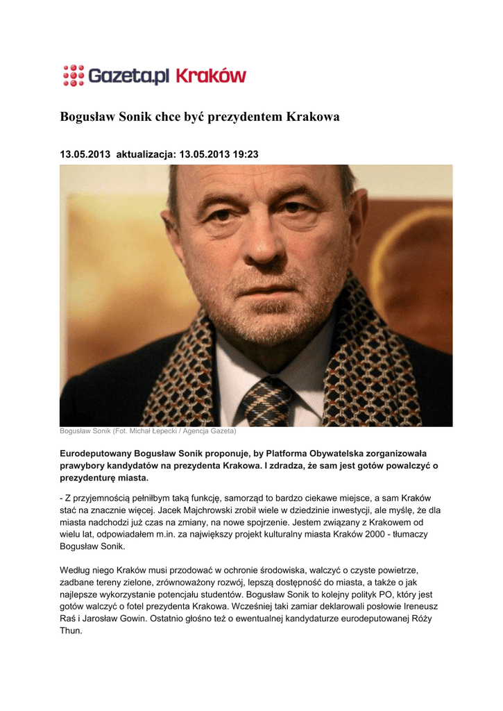 Bogusław Sonik chce być prezydentem Krakowa 13.05.2013 aktualizacja: 13.05.2013 19:23 Bogusław Sonik (Fot. Michał Łepecki / Agencja Gazeta) Eurodeputowany Bogusław Sonik proponuje, by Platforma Obywatelska zorganizowała prawybory kandydatów na prezydenta Krakowa. I zdradza, że sam jest gotów powalczyć o prezydenturę miasta. - Z przyjemnością pełniłbym taką funkcję, samorząd to bardzo ciekawe miejsce, a sam Kraków stać na znacznie więcej. Jacek Majchrowski zrobił wiele w dziedzinie inwestycji, ale myślę, że dla miasta nadchodzi już czas na zmiany, na nowe spojrzenie. Jestem związany z Krakowem od wielu lat, odpowiadałem m.in. za największy projekt kulturalny miasta Kraków 2000 - tłumaczy Bogusław Sonik. Według niego Kraków musi przodować w ochronie środowiska, walczyć o czyste powietrze, zadbane tereny zielone, zrównoważony rozwój, lepszą dostępność do miasta, a także o jak najlepsze wykorzystanie potencjału studentów. Bogusław Sonik to kolejny polityk PO, który jest gotów walczyć o fotel prezydenta Krakowa. Wcześniej taki zamiar deklarowali posłowie Ireneusz Raś i Jarosław Gowin. Ostatnio głośno też o ewentualnej kandydaturze eurodeputowanej Róży Thun. Cały tekst: http://krakow.gazeta.pl/krakow/1,44425,13903582,Boguslaw_Sonik_chce_byc_prezydentem_Krakowa.html#LokK rakTxt#ixzz2TG5Oeohj