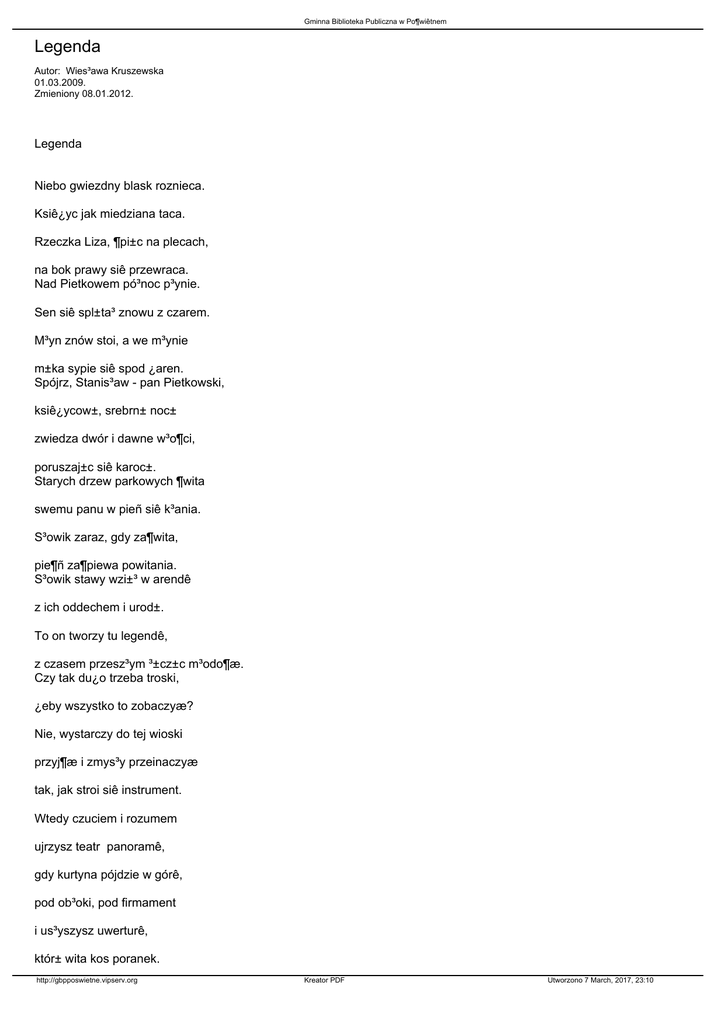 Gminna Biblioteka Publiczna w Po¶wiêtnem Legenda Autor: Wies³awa Kruszewska 01.03.2009. Zmieniony 08.01.2012. Legenda Niebo gwiezdny blask roznieca. Ksiê¿yc jak miedziana taca. Rzeczka Liza, ¶pi±c na plecach, na bok prawy siê przewraca. Nad Pietkowem pó³noc p³ynie. Sen siê spl±ta³ znowu z czarem. M³yn znów stoi, a we m³ynie m±ka sypie siê spod ¿aren. Spójrz, Stanis³aw - pan Pietkowski, ksiê¿ycow±, srebrn± noc± zwiedza dwór i dawne w³o¶ci, poruszaj±c siê karoc±. Starych drzew parkowych ¶wita swemu panu w pieñ siê k³ania. S³owik zaraz, gdy za¶wita, pie¶ñ za¶piewa powitania. S³owik stawy wzi±³ w arendê z ich oddechem i urod±. To on tworzy tu legendê, z czasem przesz³ym ³±cz±c m³odo¶æ. Czy tak du¿o trzeba troski, ¿eby wszystko to zobaczyæ? Nie, wystarczy do tej wioski przyj¶æ i zmys³y przeinaczyæ tak, jak stroi siê instrument. Wtedy czuciem i rozumem ujrzysz teatr panoramê, gdy kurtyna pójdzie w górê, pod ob³oki, pod firmament i us³yszysz uwerturê, któr± wita kos poranek. http://gbpposwietne.vipserv.org Kreator PDF Utworzono 7 March, 2017, 23:10 Gminna Biblioteka Publiczna w Po¶wiêtnem Wtedy powiesz, id±c mostem: - Jakie to jest wszystko proste! http://gbpposwietne.vipserv.org Kreator PDF Utworzono 7 March, 2017, 23:10