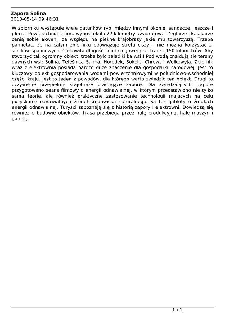 Zapora Solina 2010-05-14 09:46:31 W zbiorniku występuje wiele gatunków ryb, między innymi okonie, sandacze, leszcze i płocie. Powierzchnia jeziora wynosi około 22 kilometry kwadratowe. Żeglarze i kajakarze cenią sobie akwen, ze względu na piękne krajobrazy jakie mu towarzyszą. Trzeba pamiętać, że na całym zbiorniku obowiązuje strefa ciszy – nie można korzystać z silników spalinowych. Całkowita długość linii brzegowej przekracza 150 kilometrów. Aby stworzyć tak ogromny obiekt, trzeba było zalać kilka wsi ! Pod wodą znajdują się tereny dawnych wsi: Solina, Teleśnica Sanna, Horodek, Sokole, Chrewt i Wołkowyja. Zbiornik wraz z elektrownią posiada bardzo duże znaczenie dla gospodarki narodowej. Jest to kluczowy obiekt gospodarowania wodami powierzchniowymi w południowo-wschodniej części kraju. Jest to jeden z powodów, dla którego warto zwiedzić ten obiekt. Drugi to oczywiście przepiękne krajobrazy otaczające zaporę. Dla zwiedzających zaporę przygotowano seans filmowy o energii odnawialnej, w którym przedstawiono nie tylko samą teorię, ale również praktyczne zastosowanie technologii mających na celu pozyskanie odnawialnych źródeł środowiska naturalnego. Są też gabloty o źródłach energii odnawialnej. Turyści zapoznają się z historią zapory i elektrowni. Dowiedzą się również o budowie obiektów. Trasa przebiega przez halę produkcyjną, halę maszyn i galerię. 1/1